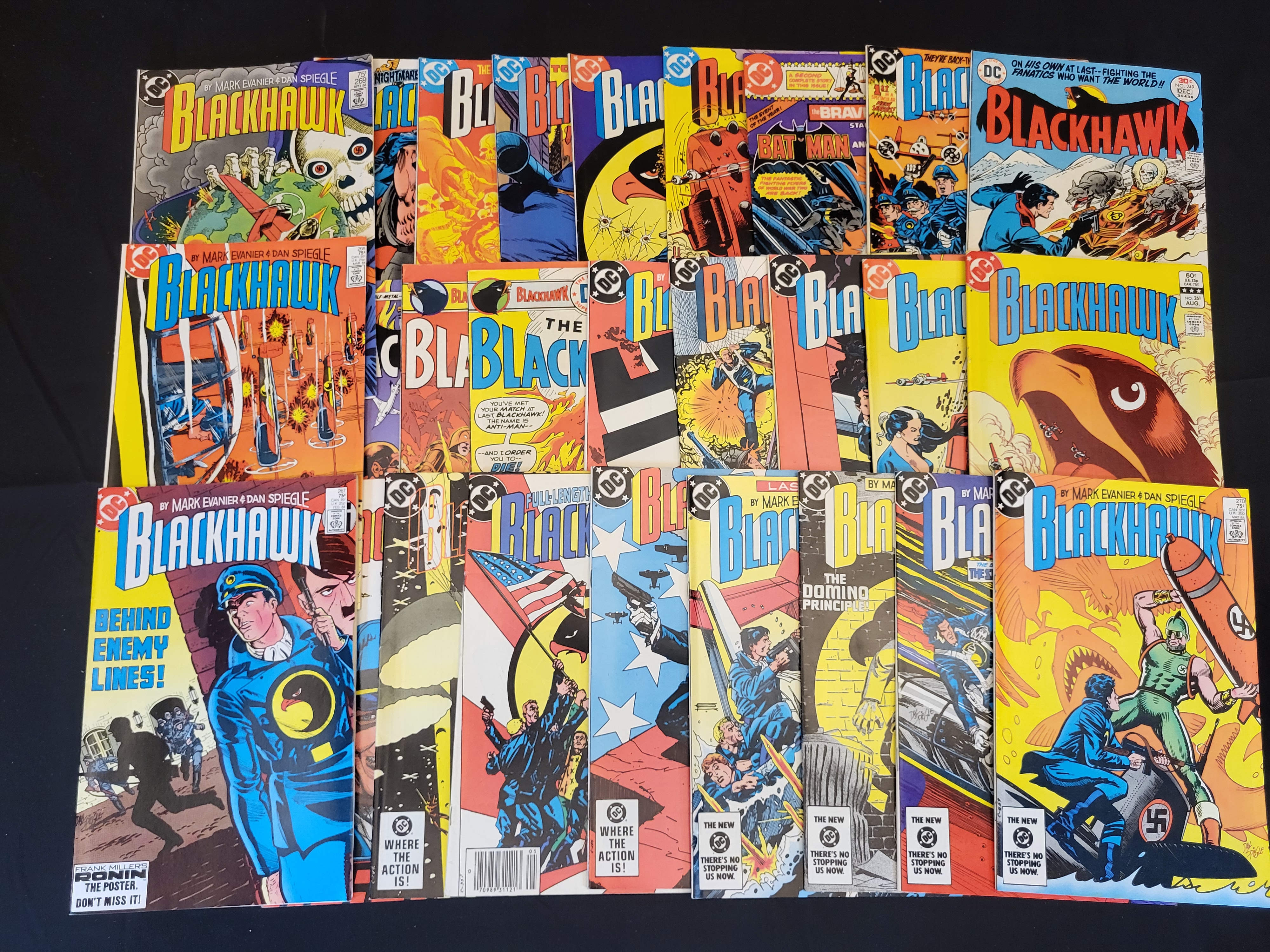 BID PER WHAT YOU SEE IN THE PHOTO, NOT THE AI GENERATED TITLES AND DESCRIPTIONS! A collection of DC Comics Blackhawk comic books primarily from the late 1970s and early 1980s. The group includes multiple issues from the 1982 relaunch featuring the creative work of writer Mark Evanier and artist Dan Spiegle. Visible issue numbers include 249, 251, 261, 268, 269, 270, 271, and 272, which is designated as the Last Issue. Also included is an issue of The Brave and the Bold featuring a team-up between Batman and the Blackhawks. The cover art depicts various World War II action scenes, with certain issues featuring period-specific iconography and German text such as Sieg Um Jeden Preis. The comics are standard staple-bound newsstand and direct market editions with color illustrations on paper stock.