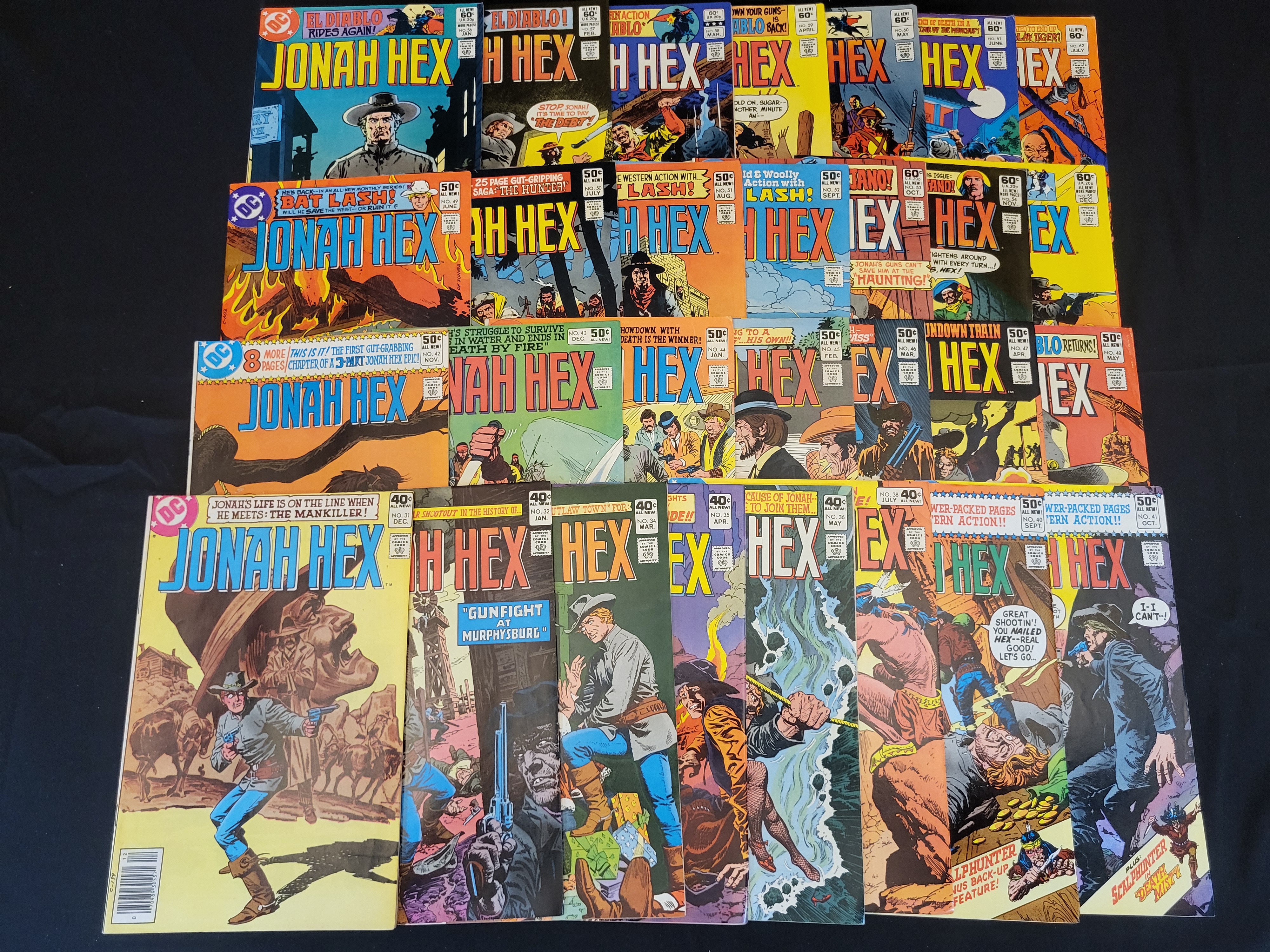 BID PER WHAT YOU SEE IN THE PHOTO, NOT THE AI GENERATED TITLES AND DESCRIPTIONS! This collection consists of multiple DC Comics Jonah Hex series booklets dating from the late 1970s to the early 1980s. These Bronze Age publications feature issue numbers primarily ranging from No. 31 through No. 62. The items are constructed as stapled paper booklets with original cover prices of 40, 50, and 60 cents. The cover art depicts various Western-themed scenes and includes story titles such as Gunfight at Murphysburg and El Diablo Rides Again!