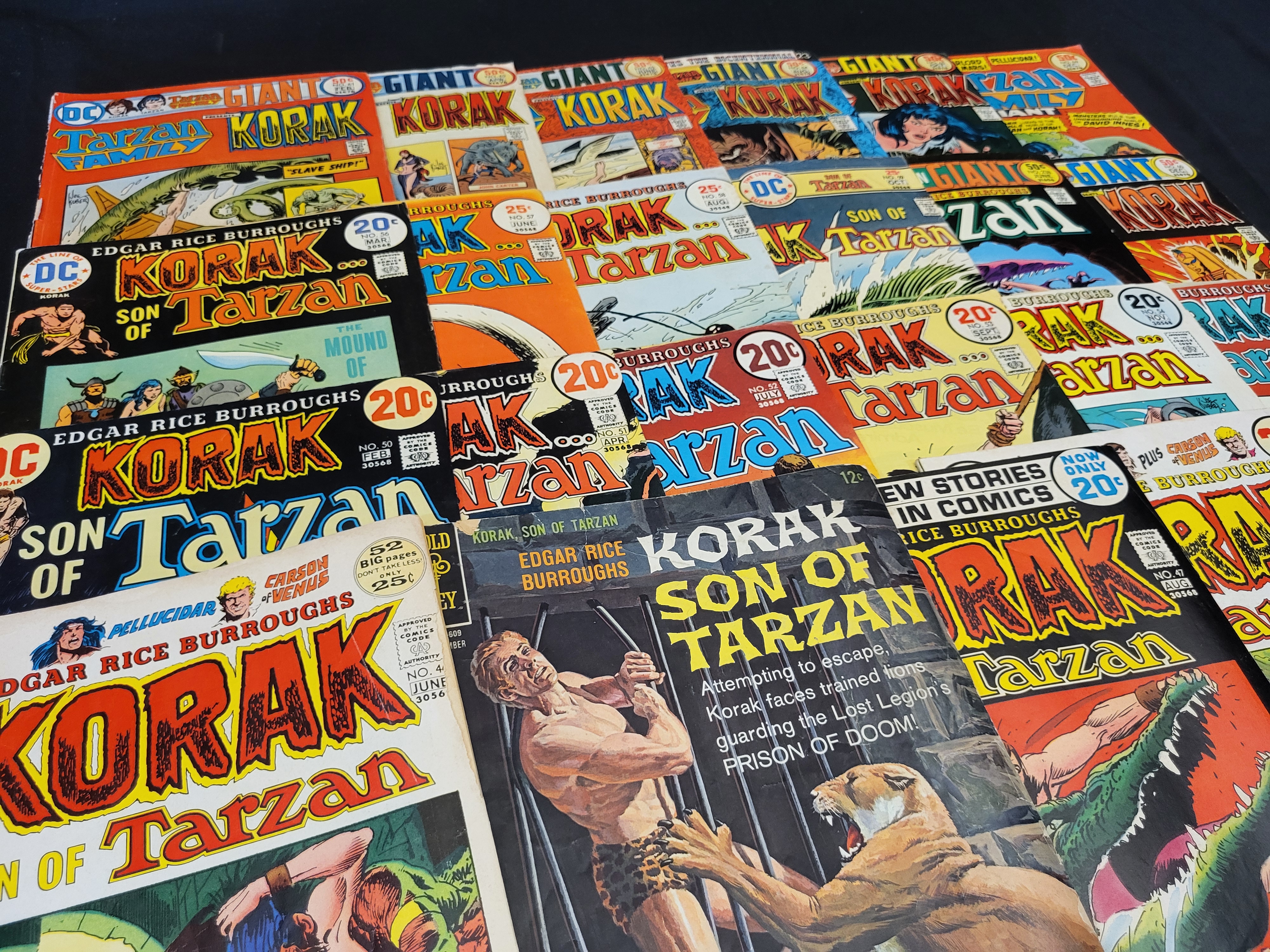 BID PER WHAT YOU SEE IN THE PHOTO, NOT THE AI GENERATED TITLES AND DESCRIPTIONS! A collection of vintage comic books featuring titles based on the works of Edgar Rice Burroughs, primarily Korak, Son of Tarzan and Tarzan Family. The group includes issues published by DC Comics and Gold Key (Western Publishing) dating from the late 1960s through the mid-1970s, spanning the late Silver Age and Bronze Age. Notable inclusions are Korak, Son of Tarzan number 46, which marks the first issue published by DC Comics, and several Giant size editions. The stories frequently feature crossover characters and settings from the Burroughs universe, including Pellucidar, Carson of Venus, and John Carter of Mars. Cover prices range from 12 cents to 50 cents. The comics are printed on standard newsprint with illustrated covers.