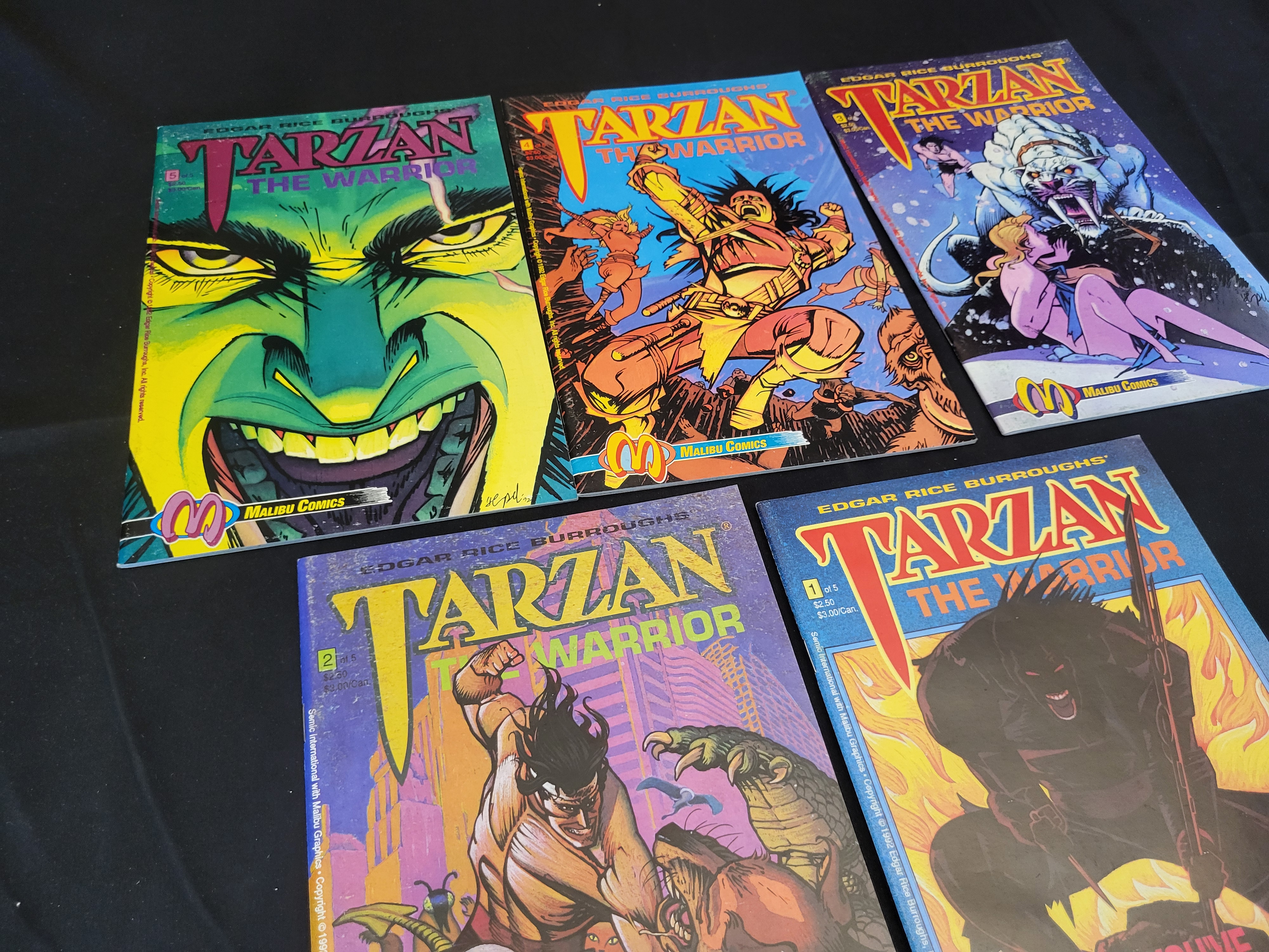 BID PER WHAT YOU SEE IN THE PHOTO, NOT THE AI GENERATED TITLES AND DESCRIPTIONS! A set of comic books from the series titled Edgar Rice Burroughs Tarzan The Warrior, published by Malibu Comics in 1992. The collection includes issues 1, 2, 3, 4, and 5. Each issue features color-saturated cover illustrations and includes the series title, issue number, and original pricing in both U.S. and Canadian currency. The Malibu Comics logo is located on the lower left corner of each cover. The items are constructed of stapled paper with illustrated covers.