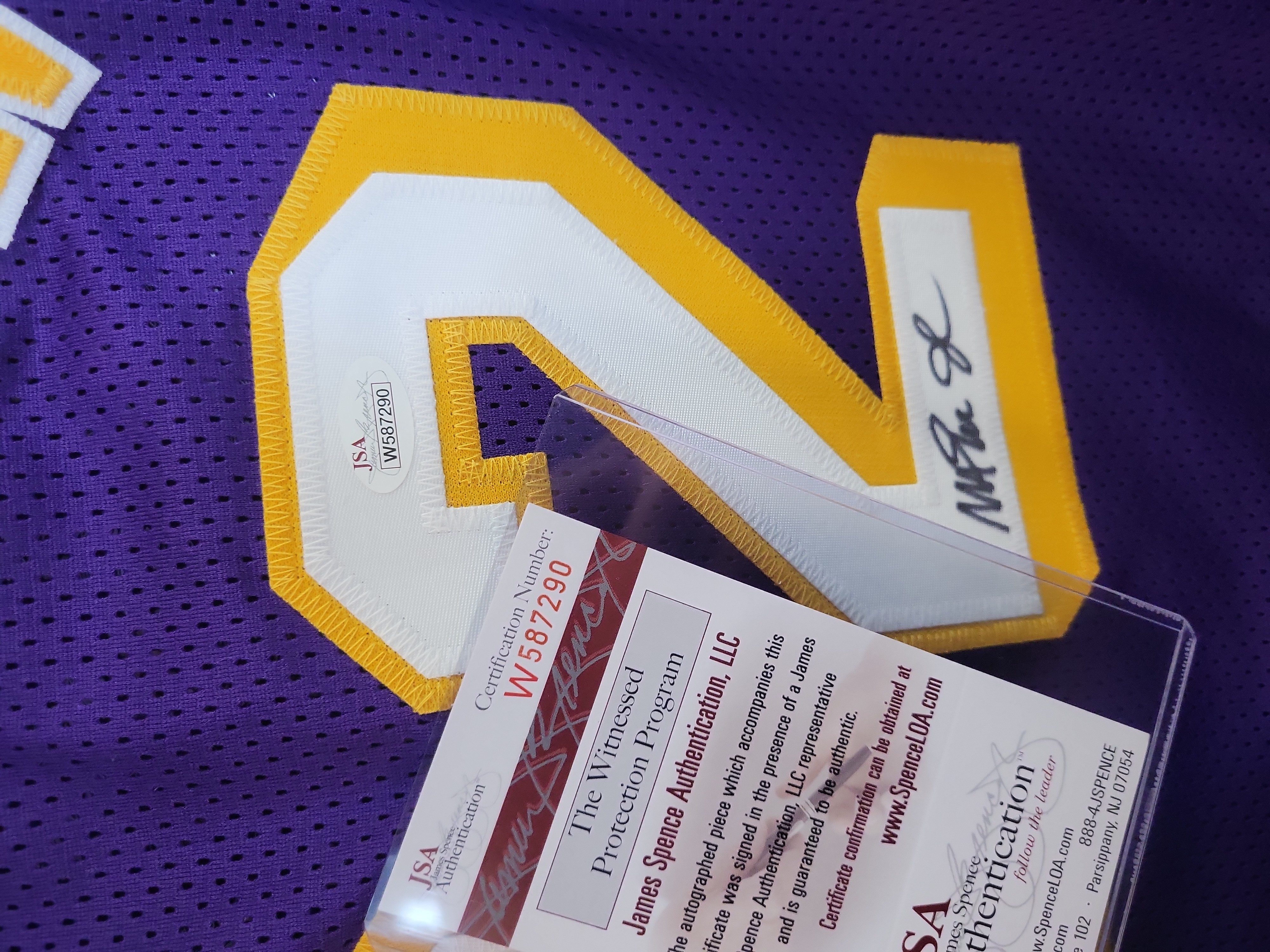 This lot features a purple Los Angeles Lakers "away" style mesh jersey signed by NBA legend Earvin "Magic" Johnson. The jersey is a special commemorative edition featuring Johnson’s name and iconic number "32" in three-color tackle twill. To the right of the rear number, the jersey is intricately embroidered in white thread with Johnson’s career milestones and accolades, including 17,707 career points, 10,141 career assists, 6,559 career rebounds, 12-time NBA All-Star, 5-time NBA Champion, 3-time NBA MVP, and his 2002 Hall of Fame induction. Magic Johnson has signed his name in bold black felt-tip marker on the white fabric of the "2" in his jersey number. The signature is authenticated by James Spence Authentication (JSA) under their "Witnessed Protection Program, " indicating the autograph was signed in the presence of a JSA representative. The item includes a matching tamper-proof hologram sticker (W587290) on the jersey and the corresponding Certificate of Authenticity (COA) card.