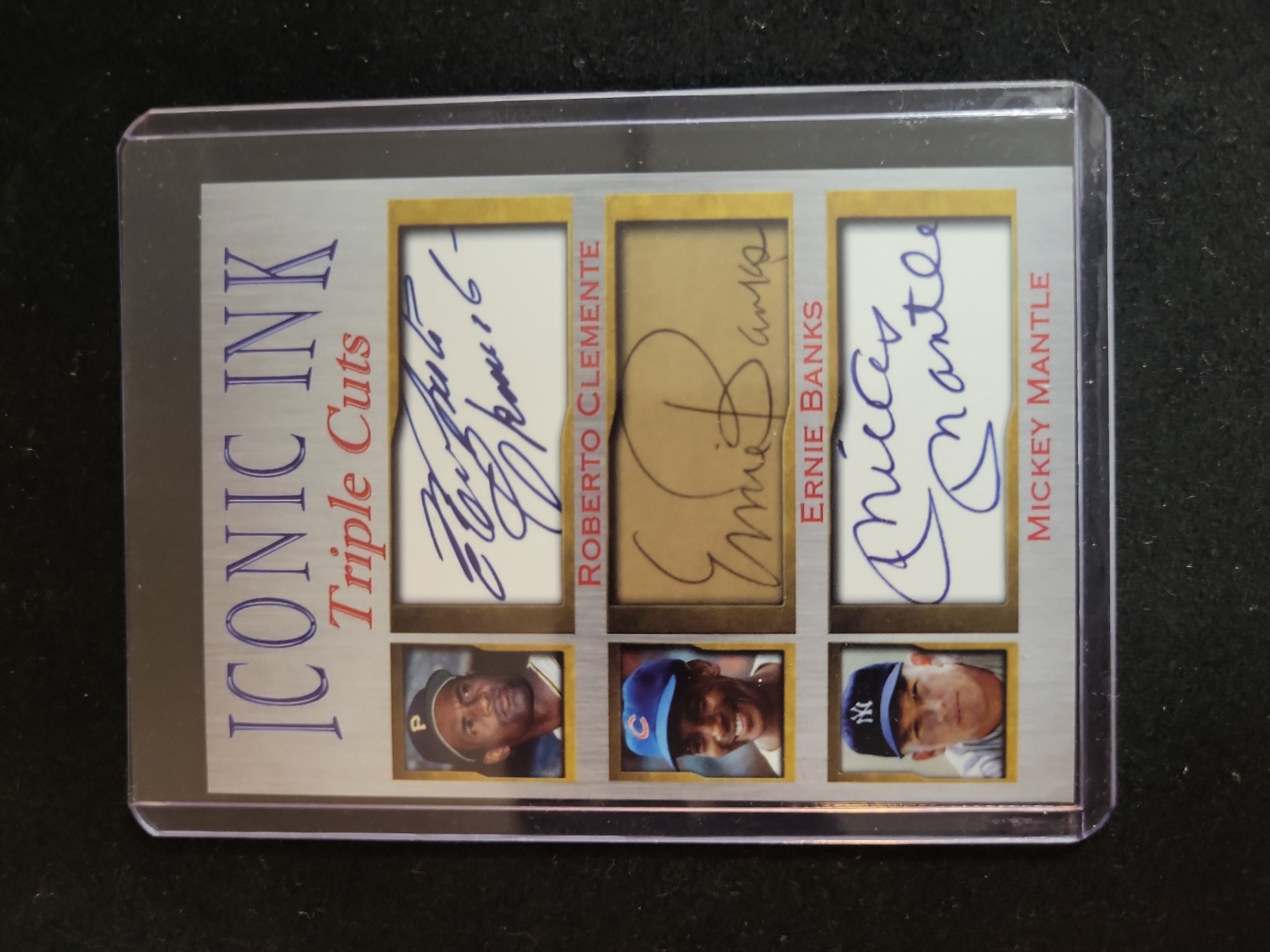 BID PER WHAT YOU SEE IN THE PHOTO, NOT THE AI GENERATED TITLES AND DESCRIPTIONS! Modern Iconic Ink Roberto Clemente, Ernie Banks, Mickey Mantle Triple Cuts Facsimile Signature Card, Ungraded