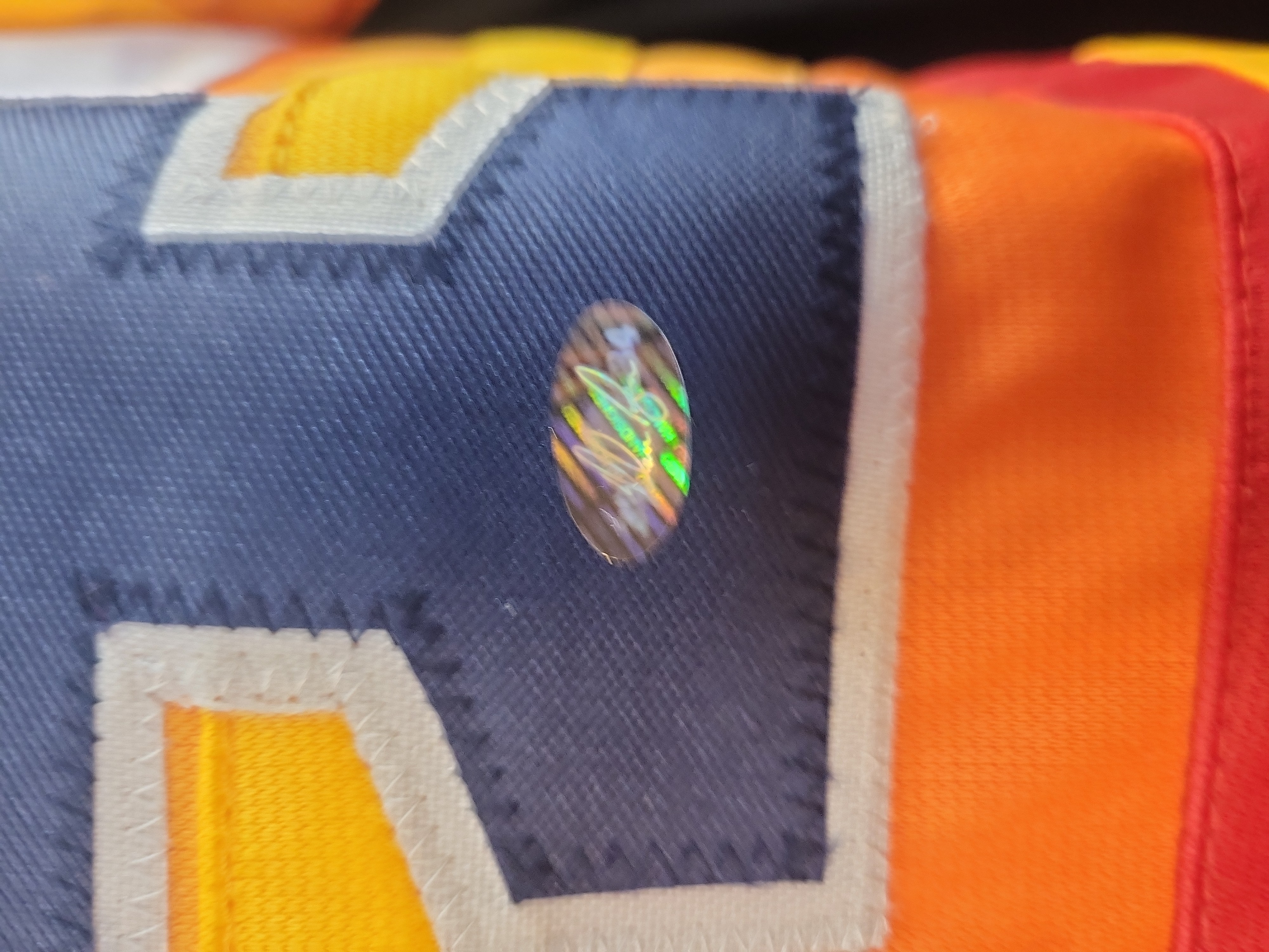 The jersey is in excellent, unworn condition. The rainbow stripe colors remain vibrant, and the tackle twill embroidery is crisp and secure. The signature is clear, well-placed, and shows no signs of fading or smudging.