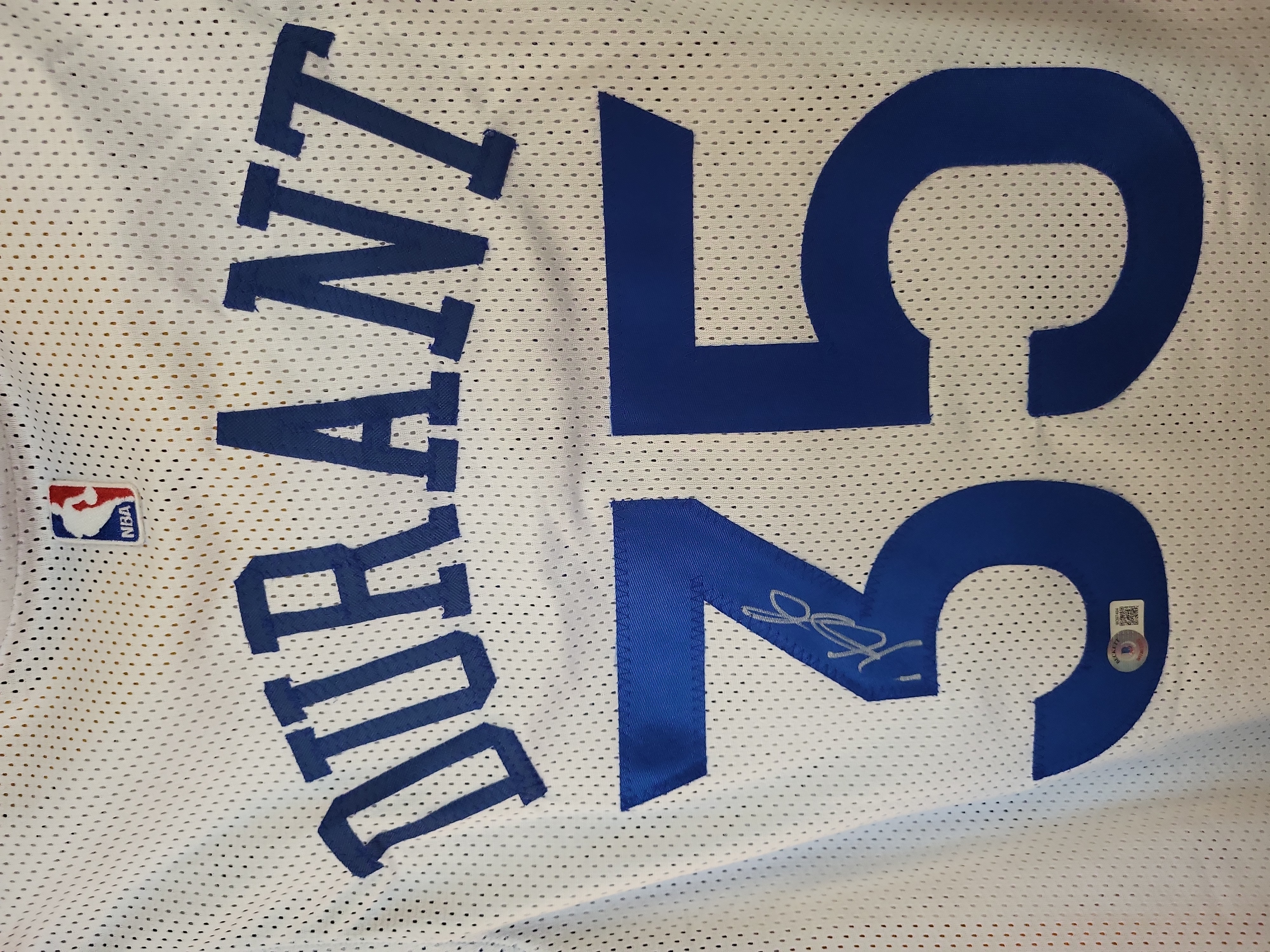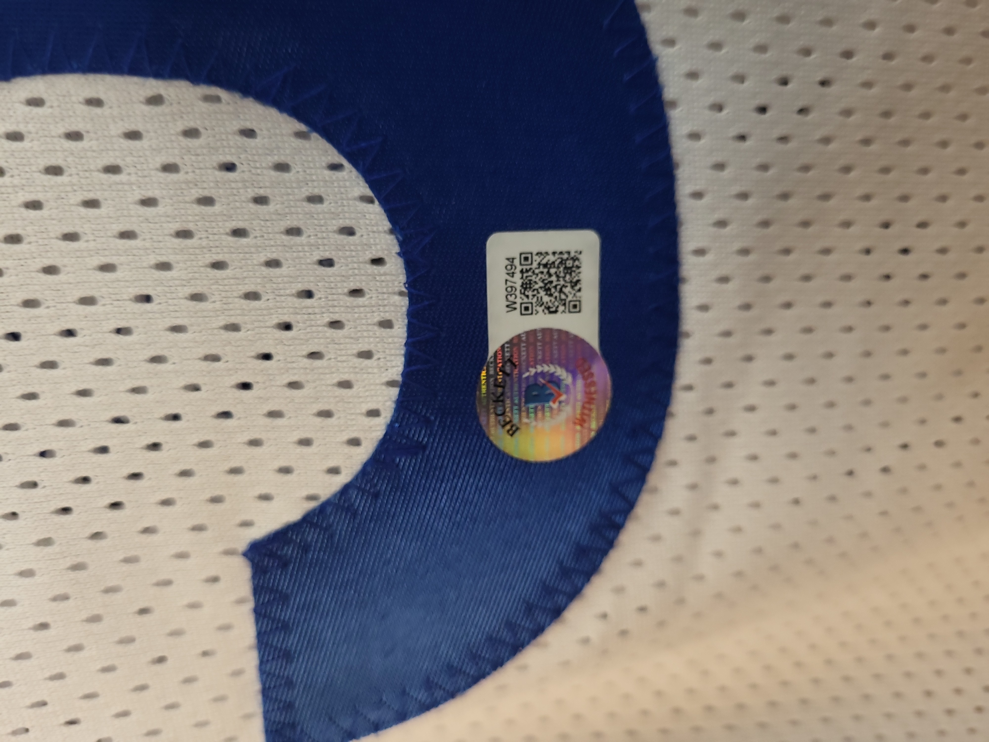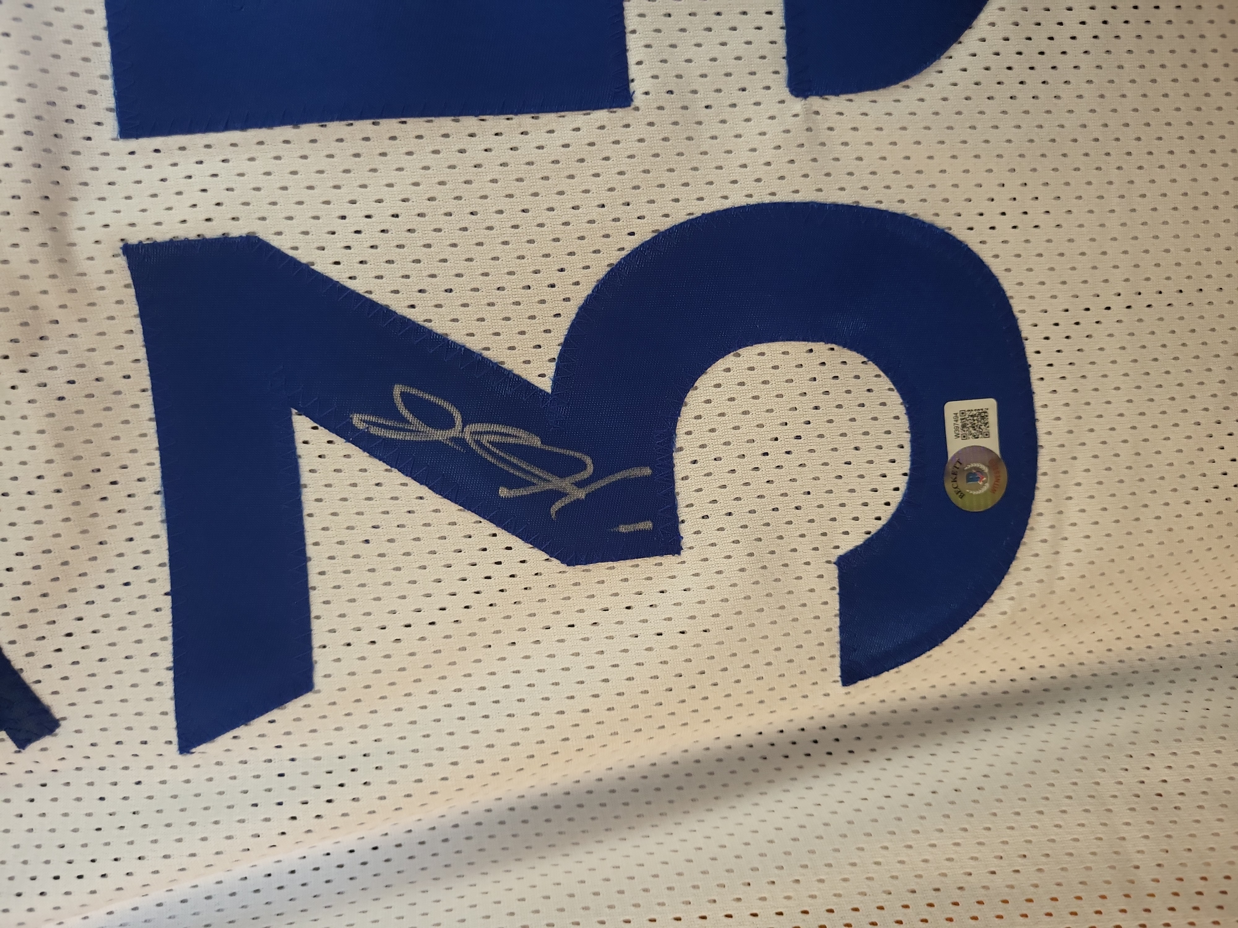 The jersey is in excellent condition with no visible staining, tears, or fraying. The silver metallic signature is bold and clear with no signs of fading or smudging. The tackle twill numbering and lettering remain crisp and securely attached.