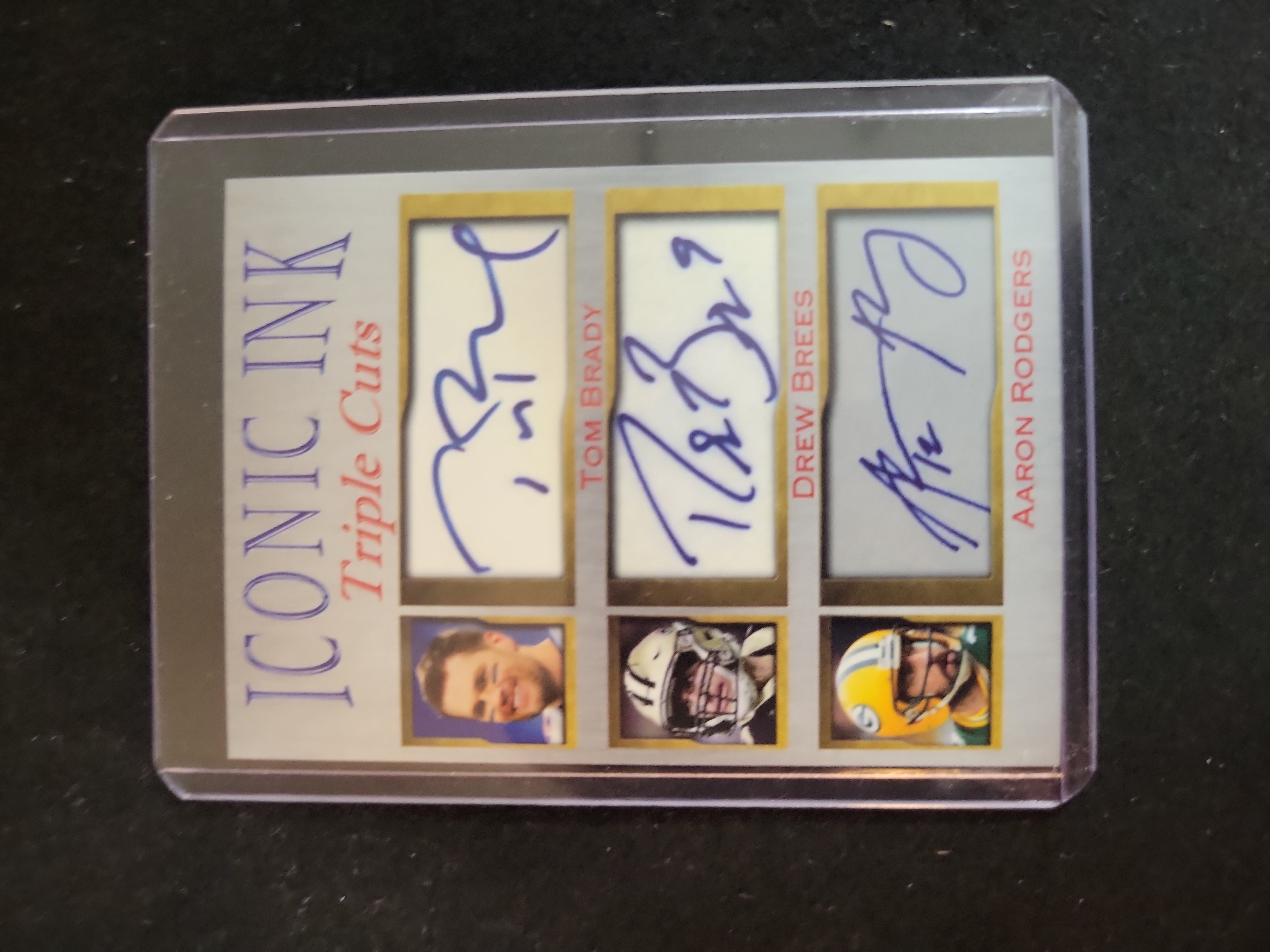 BID PER WHAT YOU SEE IN THE PHOTO, NOT THE AI GENERATED TITLES AND DESCRIPTIONS! Undated Iconic Ink Triple Cuts Tom Brady, Drew Brees, and Aaron Rodgers Facsimile Autograph Card