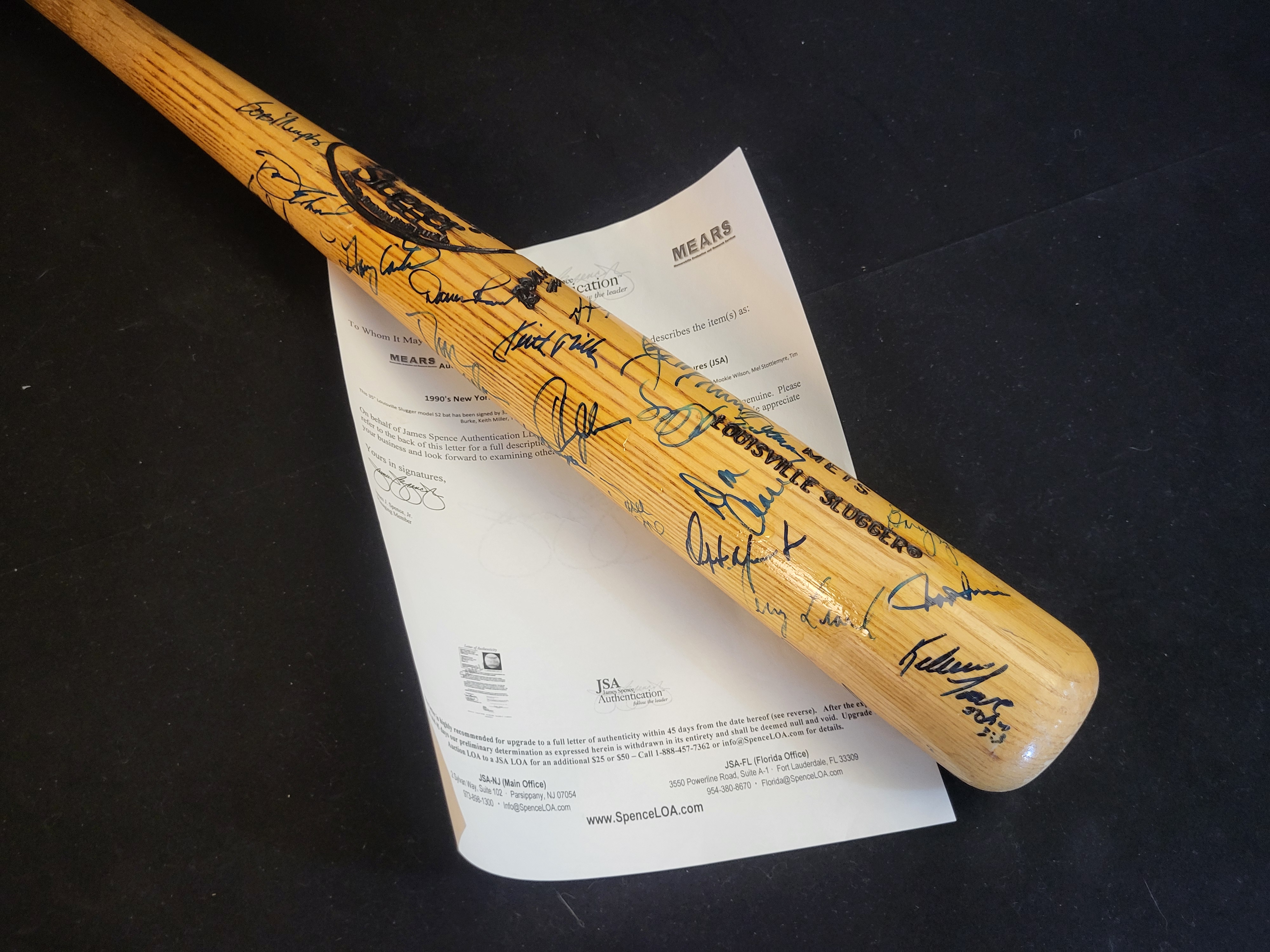 This 1990s New York Mets team-signed memorabilia piece consists of a Louisville Slugger model S2 baseball bat. The natural-grain wood bat features a clear finish and is marked with GENUINE S2, METS, and LOUISVILLE SLUGGER in black block lettering, along with a stylized Powerized logo near the center of the barrel. The surface is covered with 35 player and staff signatures hand-written in blue ink. Identified signatures include Gary Carter, Mookie Wilson, Davey Johnson, Frank Viola, Wally Whitehurst, Terry Leach, Keith Miller, and Tim Burke. The lot is accompanied by a preliminary letter of authenticity from James Spence Authentication (JSA) and MEARS, dated November 3, 2012.