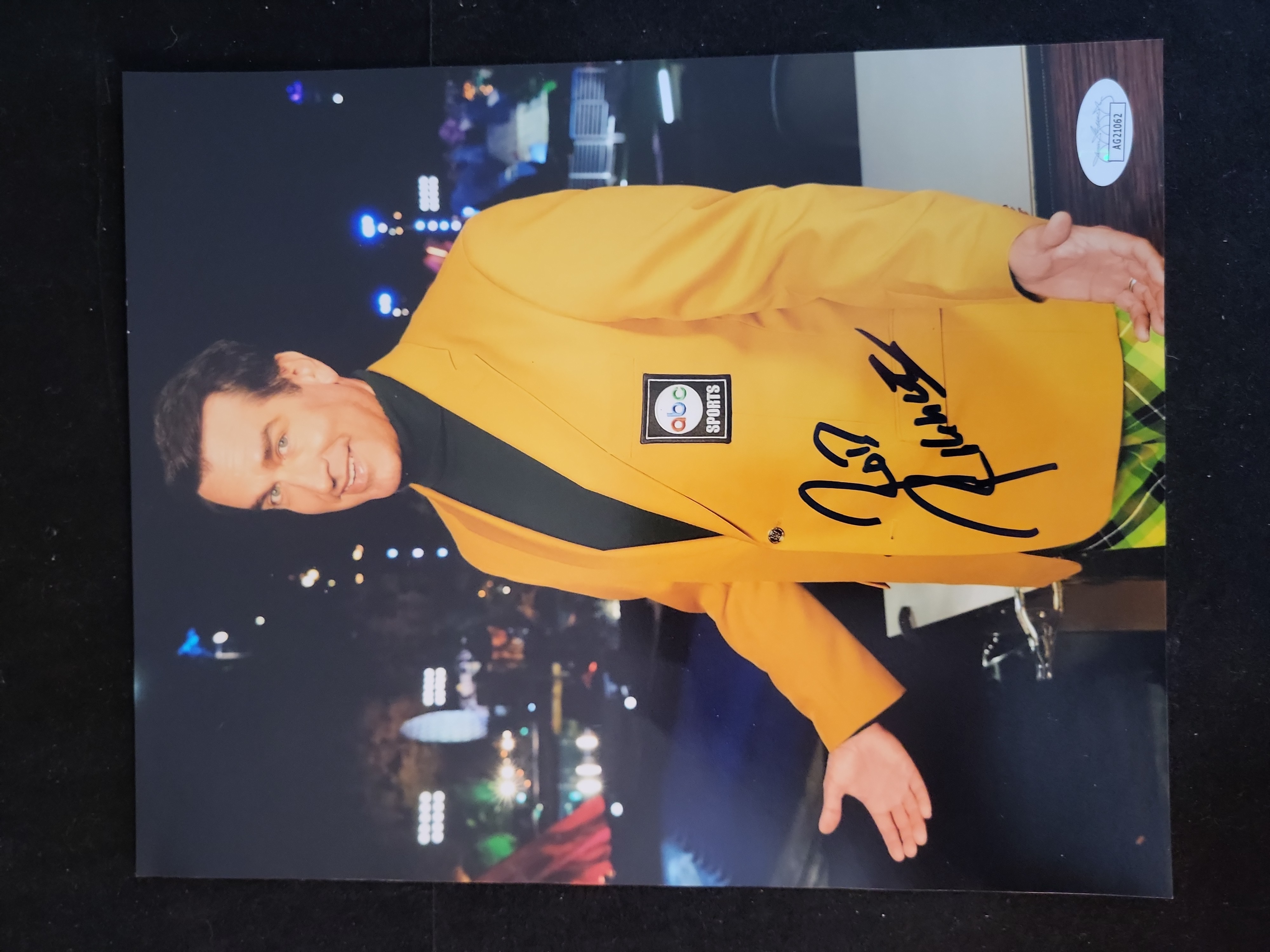 This professional color photograph features the legendary comedian Rob Riggle. Riggle is depicted wearing the distinctive yellow abc SPORTS blazer. The item is signed by Riggle in bold black felt-tip marker across the chest. This autograph is authenticated under the James Spence Authentication (JSA) Witnessed Protection Program, which verifies that a JSA representative was present at the time of signing. The JSA certification sticker with serial number AG21062 is located in the upper right corner of the photograph. Riggle remains a highly collectible figure in the comedy and film memorabilia market.