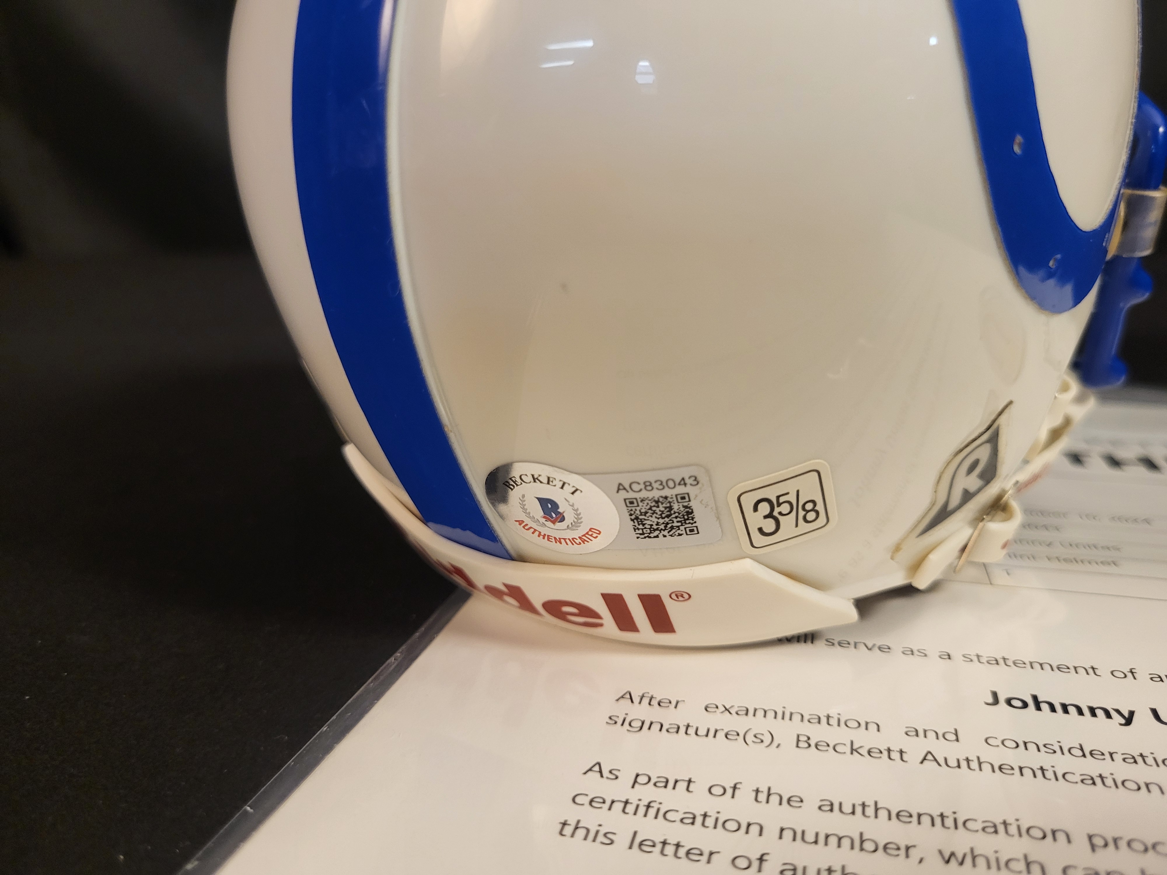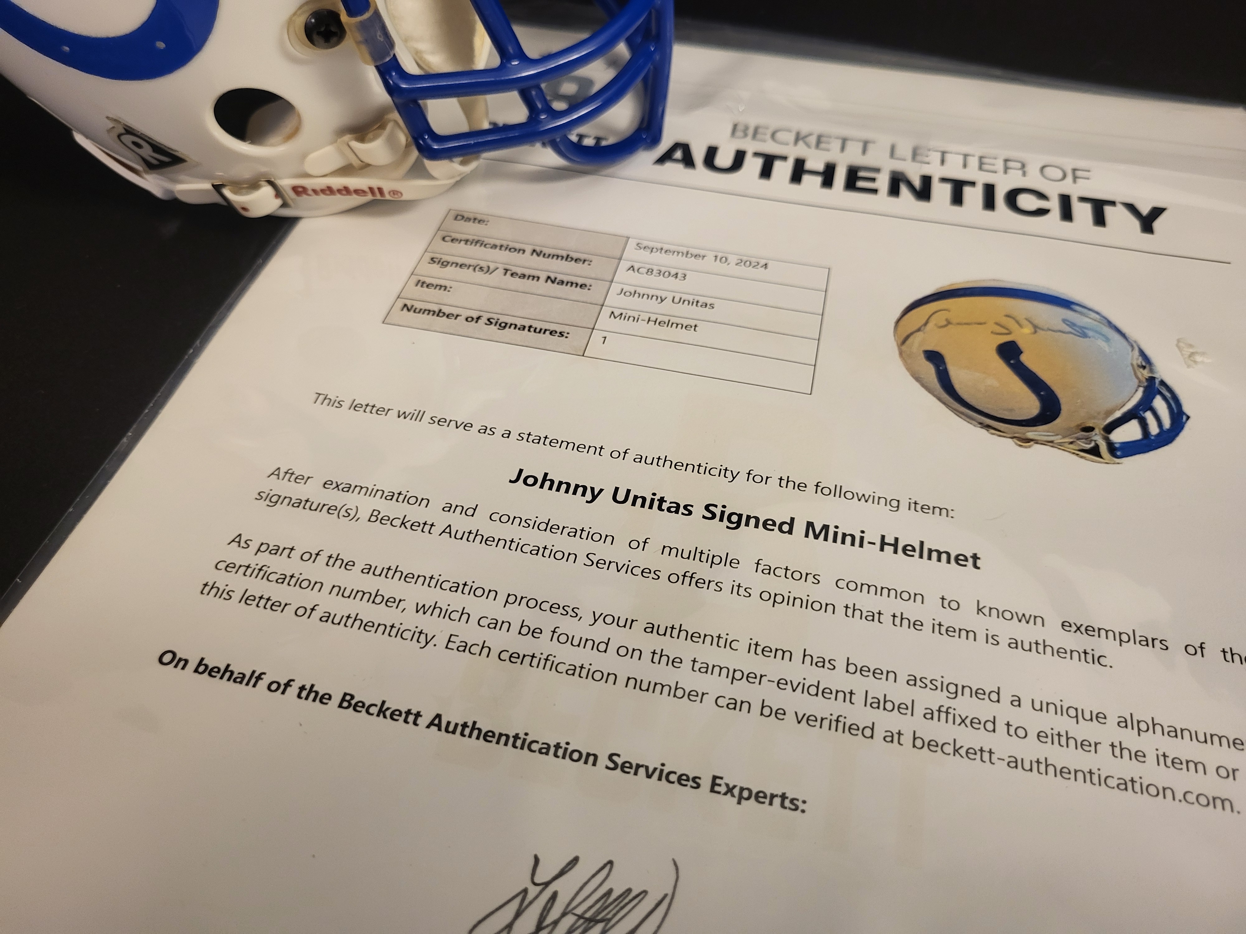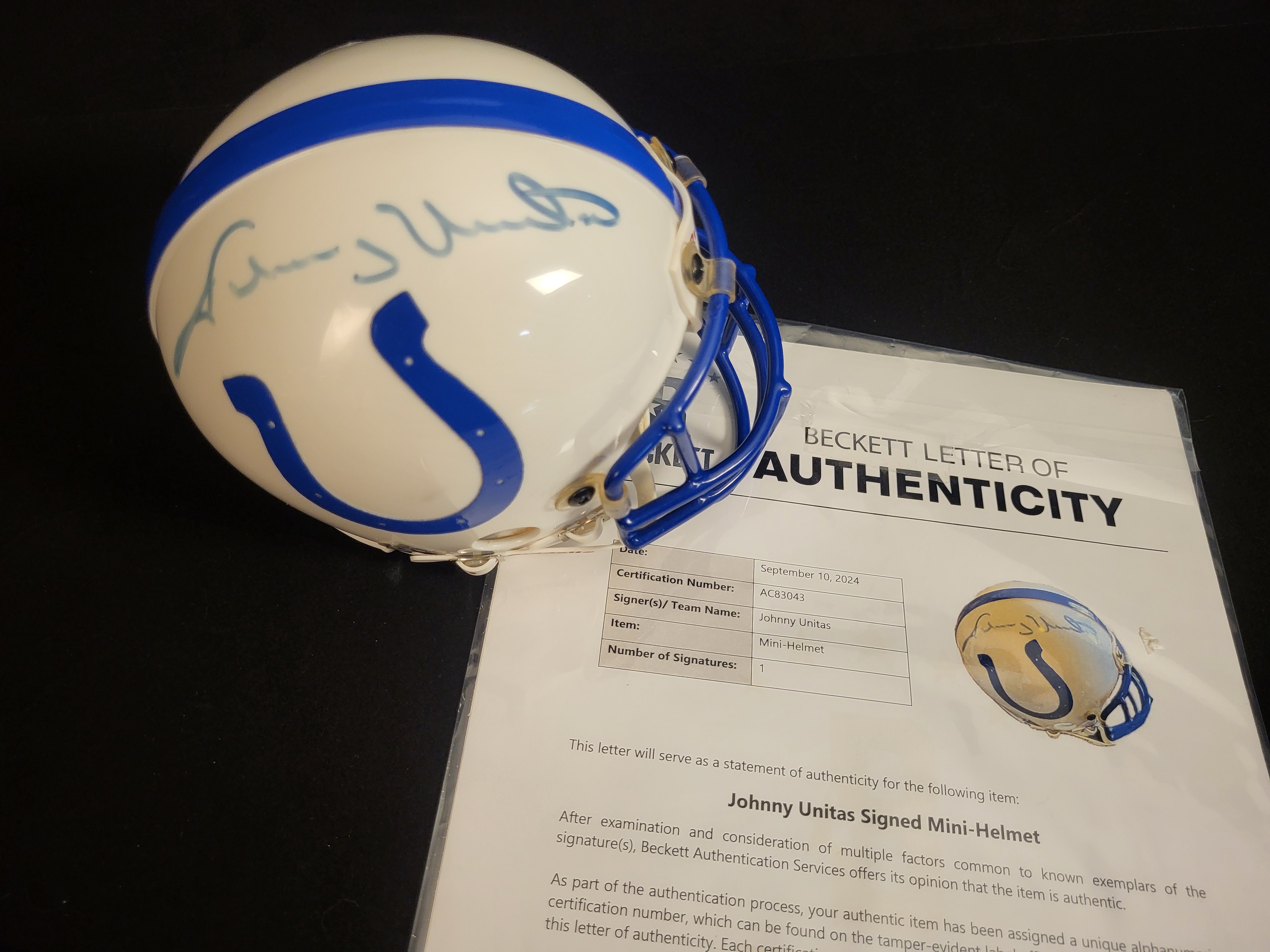 A Riddell miniature football helmet featuring the white and blue color scheme and horseshoe logo of the Baltimore Colts. The crown of the helmet is signed in blue marker by Johnny Unitas. This item is accompanied by a Beckett Letter of Authenticity dated September 10, 2024, with certification number AC83043. A matching tamper-evident holographic sticker and QR code are affixed to the rear of the shell. The helmet includes a blue facemask and standard Riddell branding on the front bumper and rear.