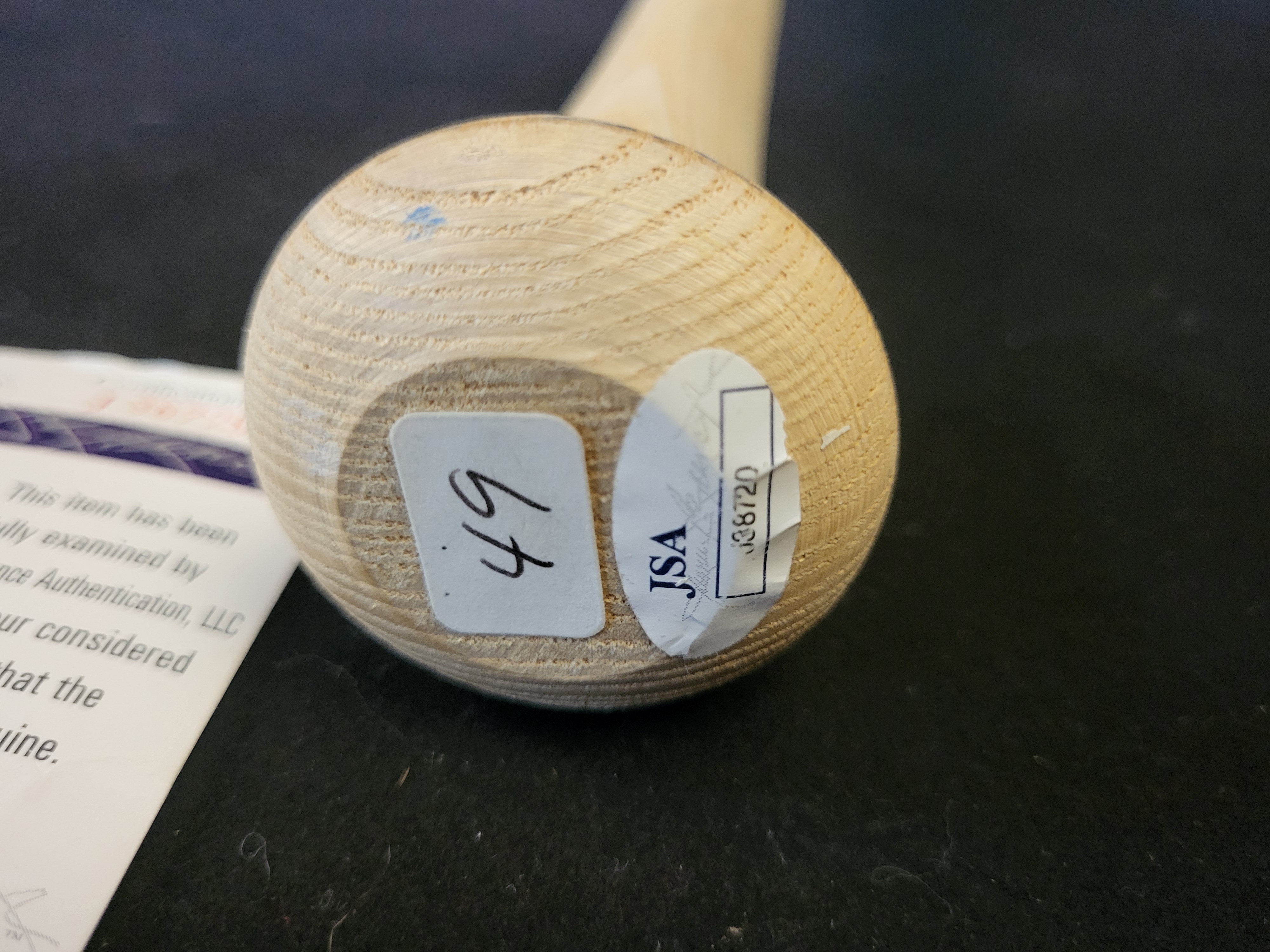 The bat is in excellent condition. The blue ink signature is bold and legible. The commemorative plaque and wood finish show minimal signs of wear. The JSA hologram sticker on the knob shows slight lifting at the edges.