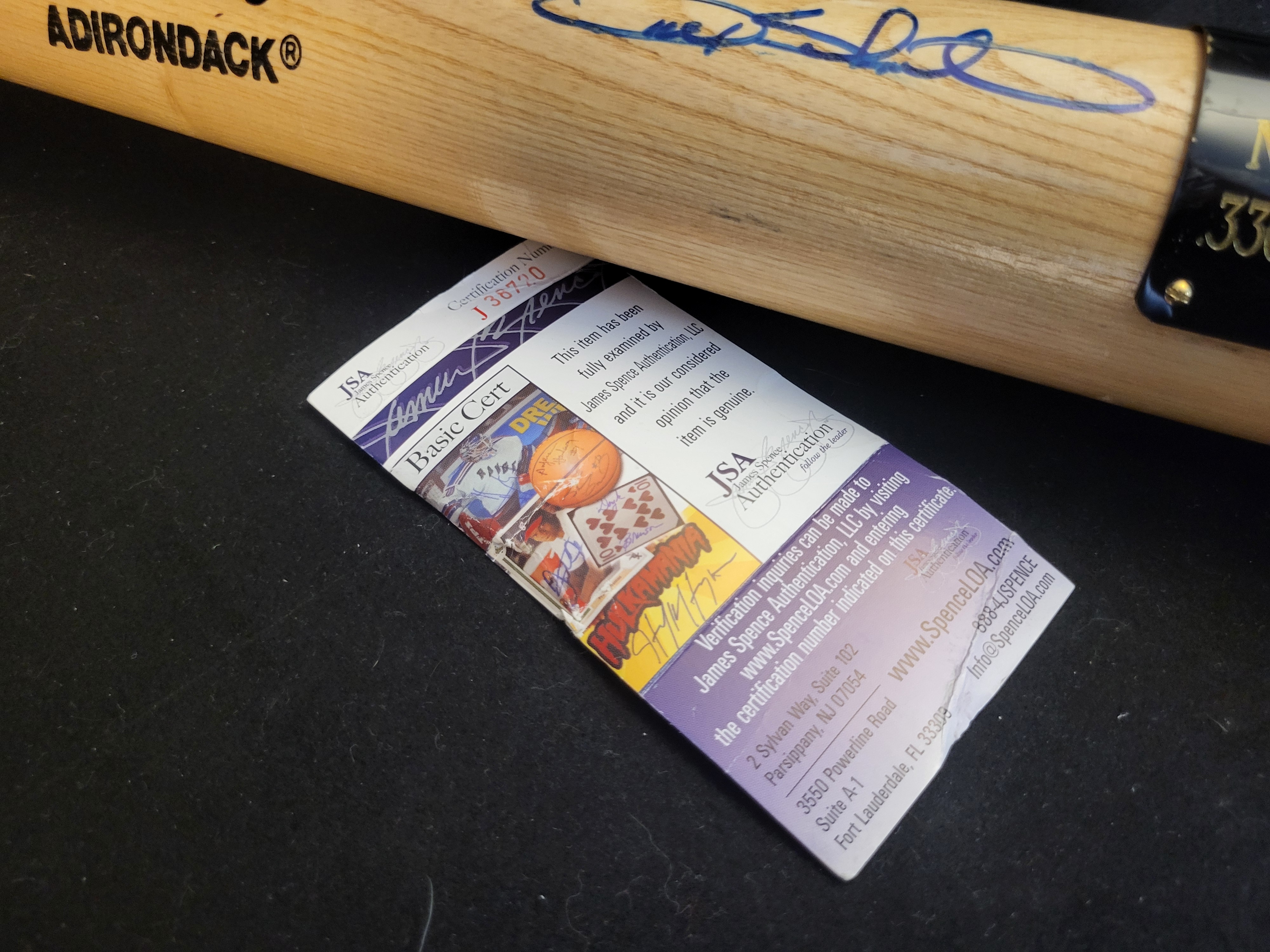 A limited edition Rawlings Adirondack wooden baseball bat commemorating Gary Sheffield’s 1992 season with the San Diego Padres. The barrel features a signature in blue ink. A black metal plaque with gold-tone engraving is affixed to the barrel, inscribed with: GARY SHEFFIELD, SAN DIEGO PADRES, 1992, N.L. BATTING CHAMPION, .330 AVG. 33 HR 100 RBI’s, Limited Edition 49 / 100. The bat includes a James Spence Authentication (JSA) Basic Cert card and a matching JSA hologram sticker, number J38720, located on the knob. The knob also bears a small white sticker with the handwritten number 49.