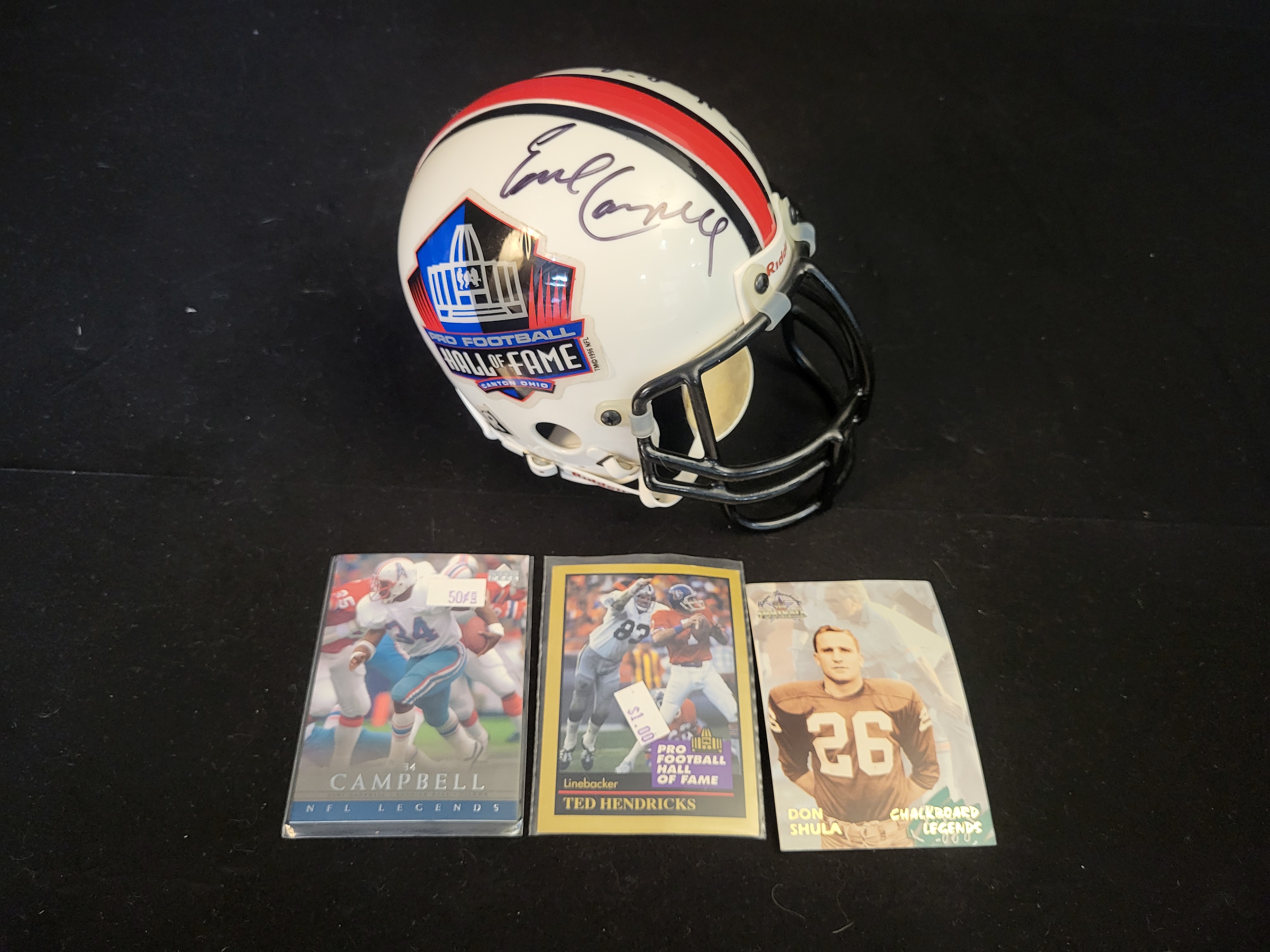 This lot features a Riddell Pro Football Hall of Fame mini helmet and three associated trading cards. The white plastic helmet displays the Pro Football Hall of Fame logo on the sides and red and black racing stripes. The helmet is hand-signed in black ink by Hall of Famers Earl Campbell, Ted Hendricks, and Don Shula. A Beckett Authentication Services sticker with serial number BS80676 is affixed to the rear of the helmet for verification. The interior of the helmet is marked with a size 3 5/8 label. The collection includes three trading cards: an Earl Campbell NFL Legends card, a Ted Hendricks Pro Football Hall of Fame card, and a Don Shula Chalkboard Legends card.