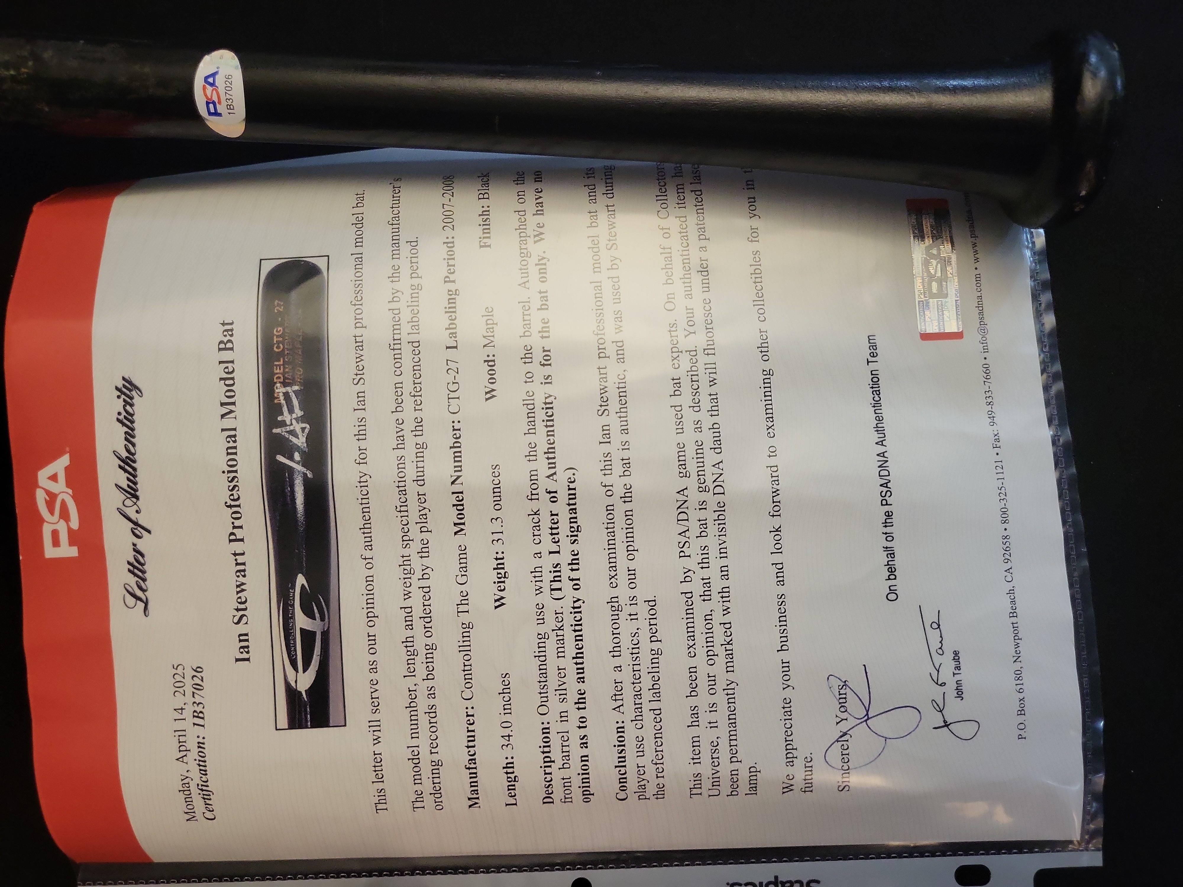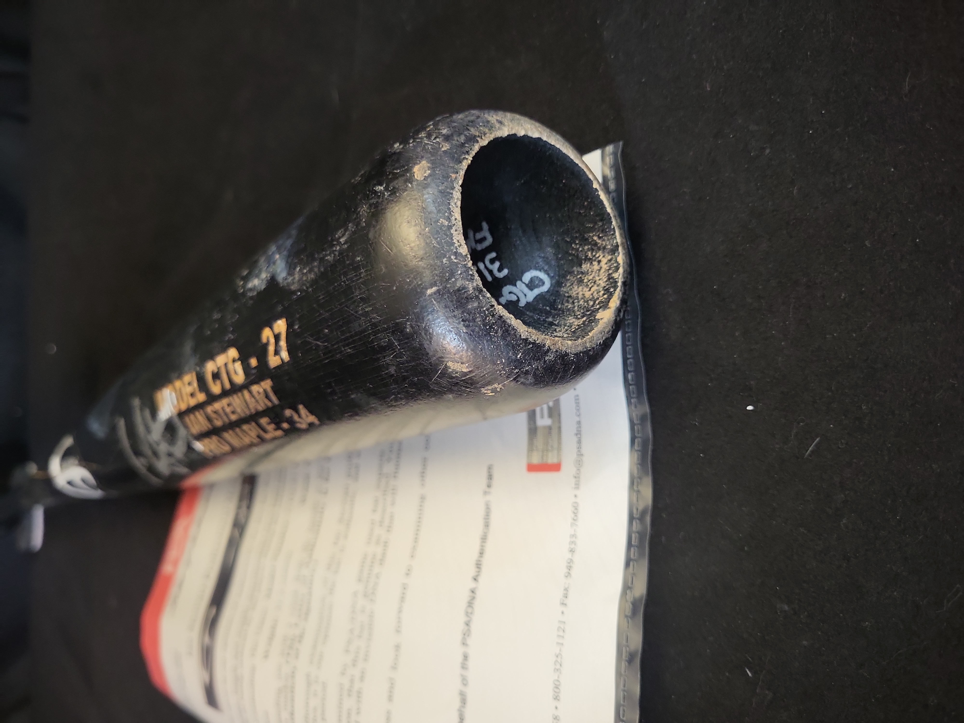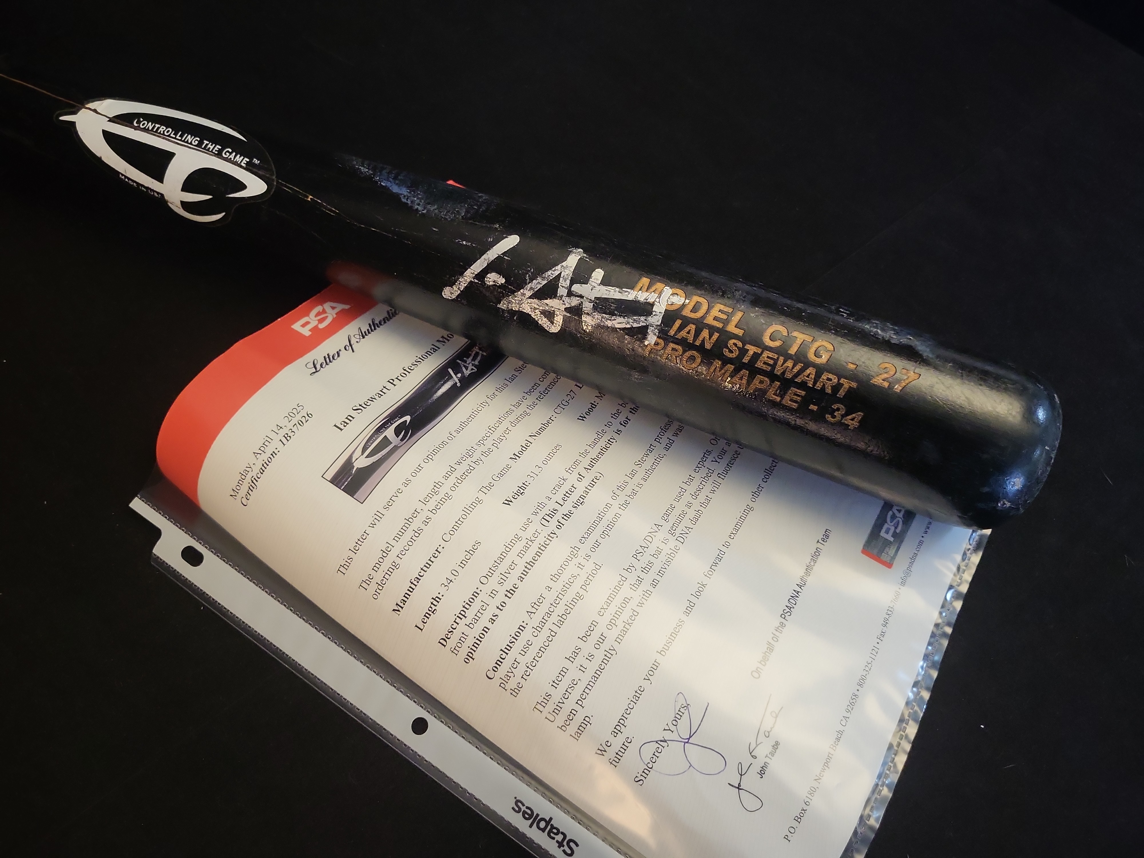 This is a professional model baseball bat used by Ian Stewart during the 2007-2008 labeling period. The bat is manufactured by Controlling The Game (CTG), model CTG-27, and is constructed from Pro Maple with a black finish. The barrel features gold-toned engravings including the CTG logo, MADE IN USA, MODEL CTG – 27, IAN STEWART, and PRO MAPLE – 34. The barrel is hand-signed by Ian Stewart in silver-toned marker. The bat measures 34.0 inches in length and weighs 31.3 ounces. This item is supported by dual professional authentication. First, a PSA/DNA Letter of Authenticity (LOA) number 1B37026, dated April 14, 2025, and signed by bat expert John Taube, confirms the bat matches Stewart’s ordering records and is genuine game-used. The bat has been permanently marked with an invisible DNA daub and bears a PSA oval sticker near the handle. Second, a James Spence Authentication (JSA) Basic Certification number CD87080 verifies the autograph is genuine, with a matching JSA sticker affixed to the knob.