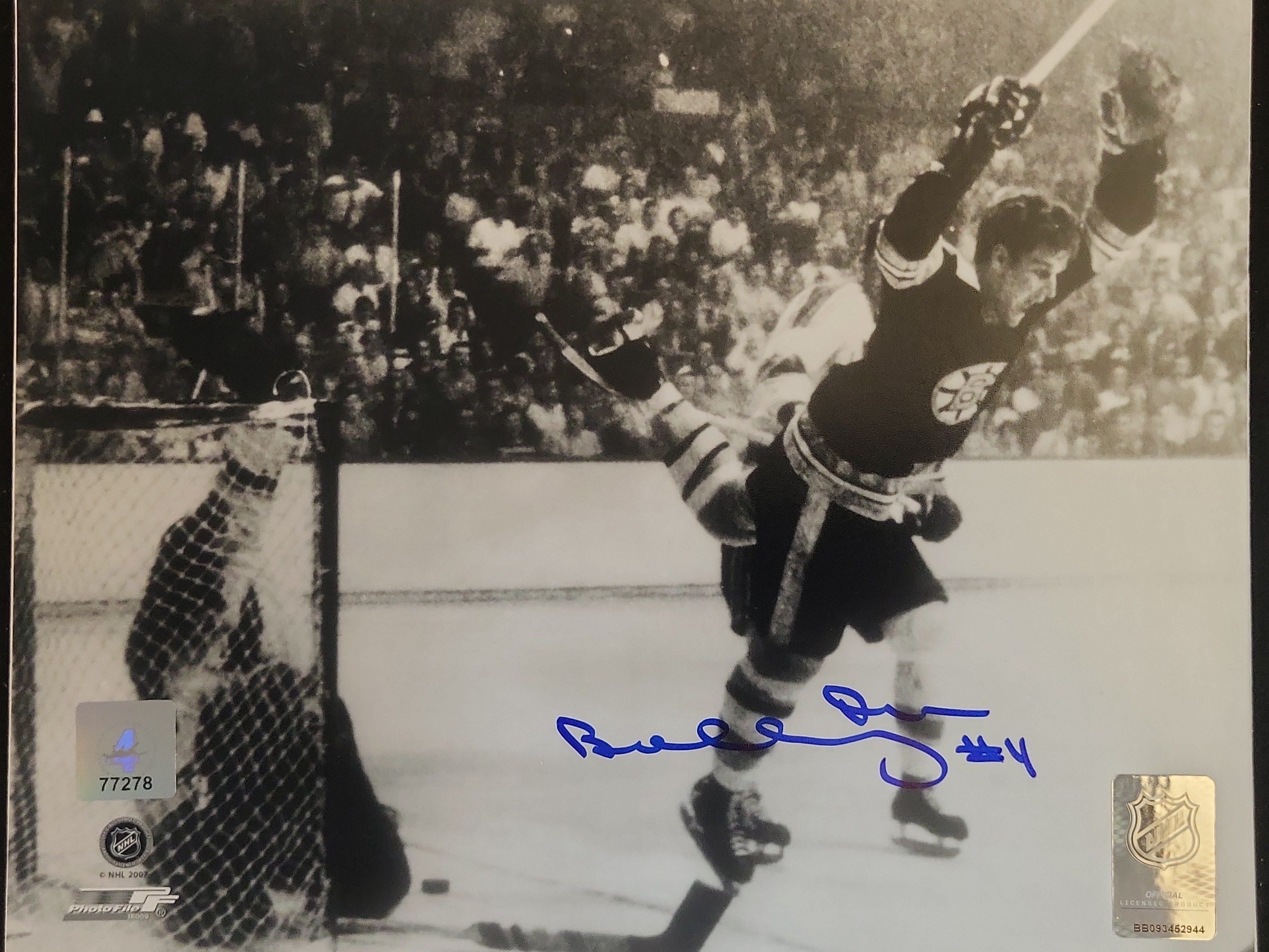 This professionally cataloged sports photograph features the legendary Boston Bruins defenseman Bobby Orr. The black and white image captures "The Goal, " widely considered the most iconic moment in National Hockey League history. Taken on May 10, 1970, at the Boston Garden, the photograph depicts Orr soaring through the air after scoring the overtime game-winning goal against the St. Louis Blues to secure the Stanley Cup championship. The item is hand-signed by Bobby Orr in bold blue felt-tip marker and includes his jersey number inscription, "#4." The piece features dual authentication for maximum provenance: a Great North Road Marketing hologram (Serial #77278), which is the official memorabilia company of Bobby Orr, and an NHL Official Licensed Product hologram (Serial #BB093452944). The photograph also includes the PhotoFile manufacturer mark in the lower-left corner.