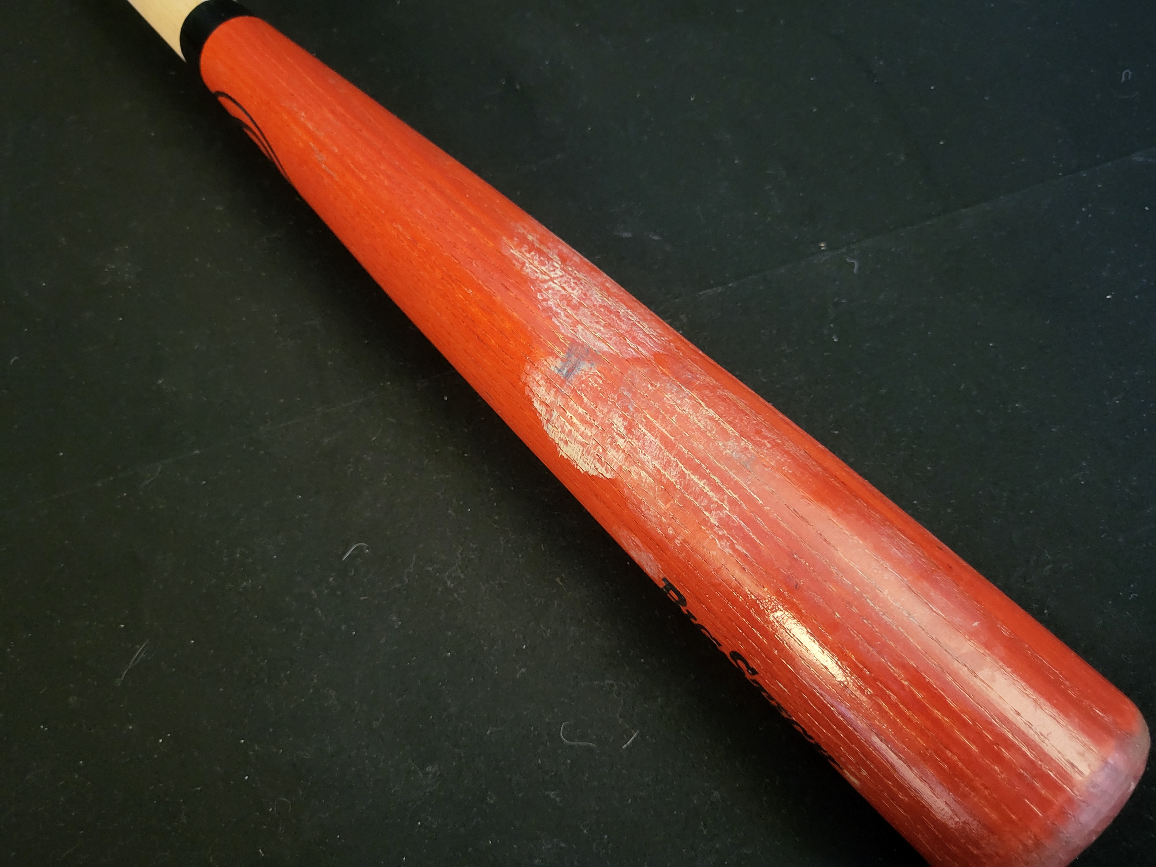 The bat shows signs of use including notable scuffing, impact marks, and finish loss on one side of the barrel. Minor wear is present throughout the surface.