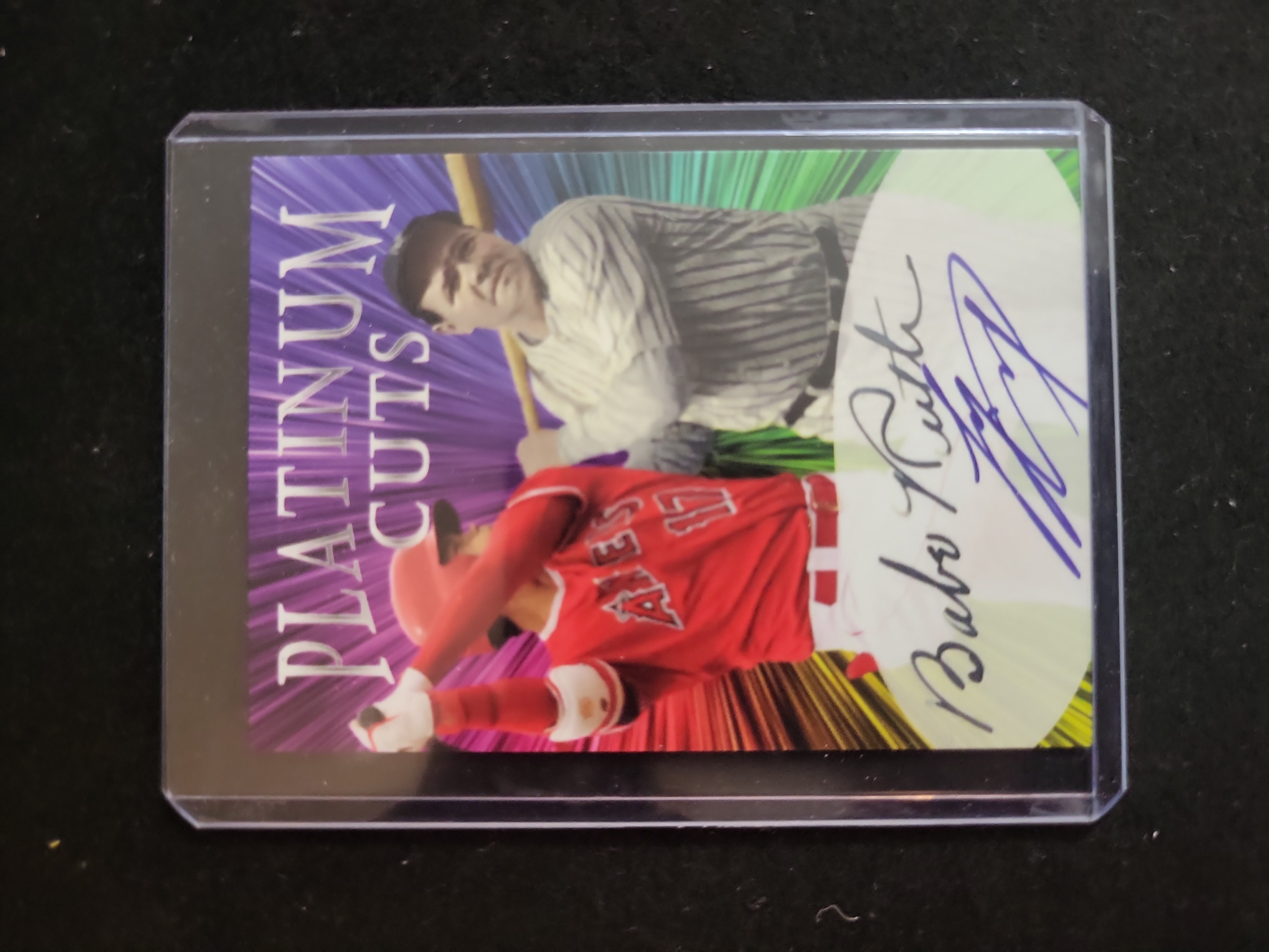 Platinum Cuts, Modern Era (c. 2018-present), Custom/Independent Production, N/A, Babe Ruth and Shohei Ohtani, Not a rookie card, Dual-subject design with multi-color radial background and printed facsimile signatures, Uncertified/Custom Art Card.