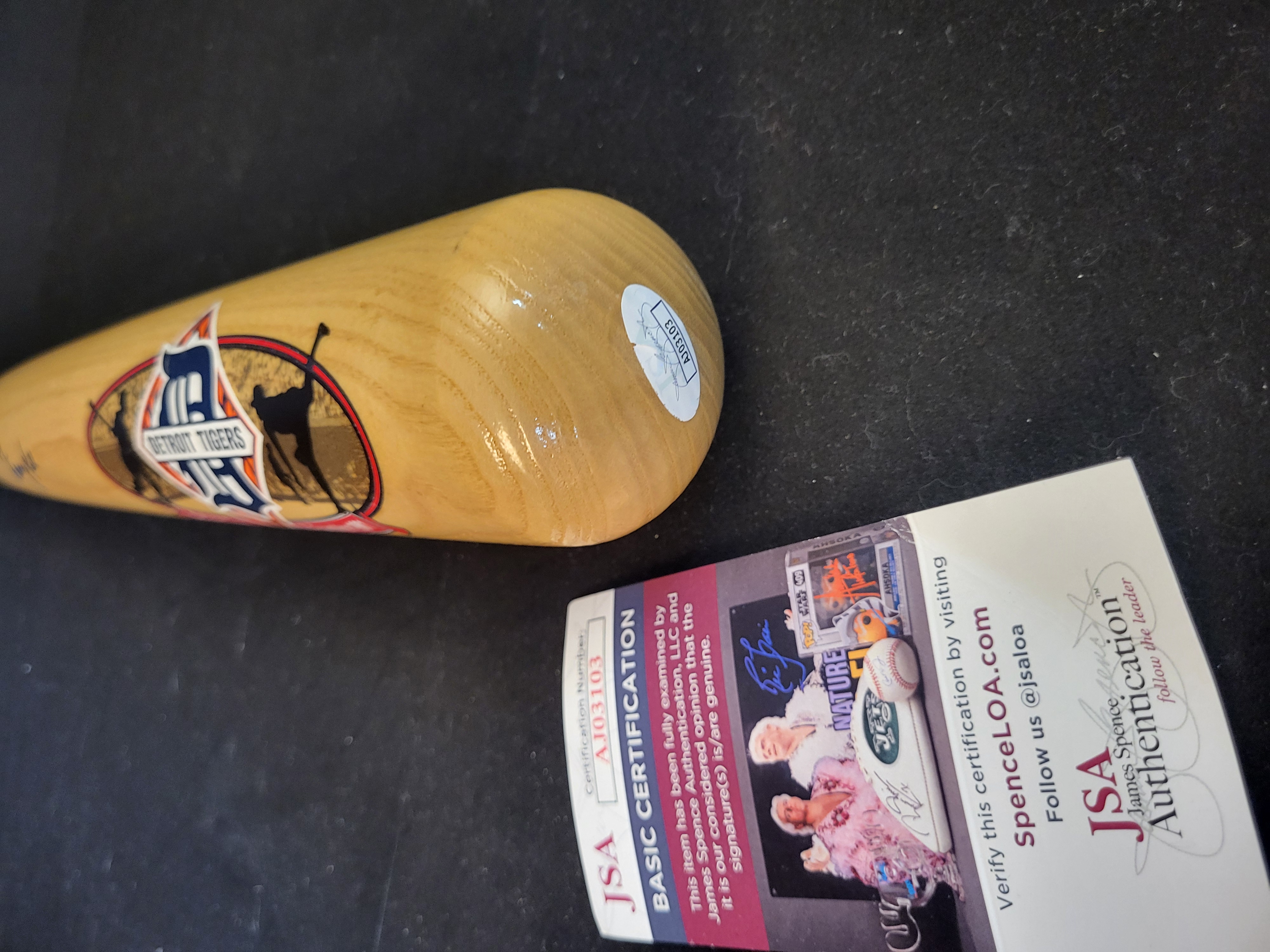 A commemorative wooden baseball bat manufactured by the Cooperstown Bat Co. of Cooperstown, New York. The bat is constructed from light natural wood with a high-gloss finish. The barrel features a multi-color graphic including the Detroit Tigers logo, player silhouettes, and the text Detroit Tigers AL Franchise 1901. A blue ink signature attributed to George Kell is present on the barrel. The manufacturer logo is branded into the wood with the text Cooperstown Bat Co. Cooperstown, New York Made in U.S.A. The bat is accompanied by a James Spence Authentication JSA Basic Certification card and a corresponding tamper-evident serial number sticker AJ03103 located on the knob.