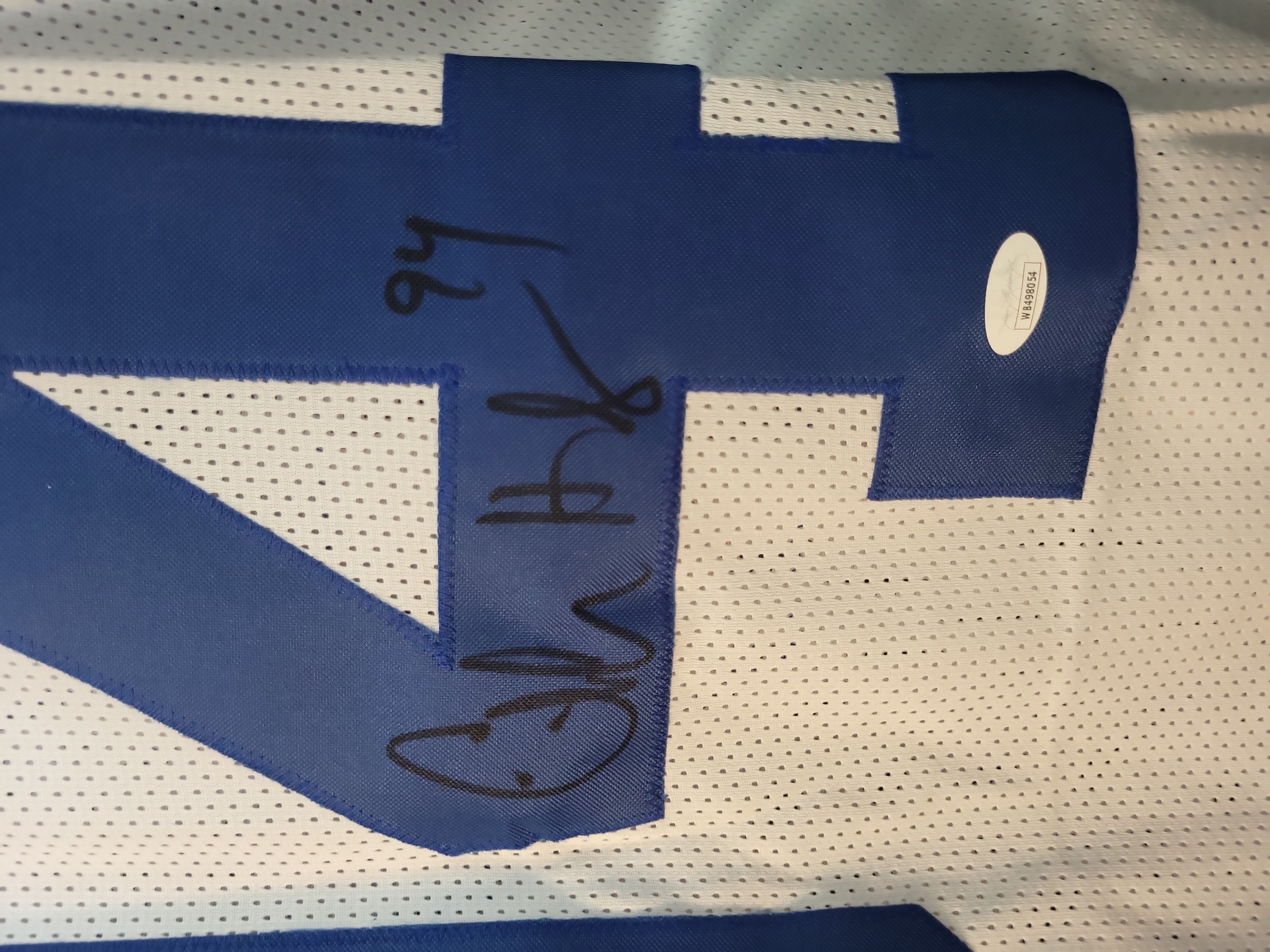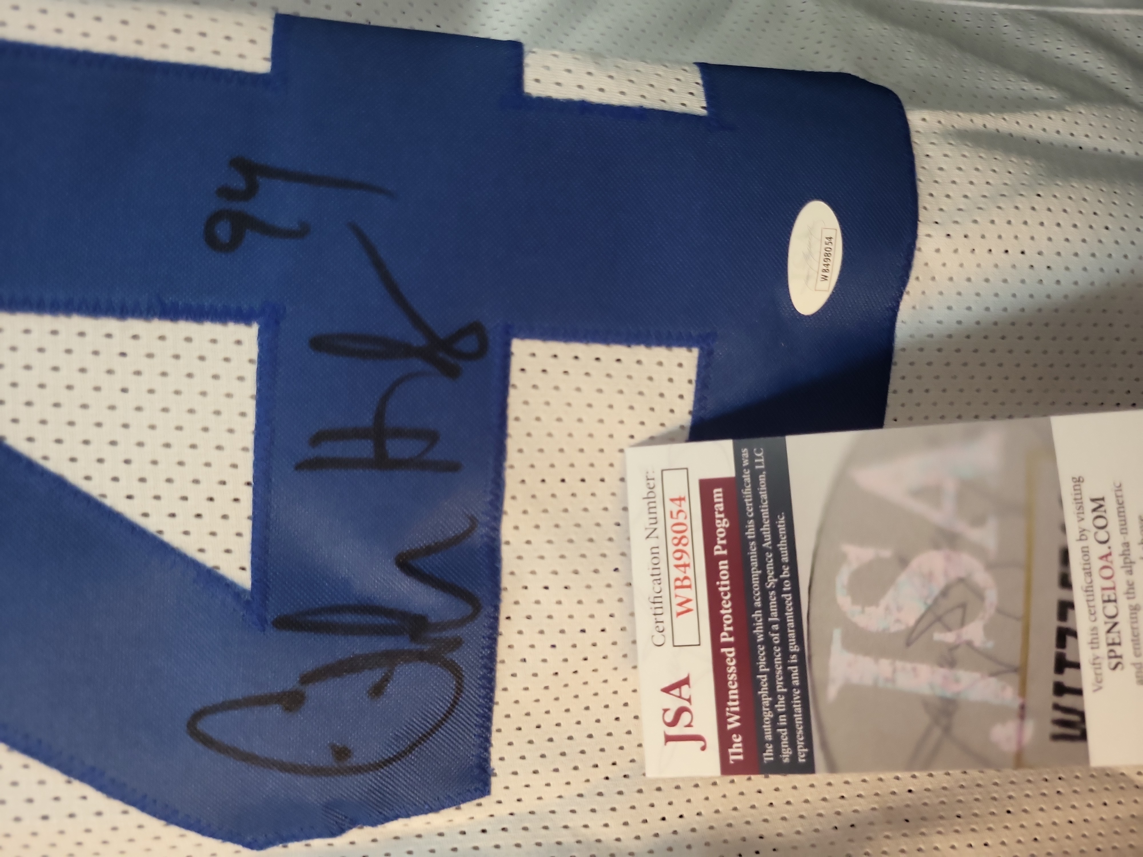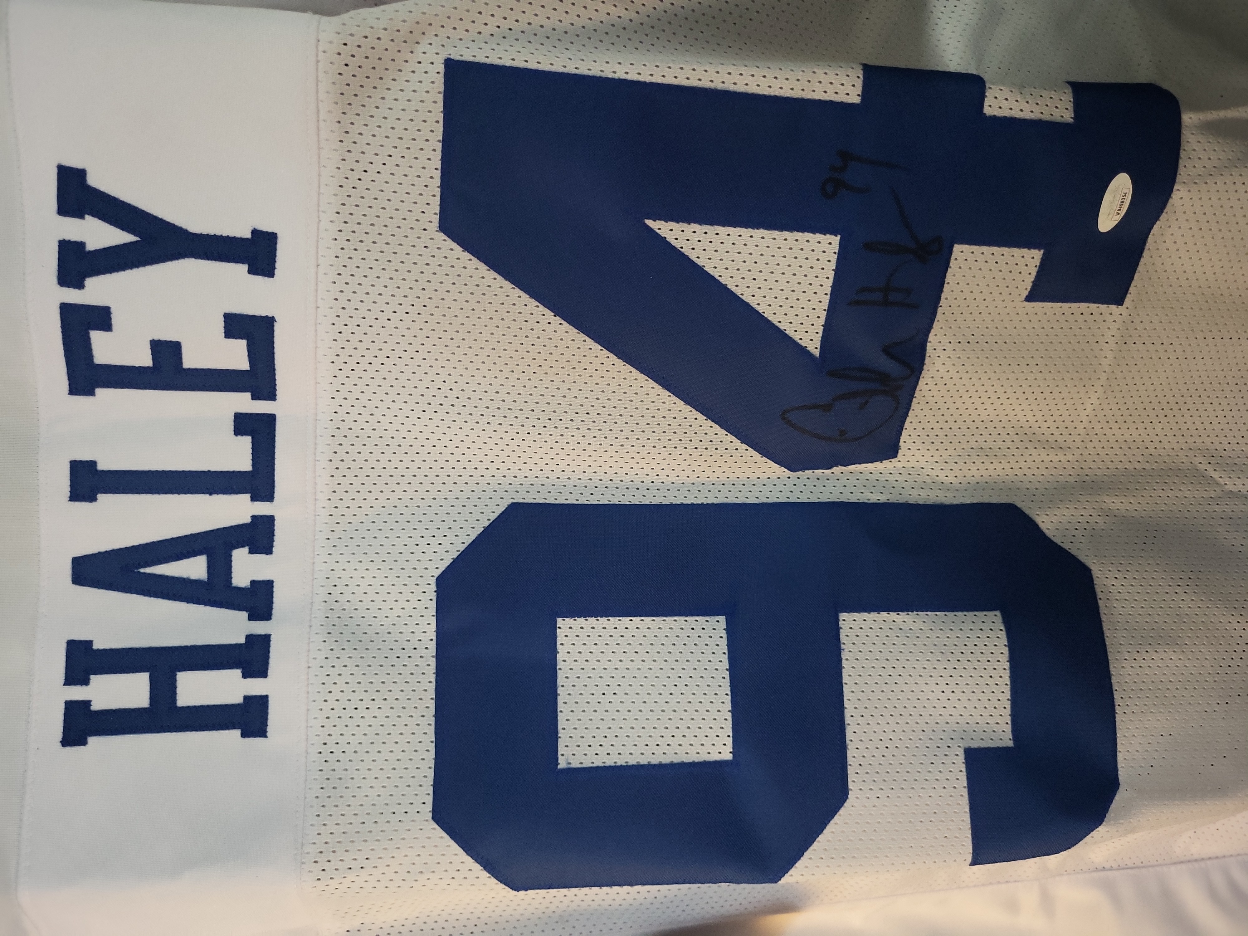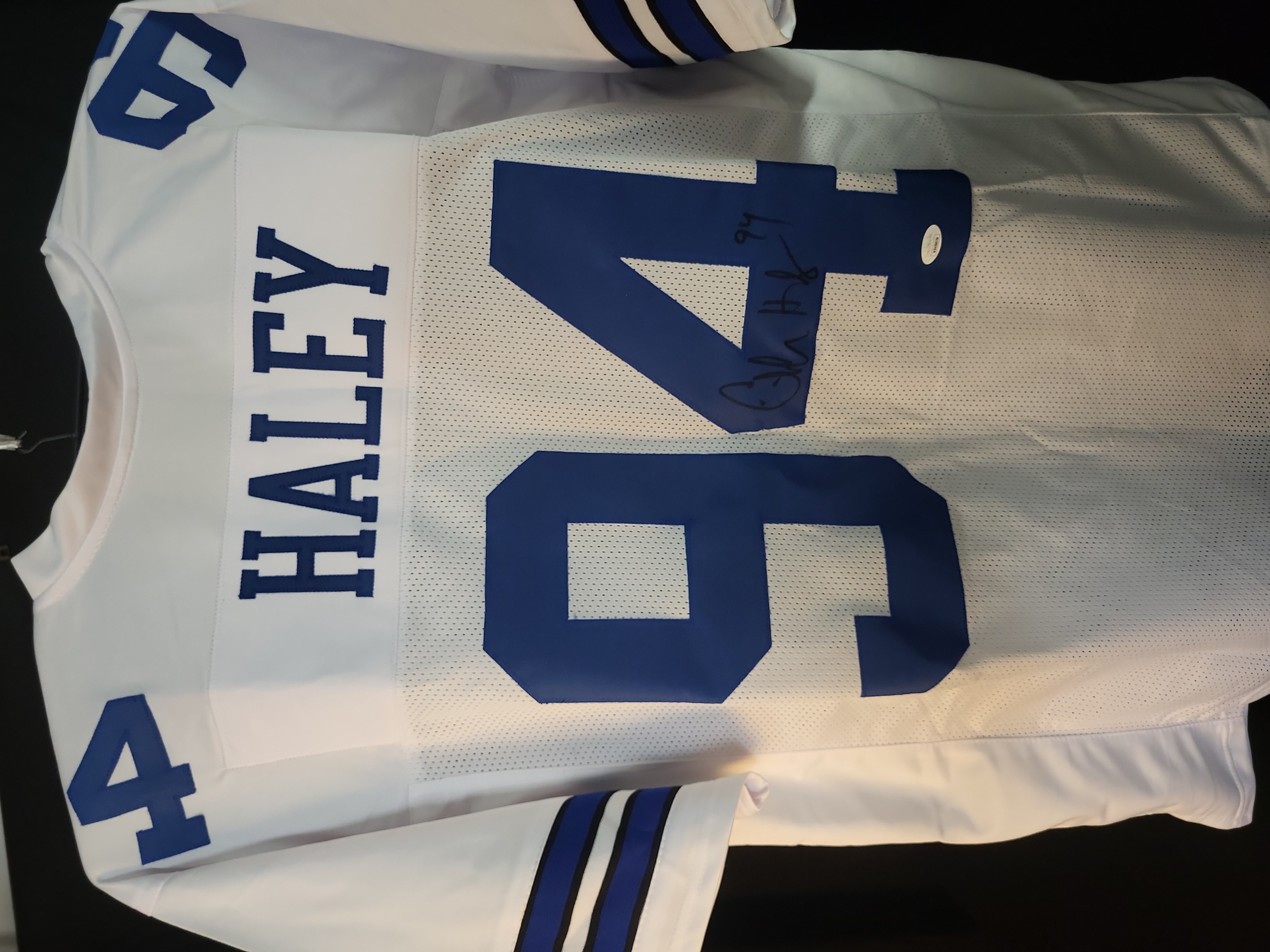 This is a custom white mesh football jersey hand-signed by Pro Football Hall of Fame defensive end Charles Haley. The jersey features tackle twill lettering and numbering in Dallas team colors, with "HALEY" across the nameplate and number "94" on the back. The sleeves are accented with blue and navy striping. This item was produced specifically for autographing purposes and does not feature official league or team logos. The signature is rendered in bold black felt-tip marker on the reverse number "4" and includes a "94" jersey number inscription. This item is authenticated by James Spence Authentication (JSA) under their "Witnessed Protection Program, " confirming a JSA representative was present at the time of signing. It includes a matching tamper-evident JSA sticker on the jersey and the corresponding basic Certificate of Authenticity (COA) card. Certification Number: WB498054.
