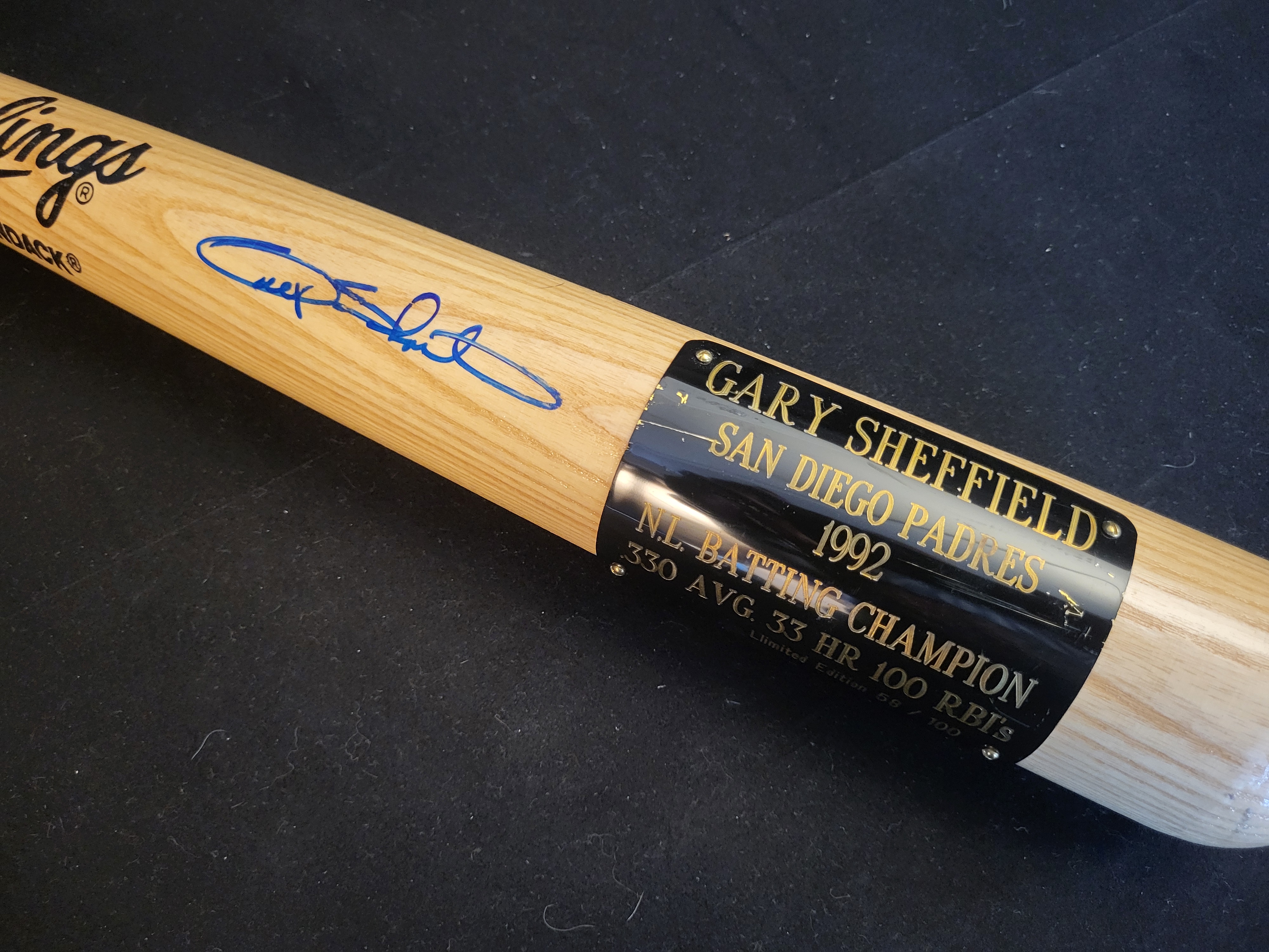 A commemorative wooden Rawlings Adirondack baseball bat featuring a blue ink signature of Gary Sheffield on the barrel. The bat is fitted with a black metal plaque commemorating Sheffield’s 1992 season with the San Diego Padres. The plaque is inscribed with the following text: GARY SHEFFIELD / SAN DIEGO PADRES / 1992 / N.L. BATTING CHAMPION / 330 AVG. 33 HR 100 RBI’s / Limited Edition 58 / 100. A James Spence Authentication (JSA) certification sticker with the number J38721 is affixed to the knob of the bat.