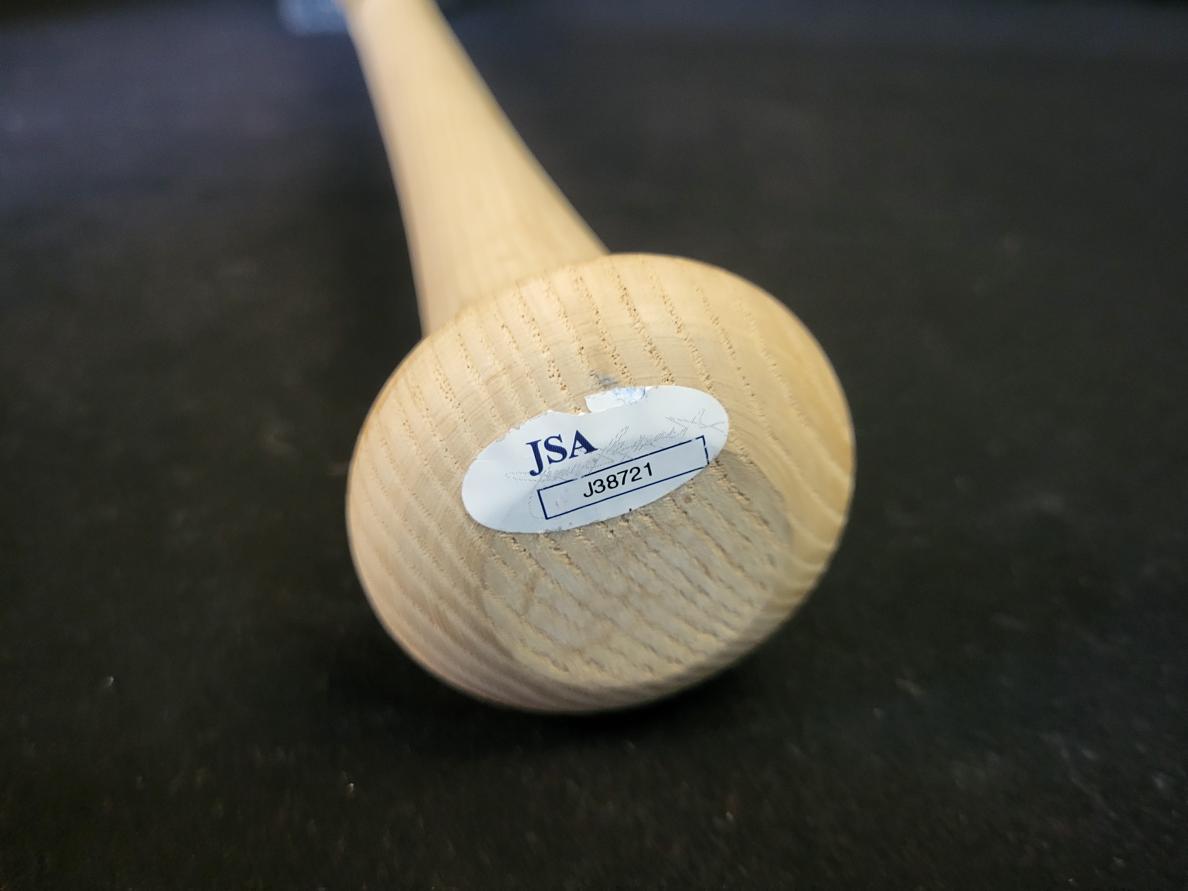 The signature remains bold and legible. The metal commemorative plaque shows minor surface wear and light scratches consistent with handling. The JSA authentication sticker on the knob is partially torn. The wooden surface of the bat shows minimal signs of wear.
