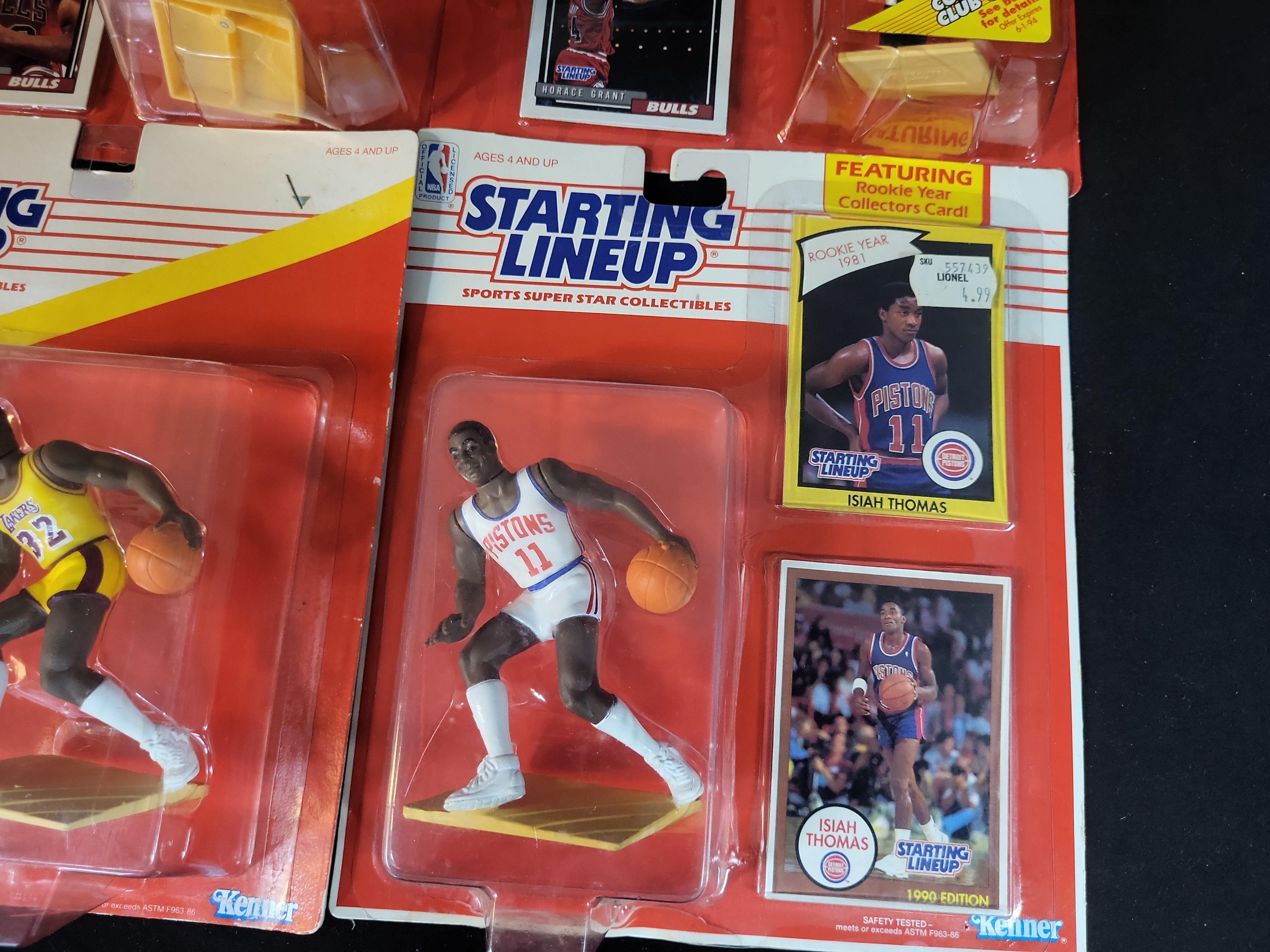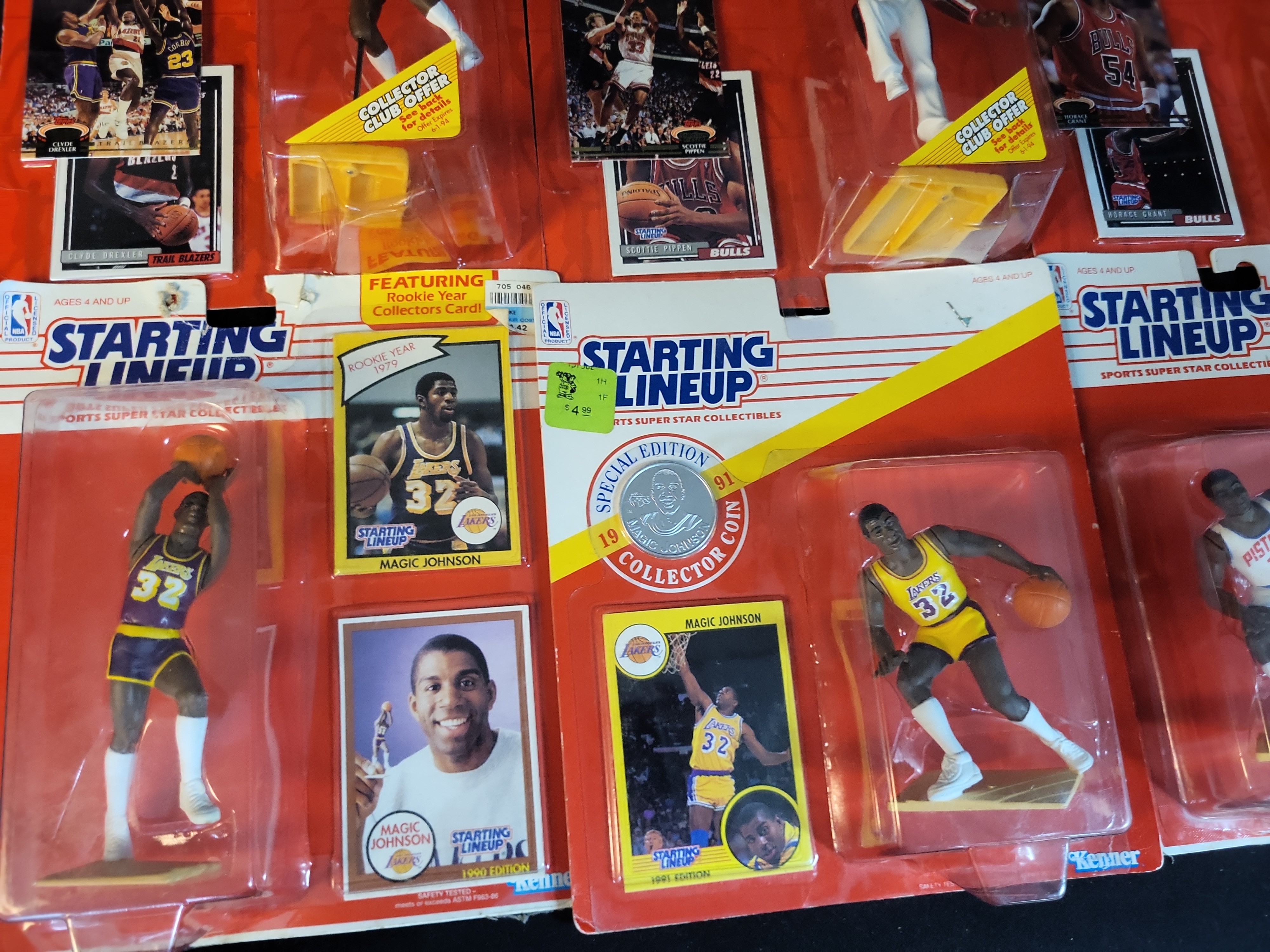 A collection of 12 original Kenner Starting Lineup NBA sports superstar collectible action figures. These figures are constructed of molded plastic and are presented on their original cardboard backer cards with accompanying paper trading cards. The figures feature static poses with minimal articulation at the shoulders. This group represents the early 1990s era of the line and includes several Hall of Fame players and special editions. The inventory features two versions of Magic Johnson (L.A. Lakers), including a 1990 Edition with a 1979 Rookie Year card and a 1991 Special Edition with a collector coin. Also included are 1990 Editions of John Stockton (Utah Jazz), Patrick Ewing (New York Knicks), and Isiah Thomas (Detroit Pistons), each featuring their respective rookie year cards. The collection further contains Scottie Pippen (Chicago Bulls) and Clyde Drexler (Portland Trail Blazers) with Stadium Club cards, Shawn Kemp (Seattle SuperSonics), and two variants of Horace Grant (Chicago Bulls) in away red and white warm-up uniforms. Rounding out the group are figures in a Seattle SuperSonics #40 jersey and a white #35 jersey. Each figure includes its original team-colored display base.
