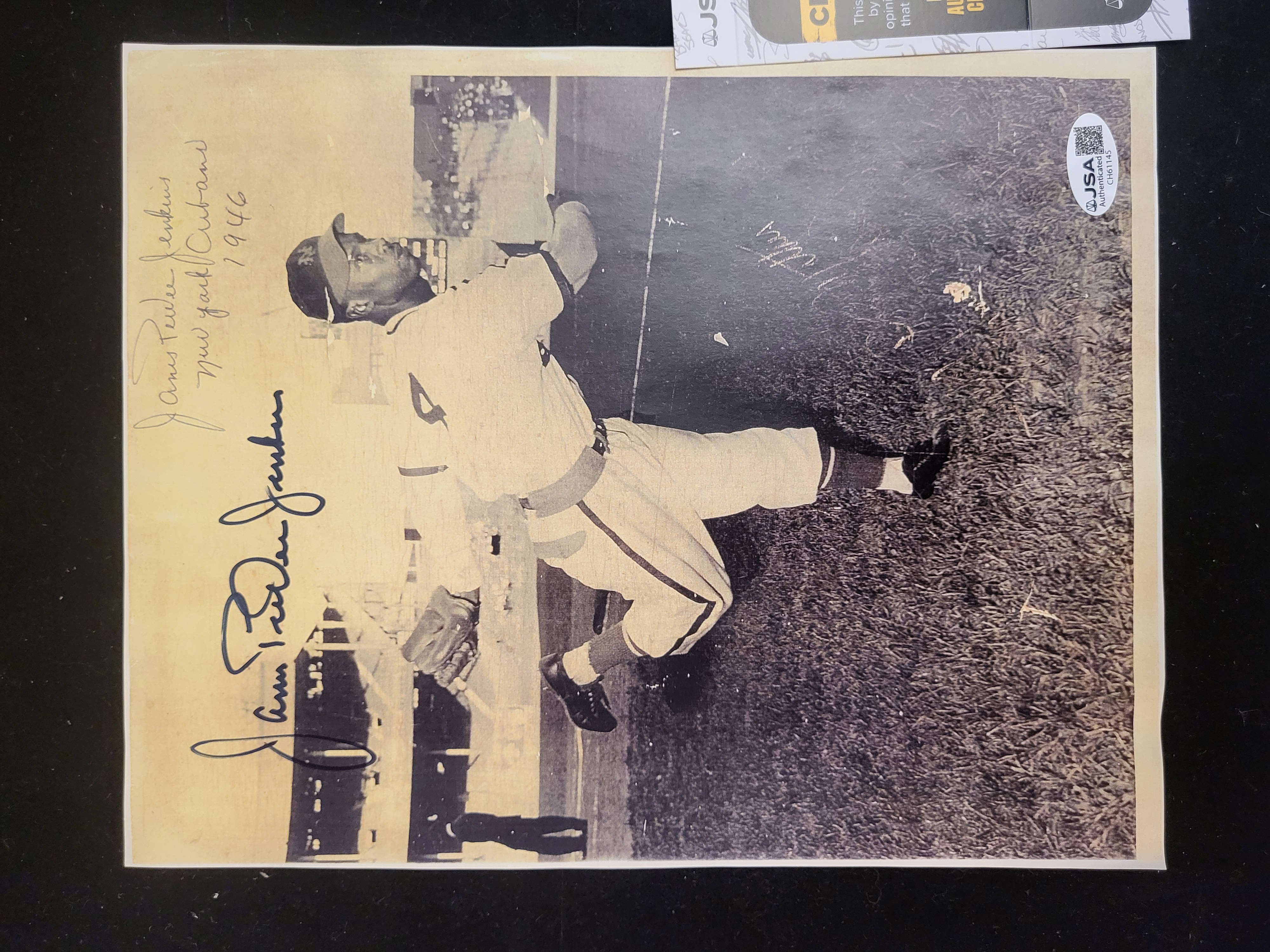 This lot features an autographed black and white photograph of Negro League pitcher James Pee Wee Jenkins. The photograph depicts Jenkins in an action pose wearing a baseball uniform. It contains a bold signature in dark ink and a handwritten inscription that reads James Peewee Jenkins New York Cubans 1946. The item is accompanied by a James Spence Authentication JSA Basic Certification card. A matching JSA tamper-evident authentication sticker with certification number CH61145 is affixed to the lower right corner of the photograph.