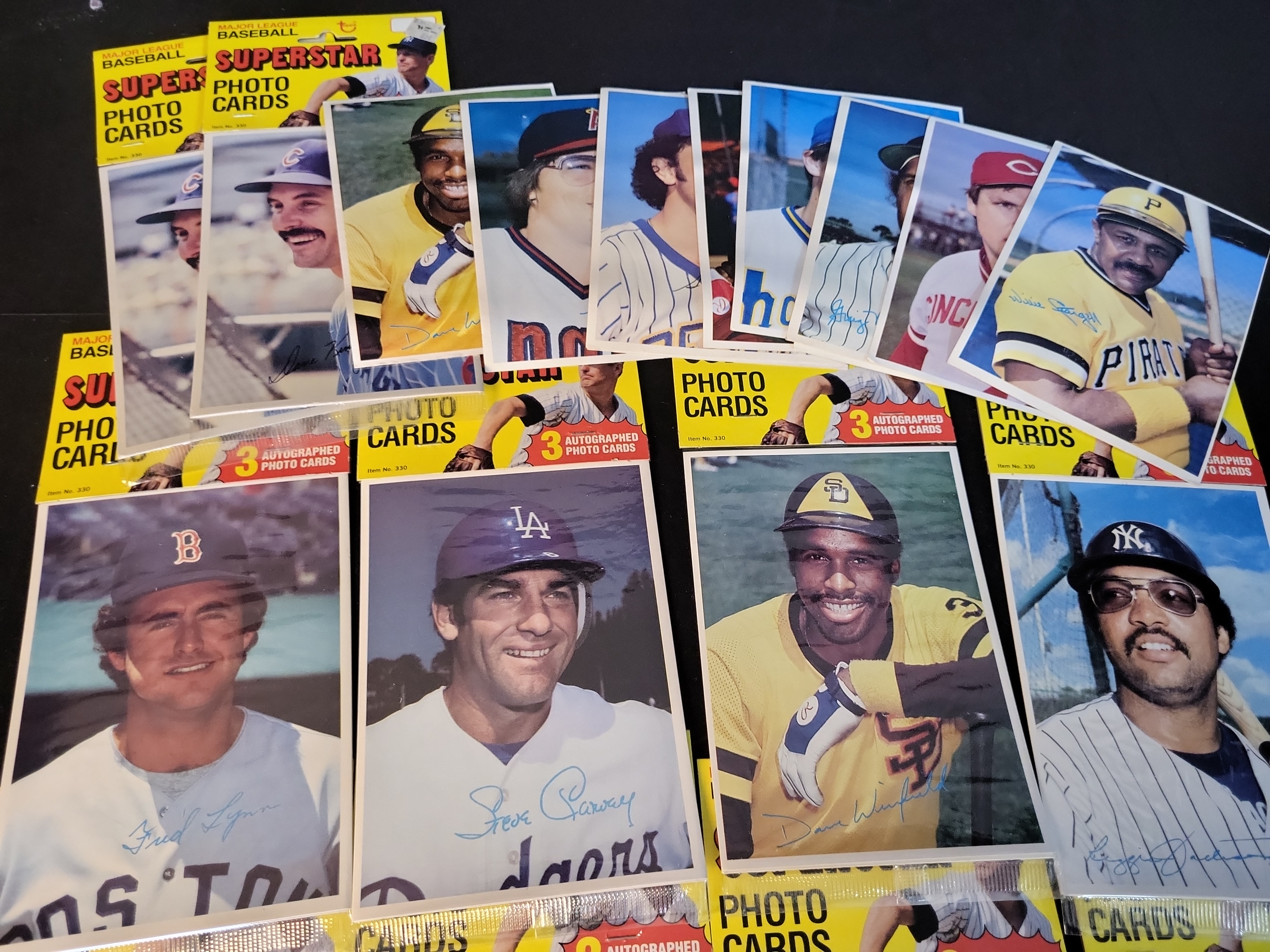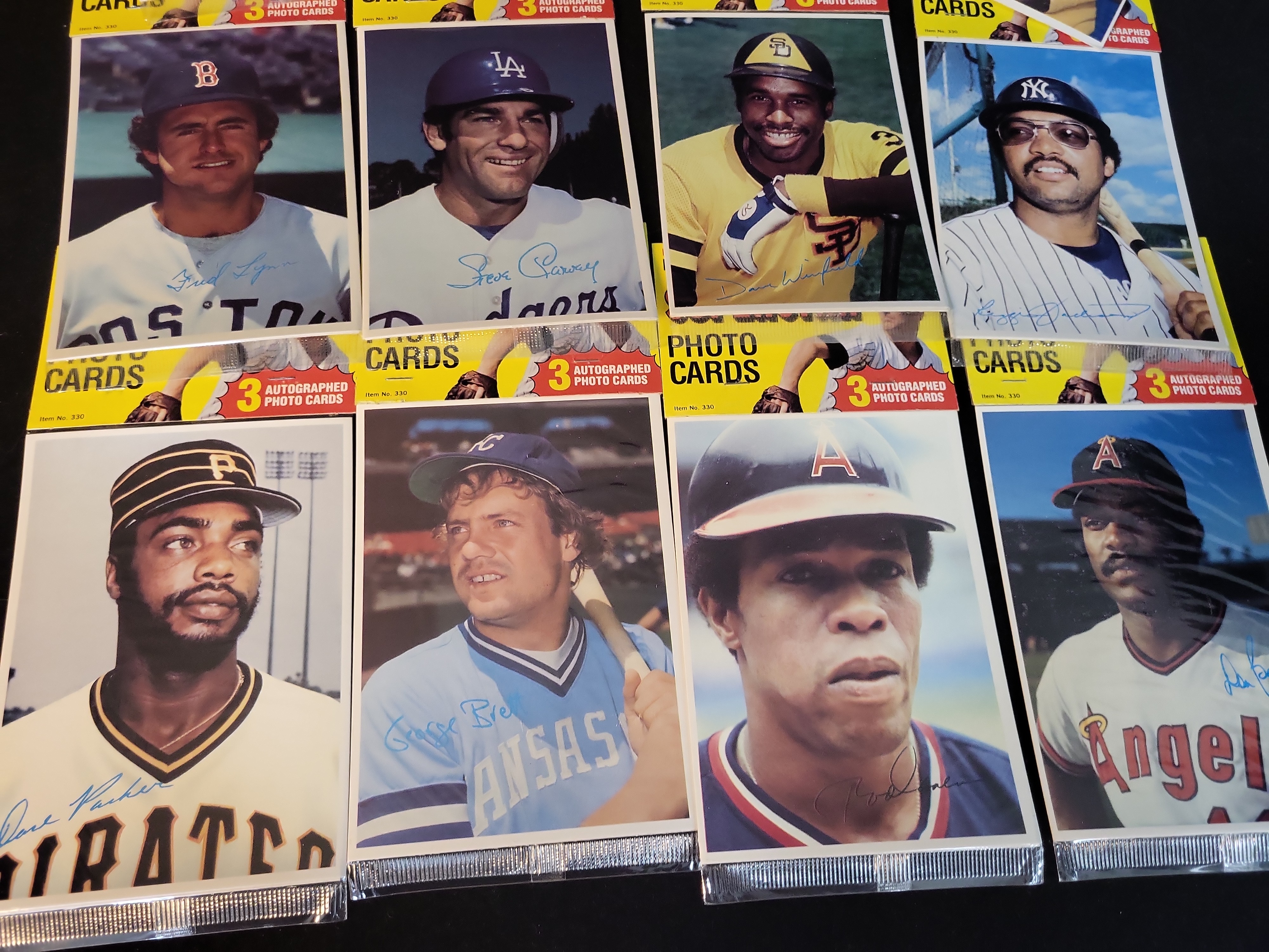 This collection consists of 1980 Topps (T.C.G.) Major League Baseball Superstar Photo Cards. These oversized 5" x 7" cards feature vibrant photography and blue facsimile autographs. The lot includes numerous Hall of Famers and All-Stars, most notably George Brett, Reggie Jackson, Willie Stargell, Dave Winfield, Rod Carew, Steve Garvey, Fred Lynn, Dave Parker, Don Baylor, Dave Kingman, and Joe Morgan. A significant portion of the lot remains in the original clear plastic retail packaging with yellow and red header cards (Item No. 330). There are no rookie cards identified in this set.