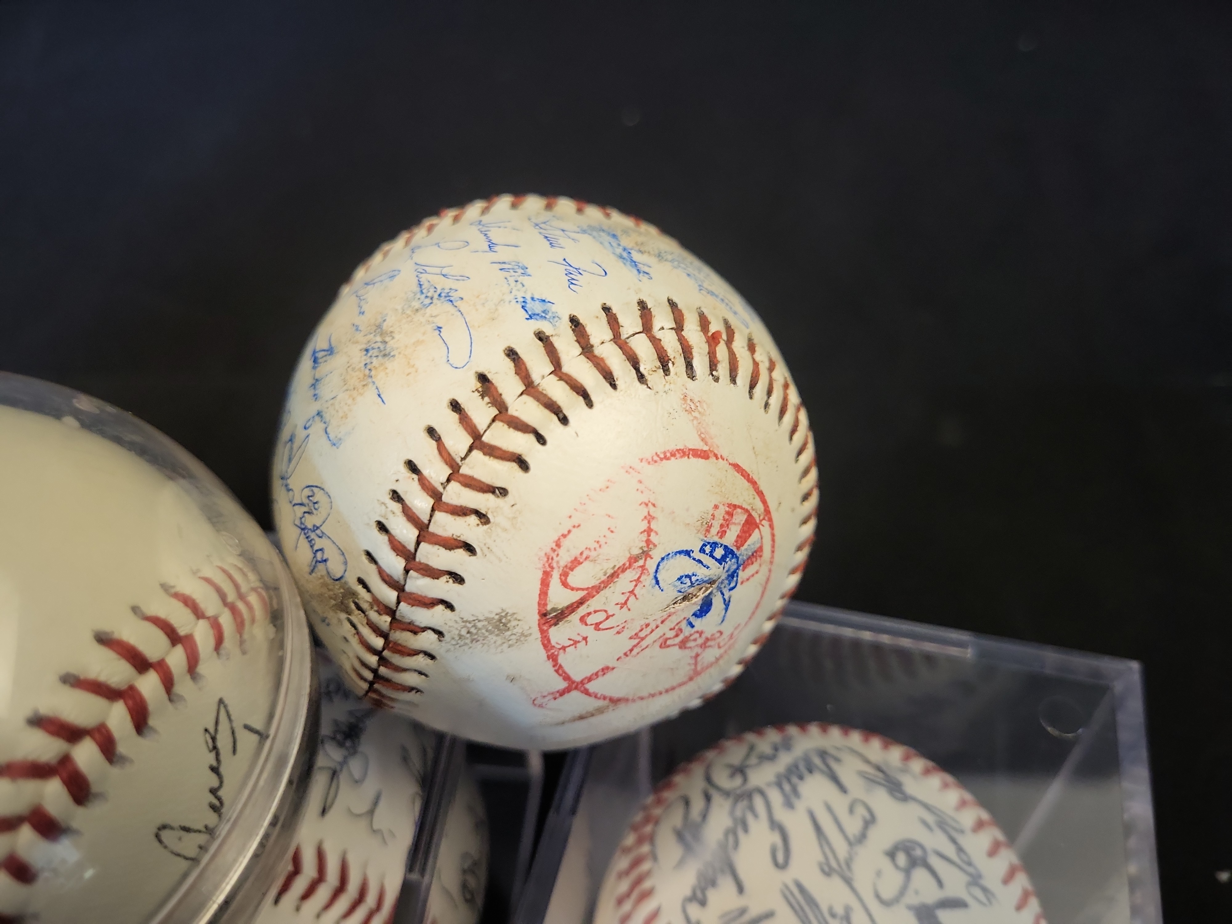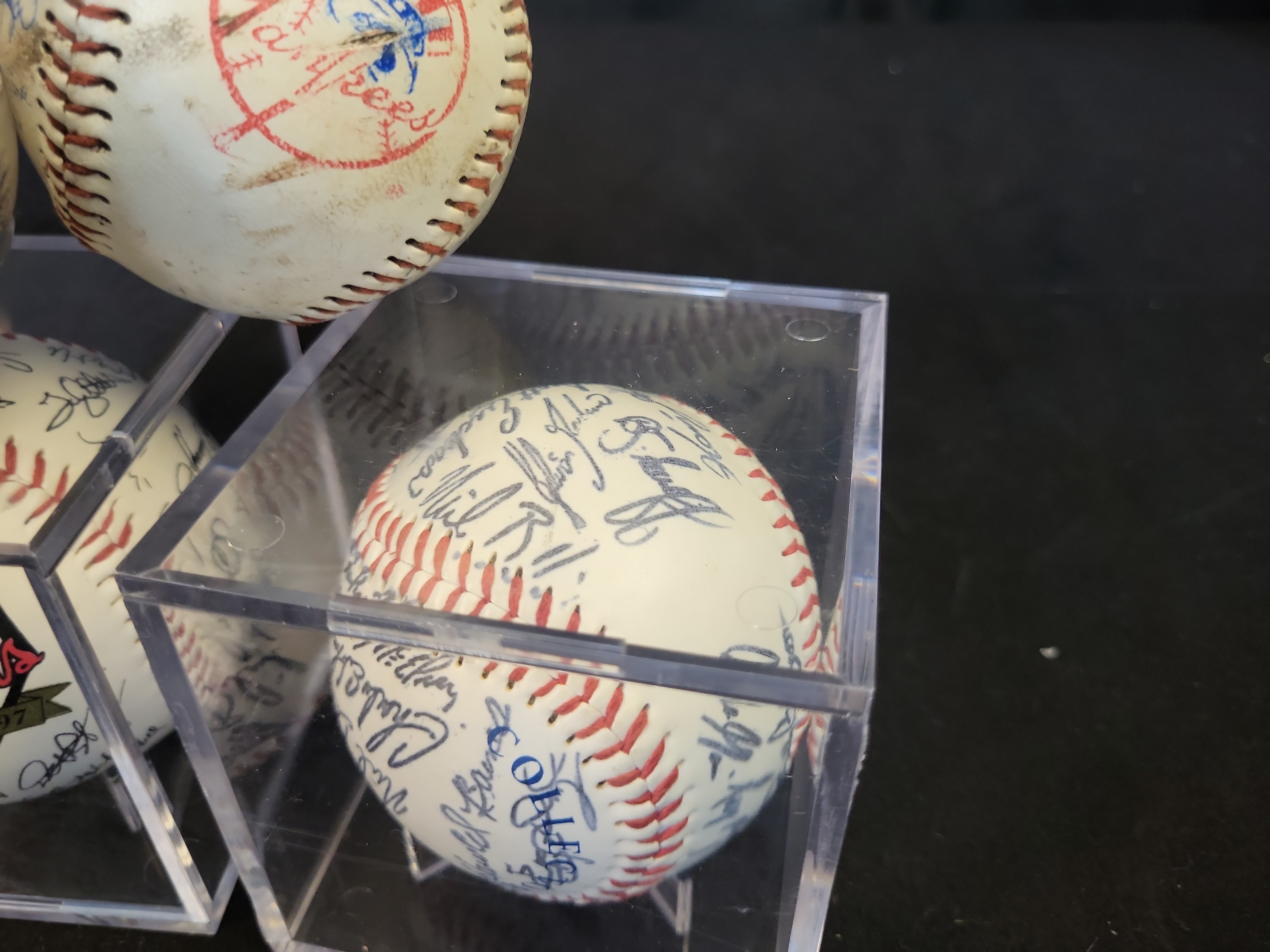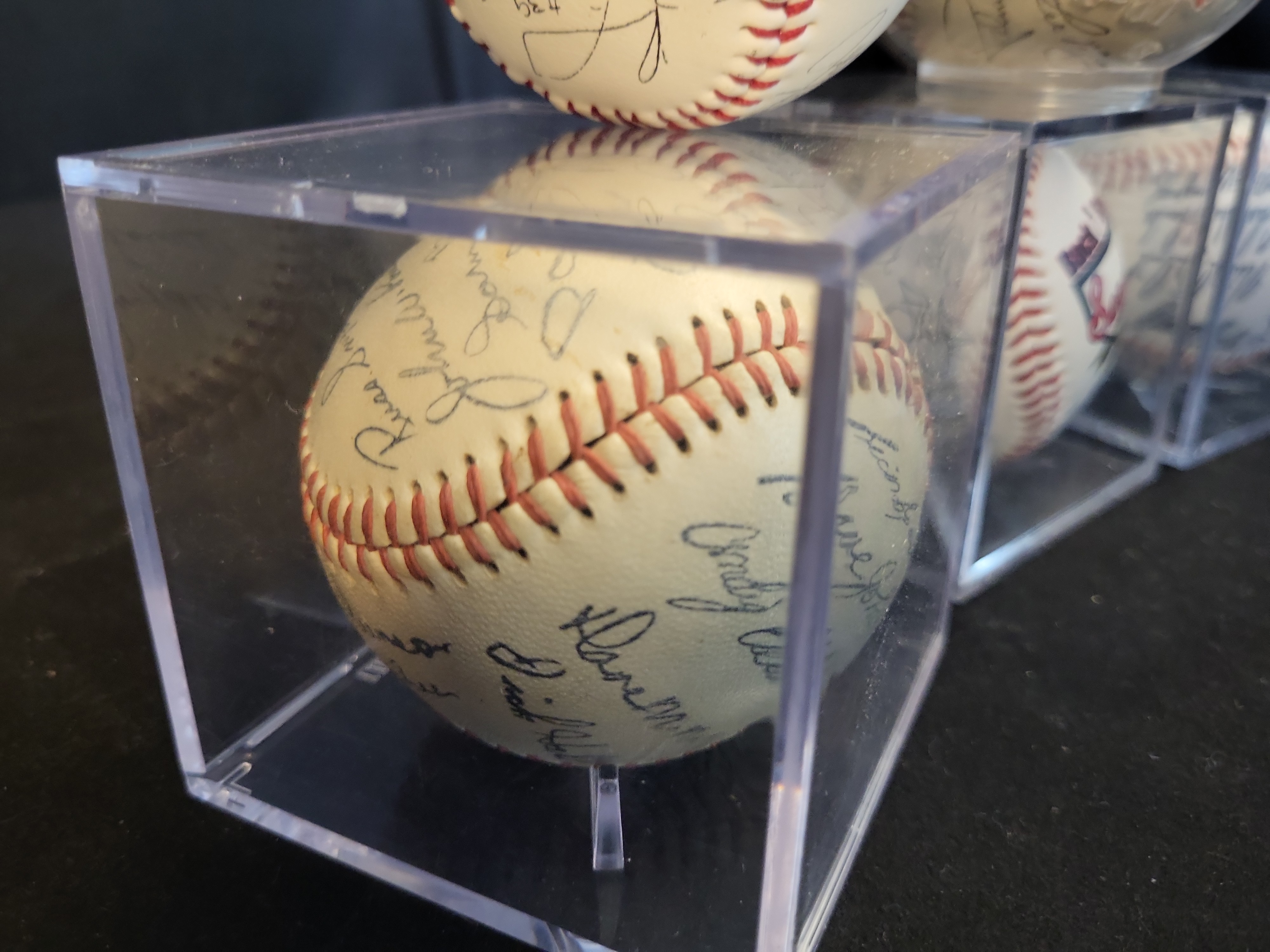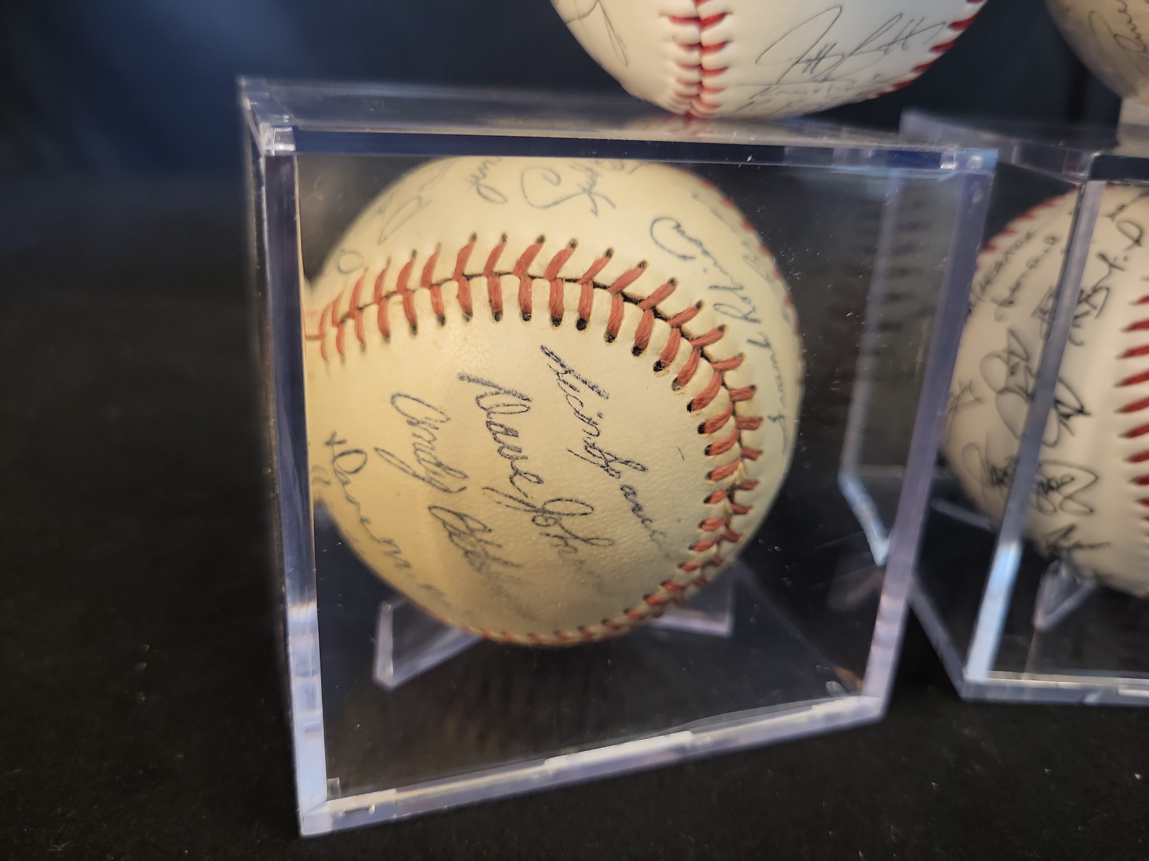 The baseballs exhibit varying degrees of age-related toning and natural yellowing of the covers. Signature quality ranges from bold to slightly faded, though the majority remain clear and legible. Five baseballs are housed in standard clear acrylic display cubes, and one is contained in a two-piece clear plastic sphere.