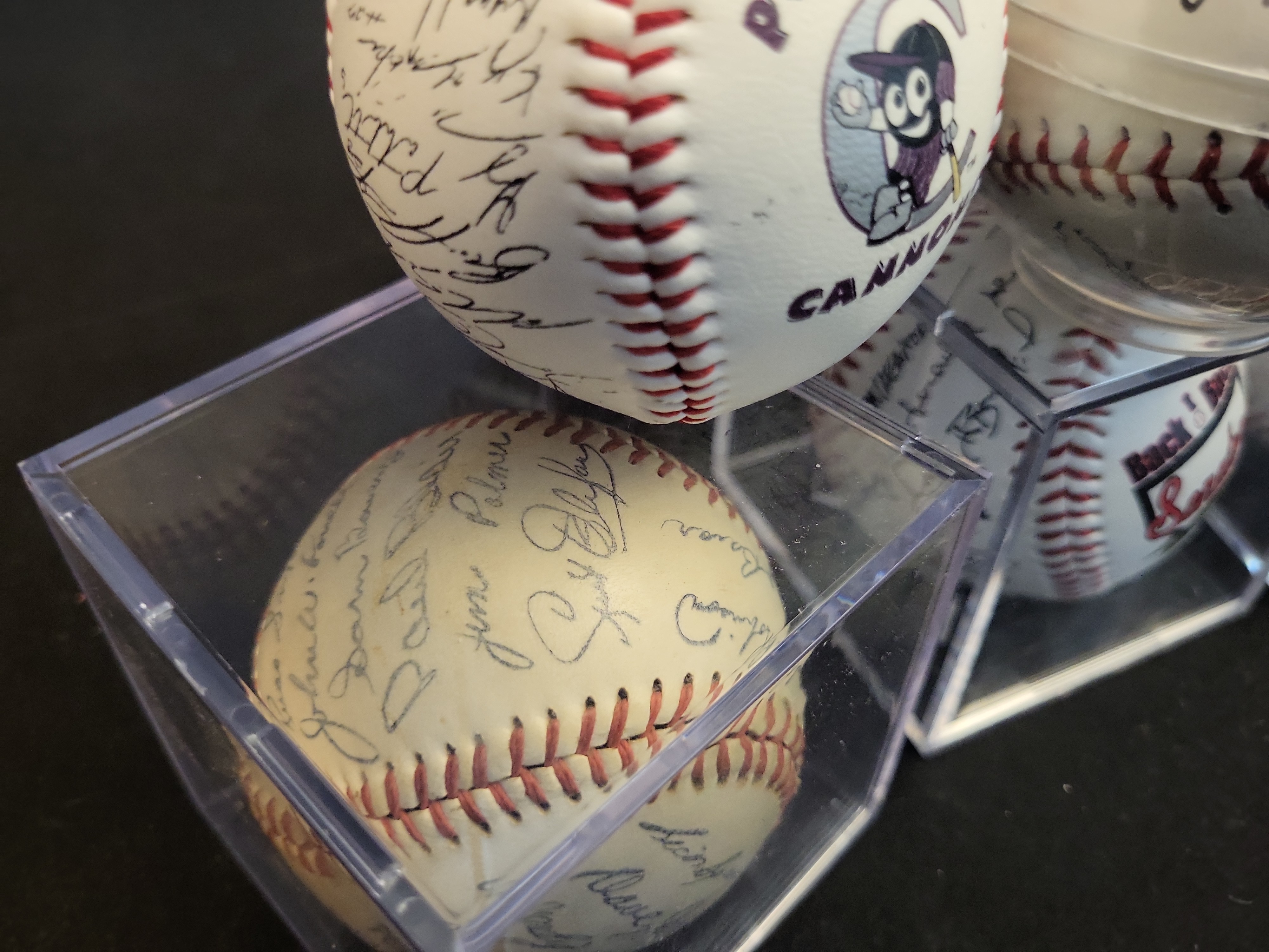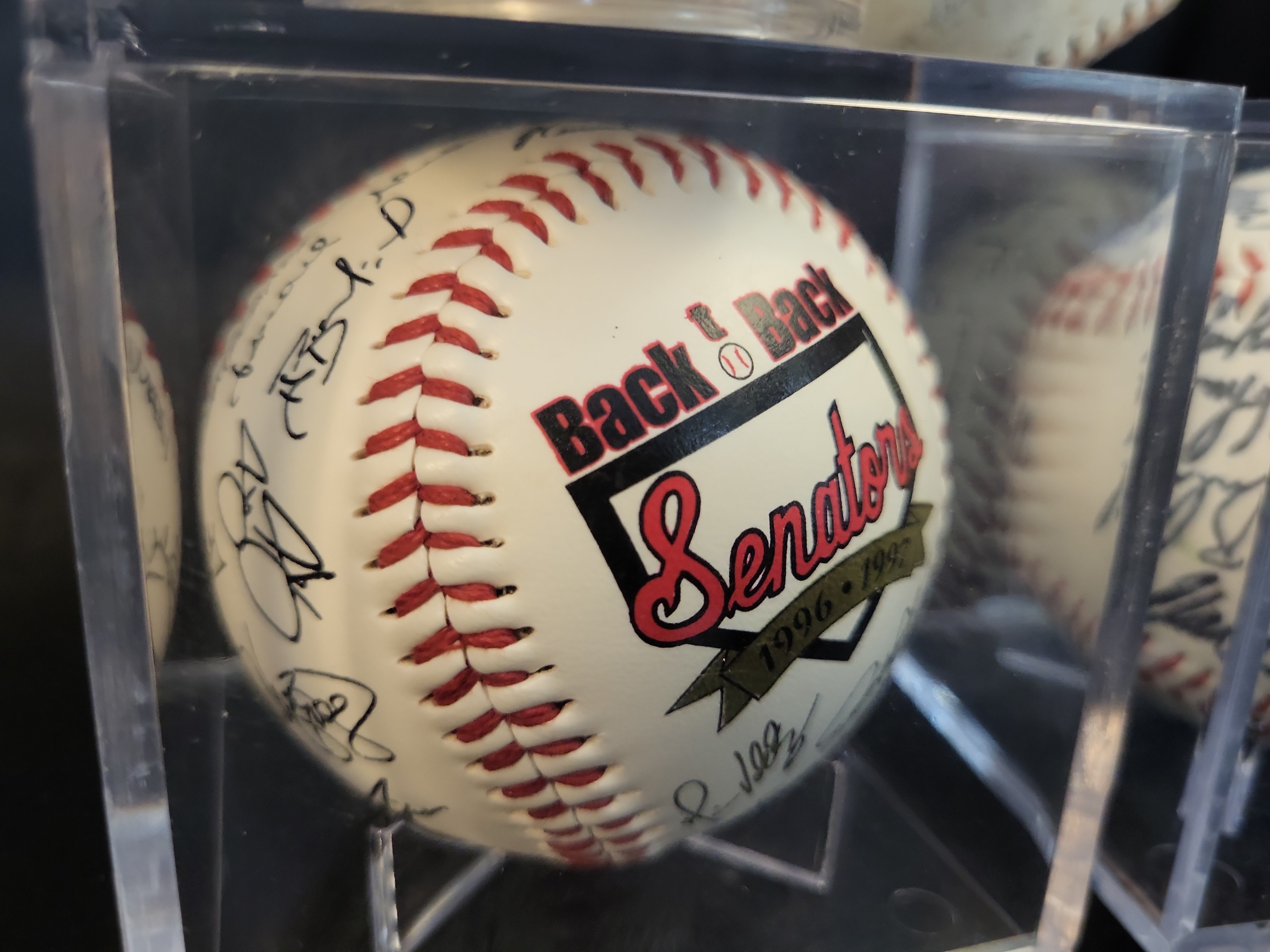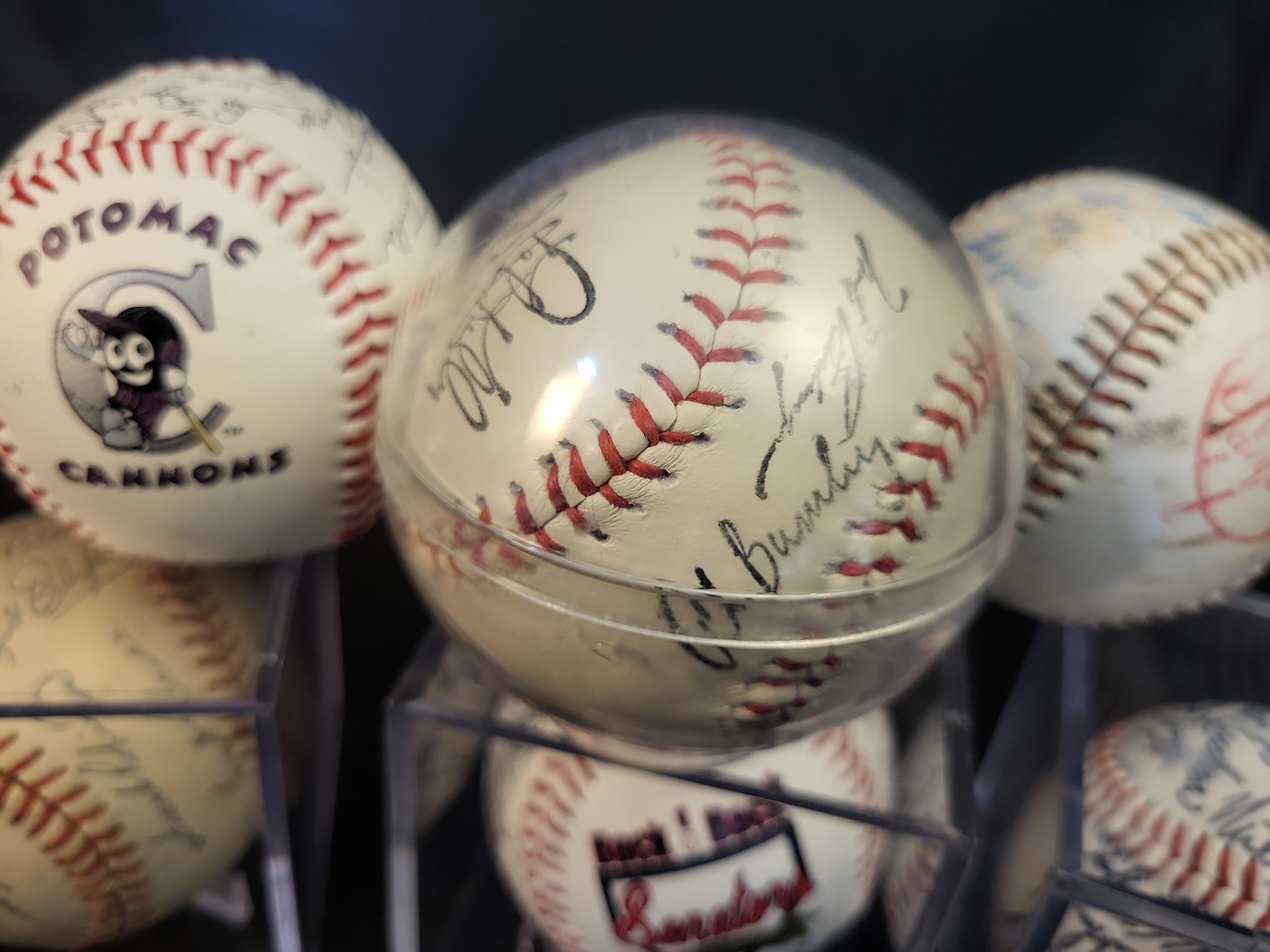 This lot features six autographed and commemorative baseballs primarily focused on Minor League Baseball history and various professional players. The collection includes a Potomac Cannons team-signed ball featuring the vintage mascot logo from the mid-1990s High-A era. Also included is a Harrisburg Senators commemorative ball celebrating their 1996-1997 Back-to-Back Eastern League Championships, multi-signed by roster members. A notable professional multi-signed ball contains approximately 15 to 20 signatures, including legible autographs from MLB pitcher Andy Ashby, Dave Johnson, and Rick Burleson. The lot is completed by a Collectors Edition multi-signed ball, a team-signed style ball in a spherical display featuring a signature resembling Ed Barney, and a multi-signed ball with a red circular stamped logo. These items are souvenir-grade commemorative balls and are not game-used. No formal third-party authentication from PSA/DNA, JSA, or Beckett is provided.