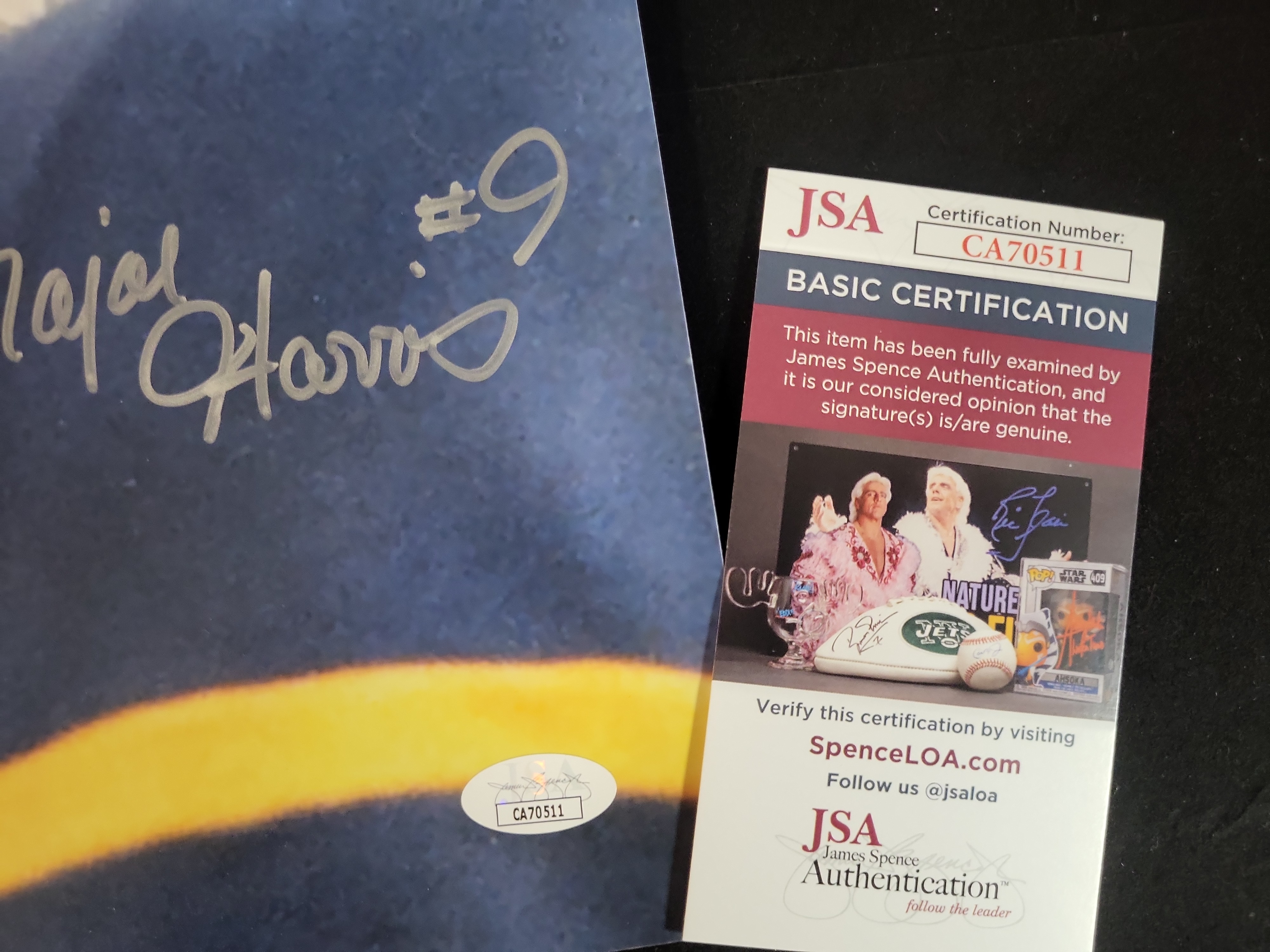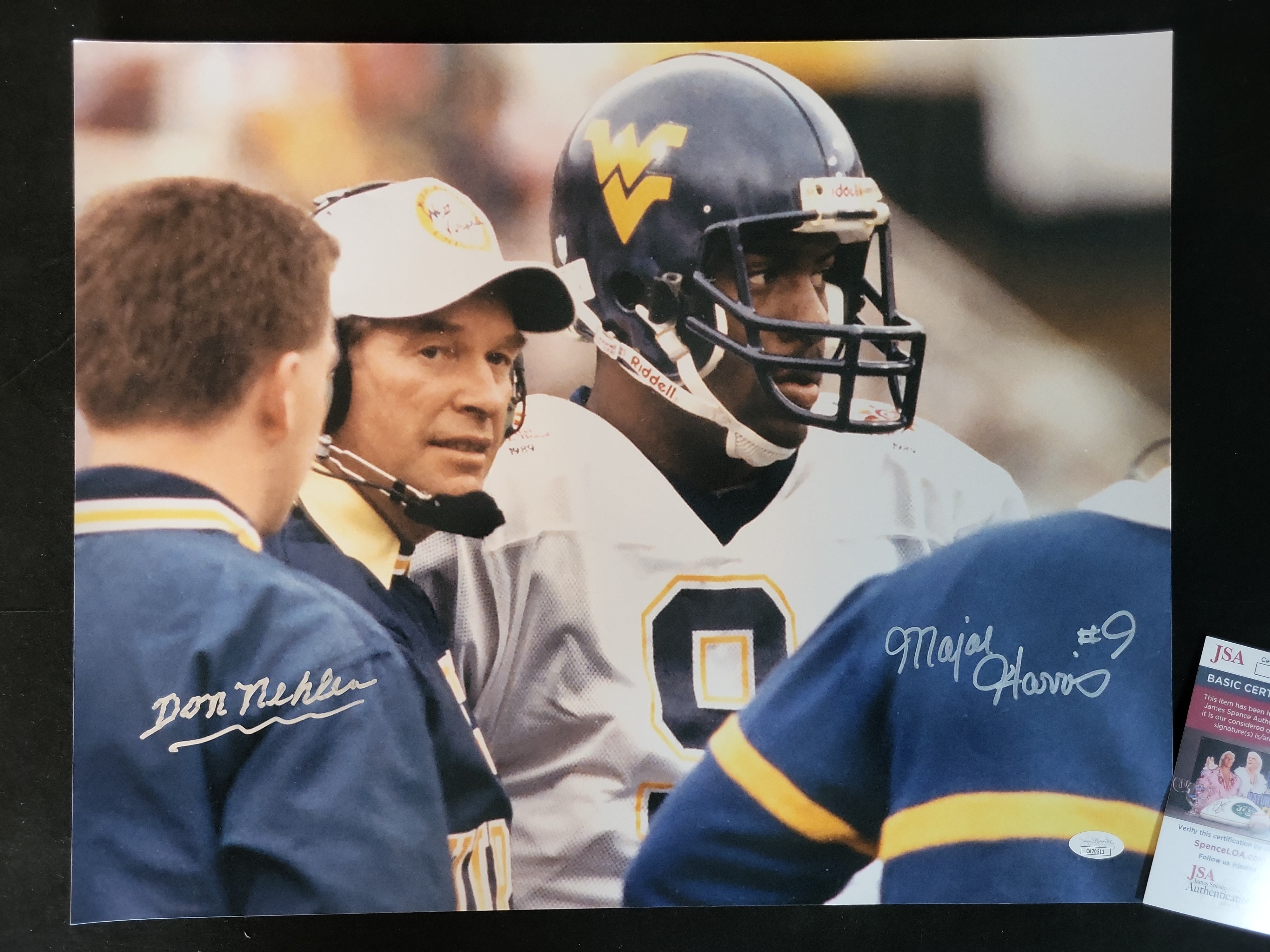 This high-quality color photograph features two legendary figures of West Virginia University (WVU) Mountaineers football history: Hall of Fame head coach Don Nehlen and star quarterback Major Harris. The image captures a classic sideline moment from the late 1980s, depicting Coach Nehlen with a headset appearing to relay a play to Harris, who is seen in his iconic blue and gold "WV" helmet. The photograph is dual-signed in bold silver ink. Don Nehlen’s signature is positioned on the left, and Major Harris has signed on the right, including his jersey number "#9." This item is fully authenticated by James Spence Authentication (JSA). It includes a JSA Basic Certification card and a matching numbered tamper-evident sticker (Certification Number: CA70511) located on the bottom right of the photograph.