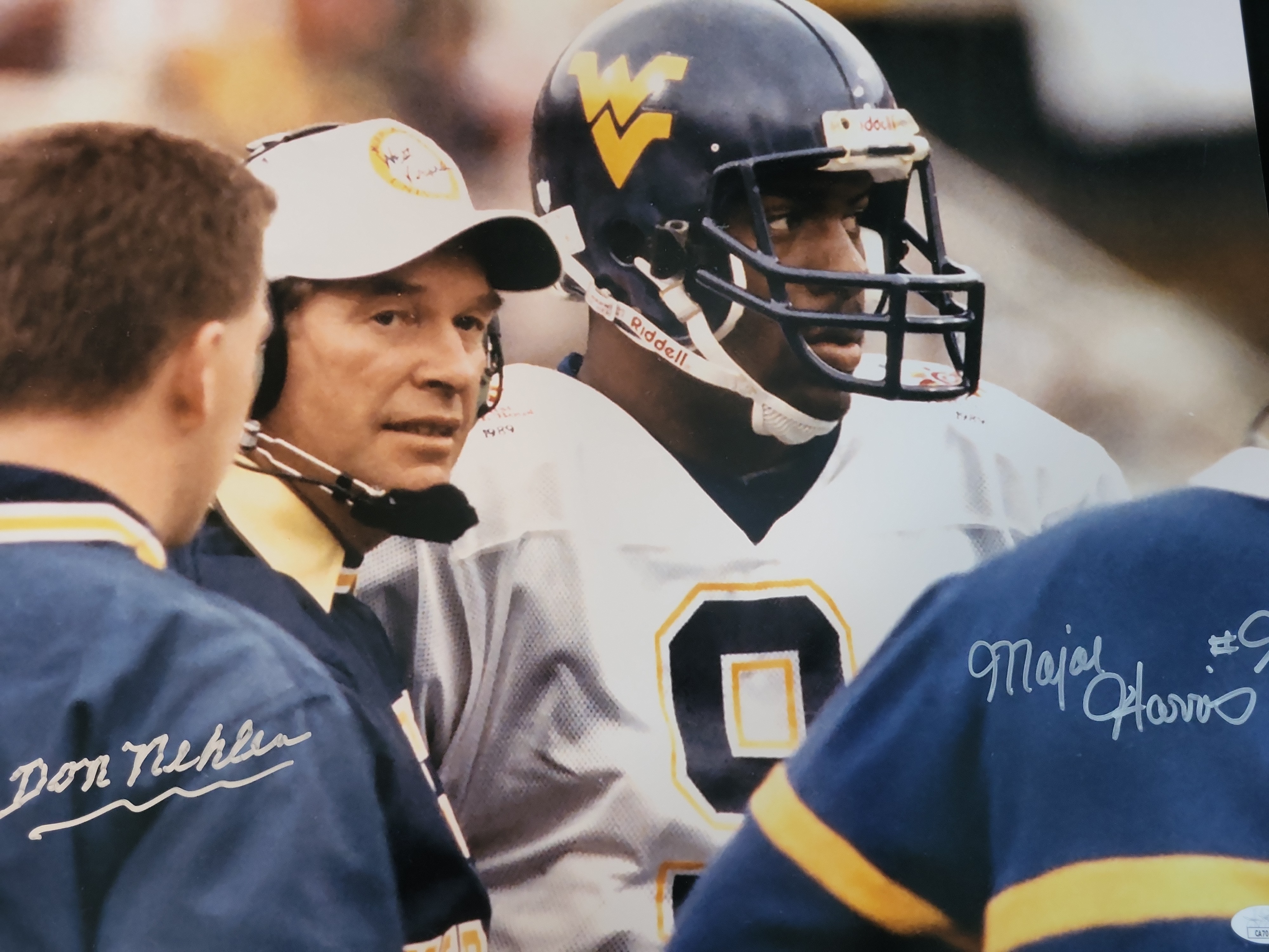 BID PER WHAT YOU SEE IN THE PHOTO, NOT THE AI GENERATED TITLES AND DESCRIPTIONS! Don Nehlen and Major Harris Dual-Signed West Virginia University Photograph, JSA Authenticated