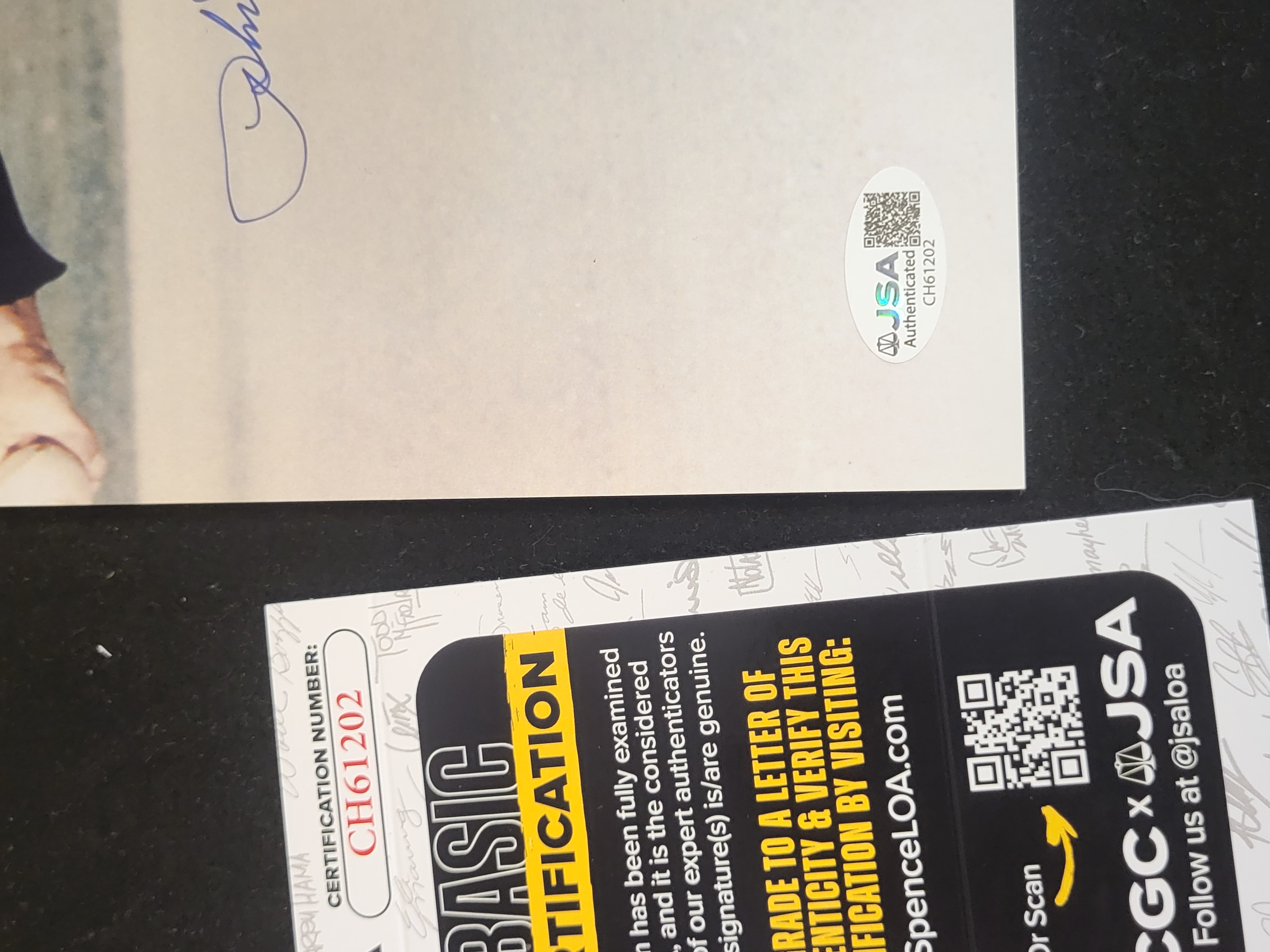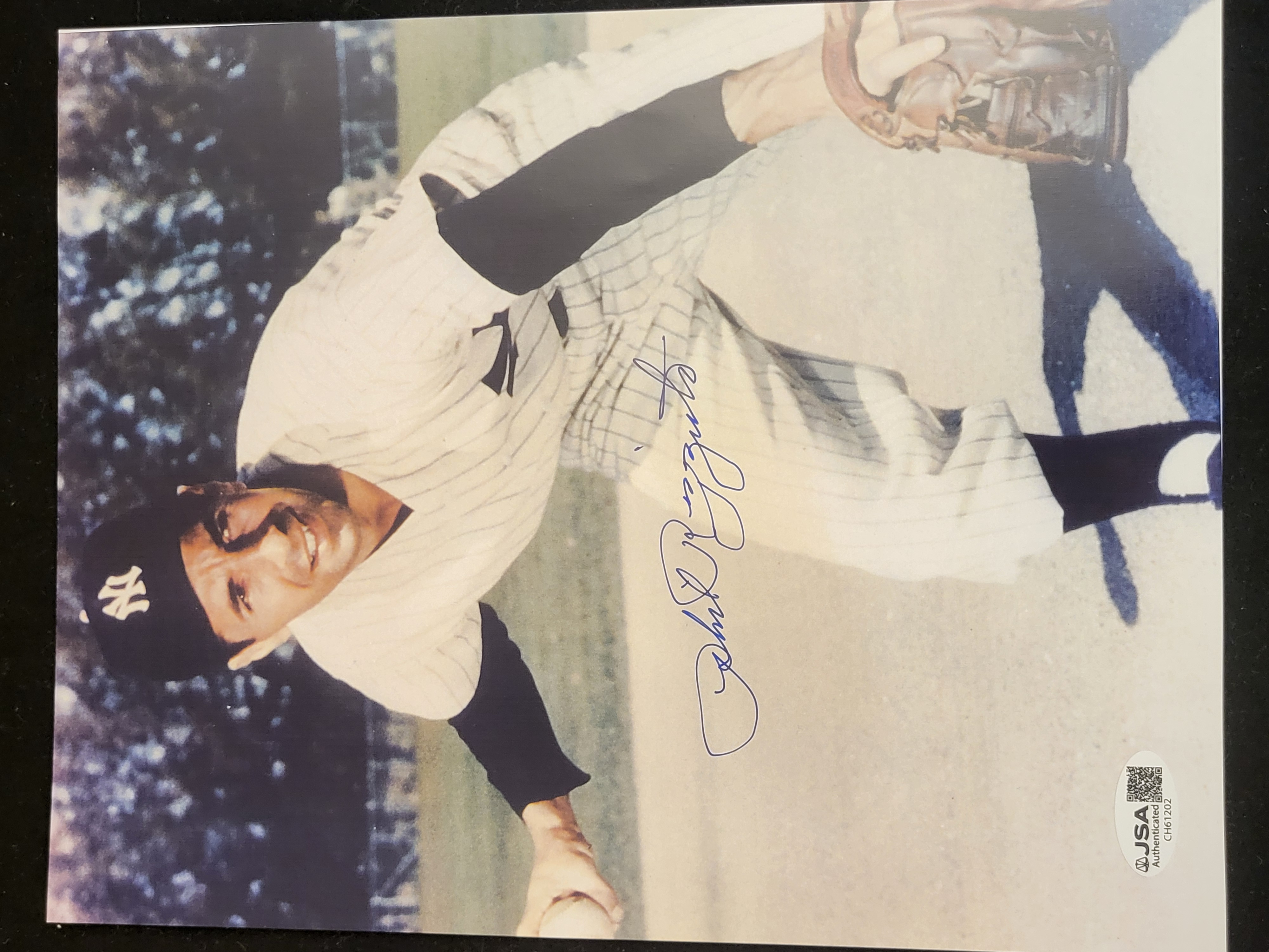 This lot features a color photographic print of New York Yankees Hall of Famer Phil Rizzuto. The subject is depicted in a full pinstripe uniform and team cap while in a defensive fielding pose. The photograph is signed across the center in blue ink by Phil Rizzuto. A James Spence Authentication (JSA) tamper-evident sticker, bearing certification number CH61202, is affixed to the lower right corner of the print. The lot is accompanied by a matching JSA Basic Certification card.