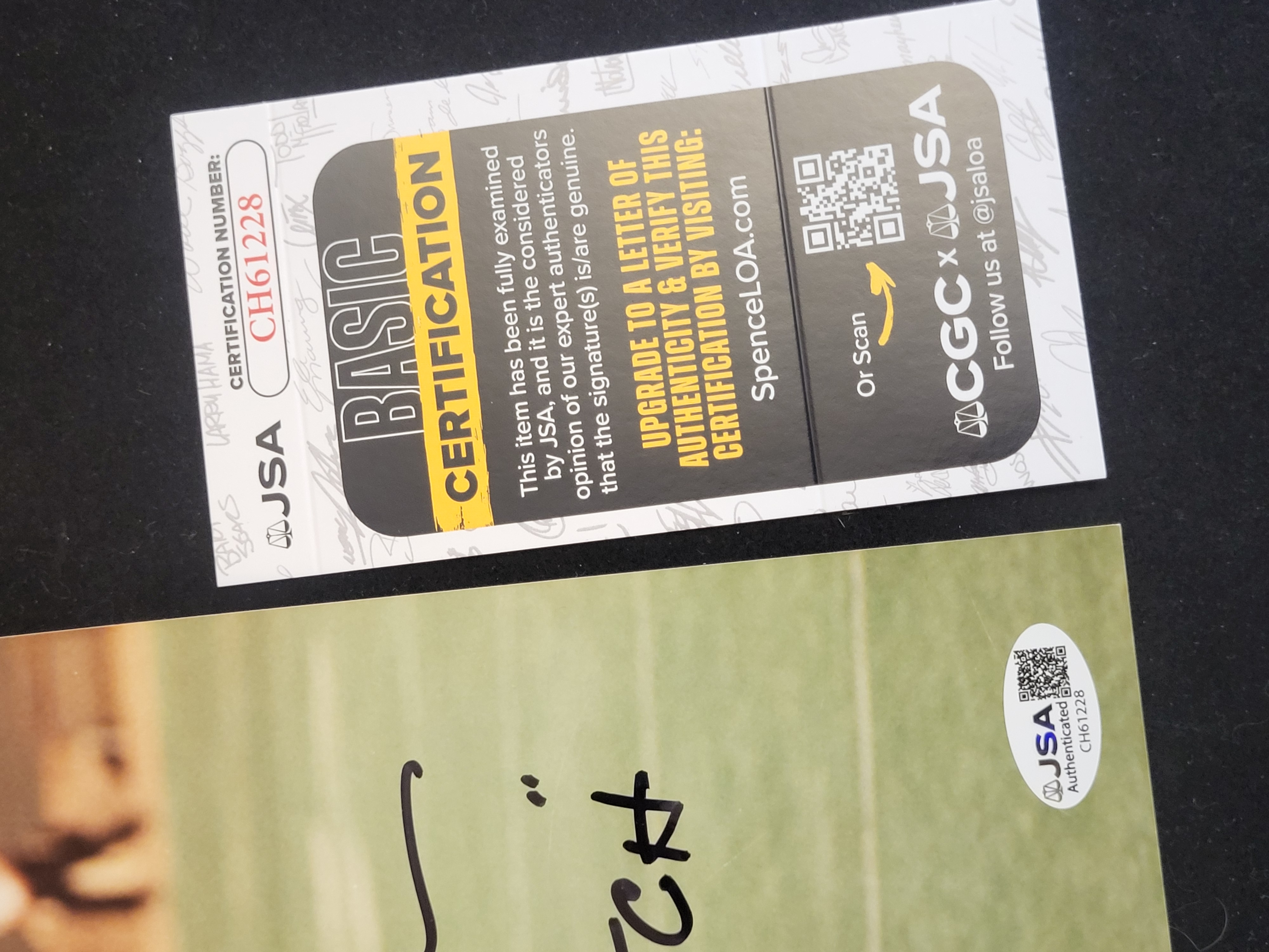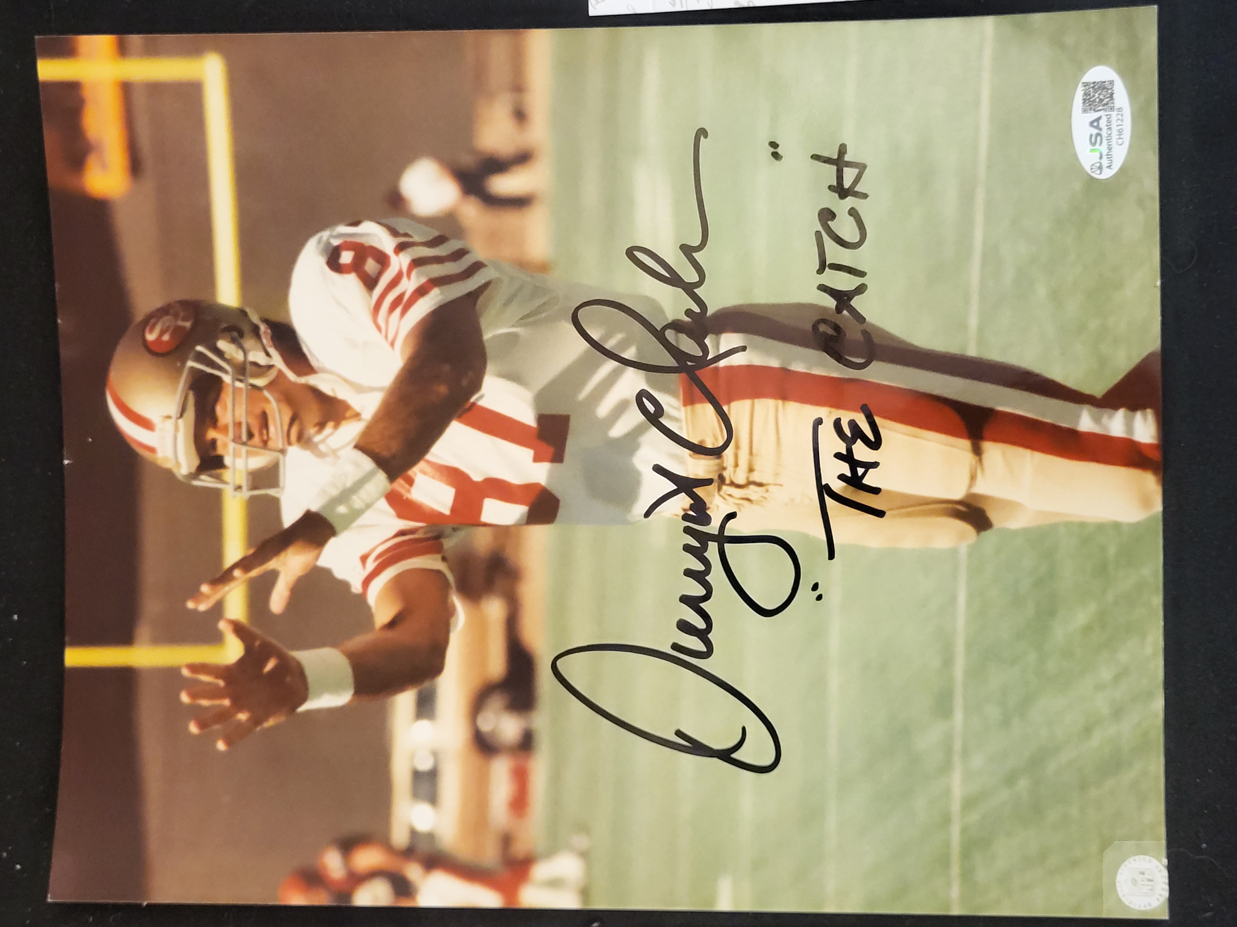 A color photograph depicting San Francisco 49ers wide receiver Dwight Clark during the play known as The Catch. The photograph is hand-signed in black ink by Dwight Clark and includes the handwritten inscription The Catch. The item is accompanied by a James Spence Authentication JSA Basic Certification card with a matching JSA hologram sticker bearing certification number CH61228 affixed to the upper right corner of the print. An official NFL holographic license sticker is located in the lower right corner.