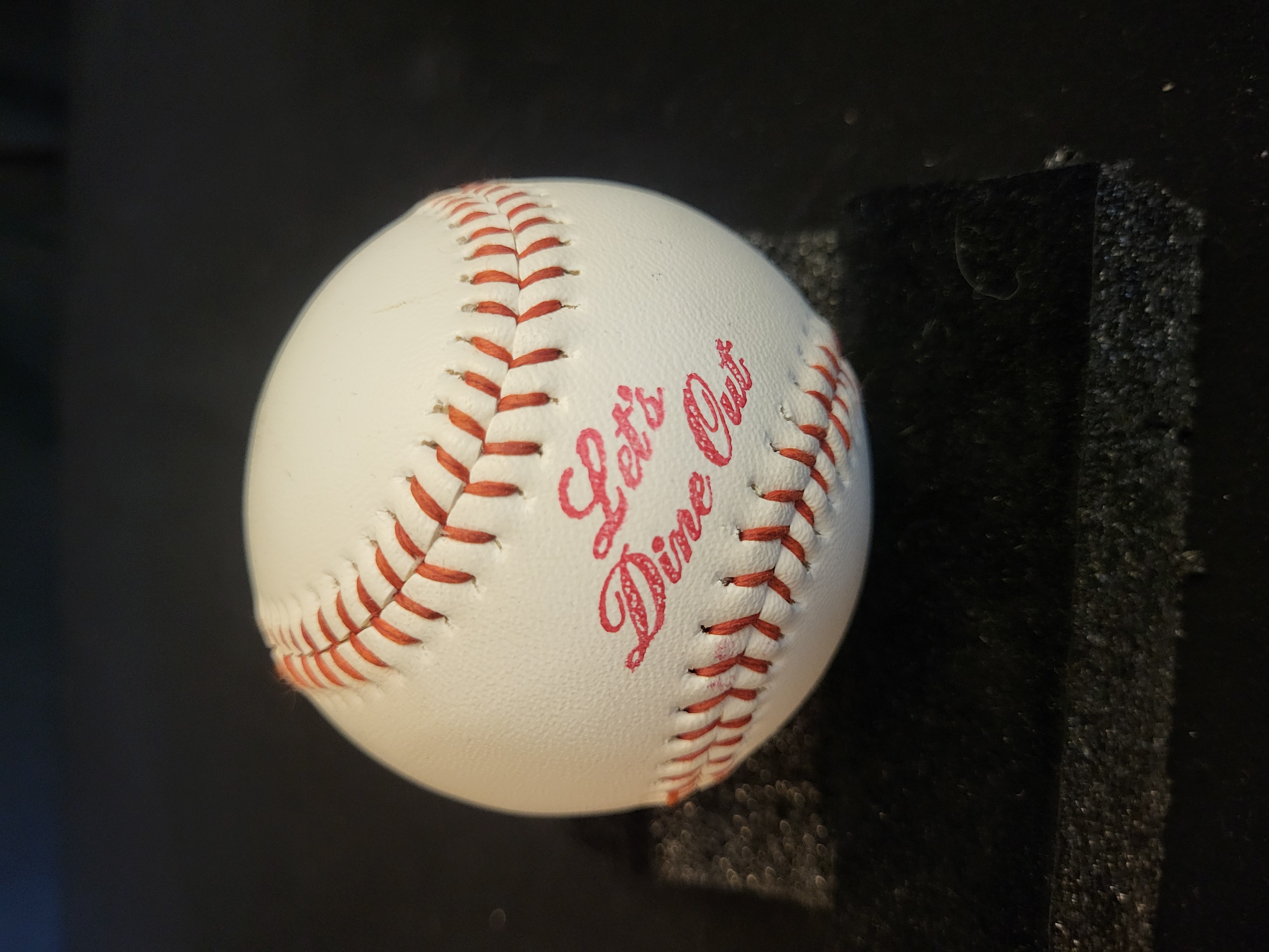 A Spalding brand SBP model baseball featuring a white synthetic cover and red stitching. The ball is manufactured with a cork rubber center as indicated by the technical markings on the surface. One panel displays the Angels team logo and name printed in red. An adjacent panel features the phrase Let’s Dine Out in red cursive script. The ball bears a personalized inscription and signature in blue ink that reads To John, Mean Gene Autry.