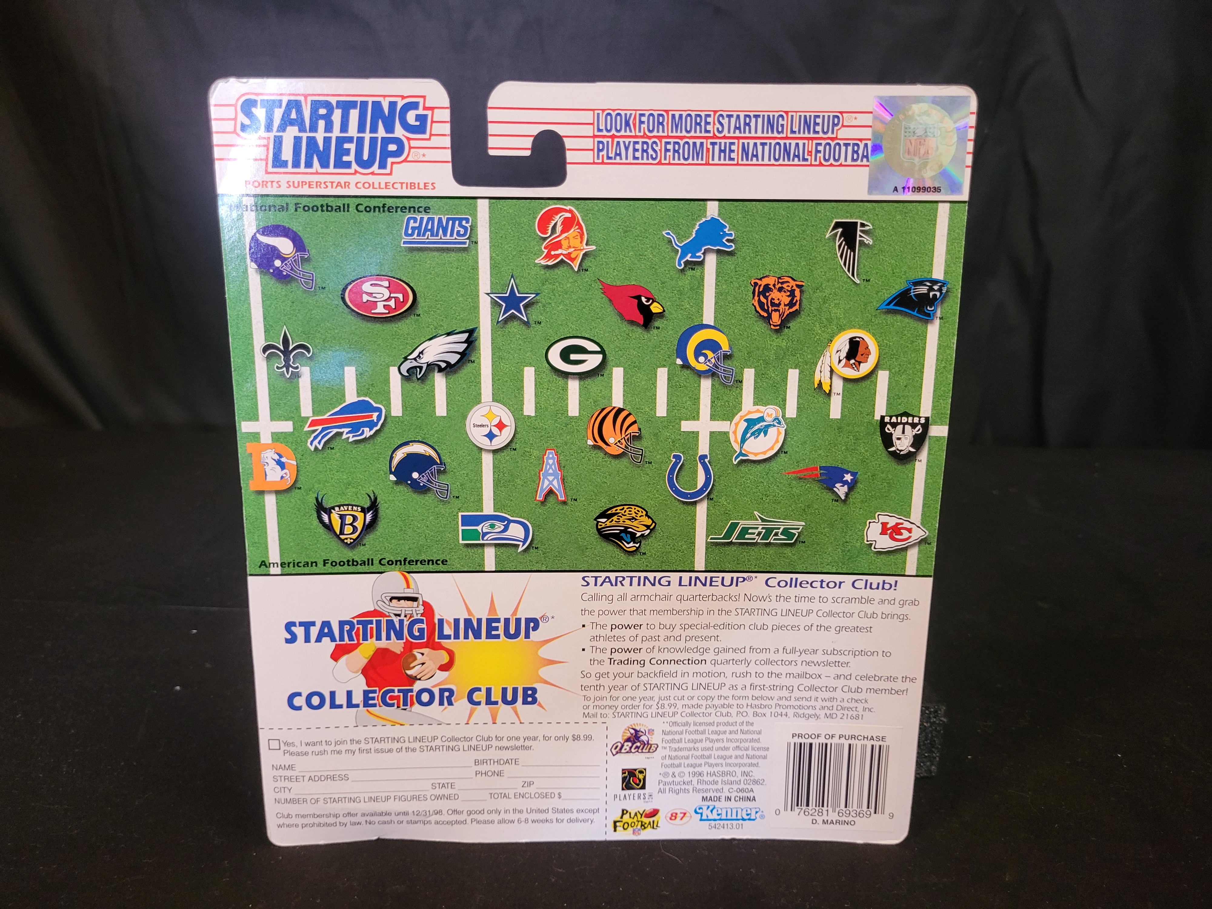 This 1997 edition Starting Lineup sports collectible features NFL quarterback Dan Marino of the Miami Dolphins. Produced by Kenner as part of the 10th Year Edition series, the set includes a poseable plastic action figure wearing a teal and white Dolphins uniform with the number 13. The figure is accompanied by a detachable helmet and a matching collector trading card. The item is housed in its original retail blister pack. The cardboard backing displays various NFL team logos and information regarding the Starting Lineup Collector Club on the reverse.