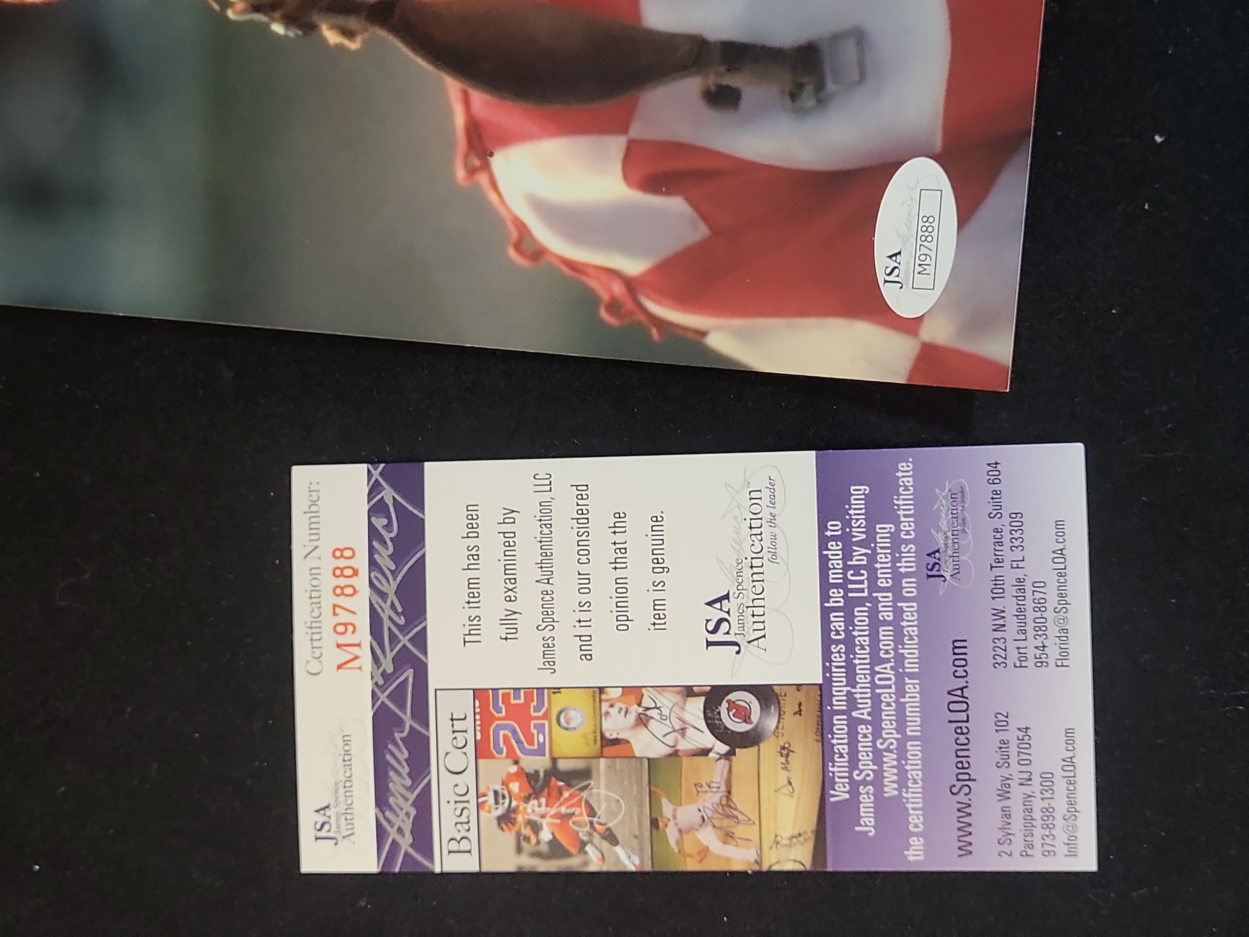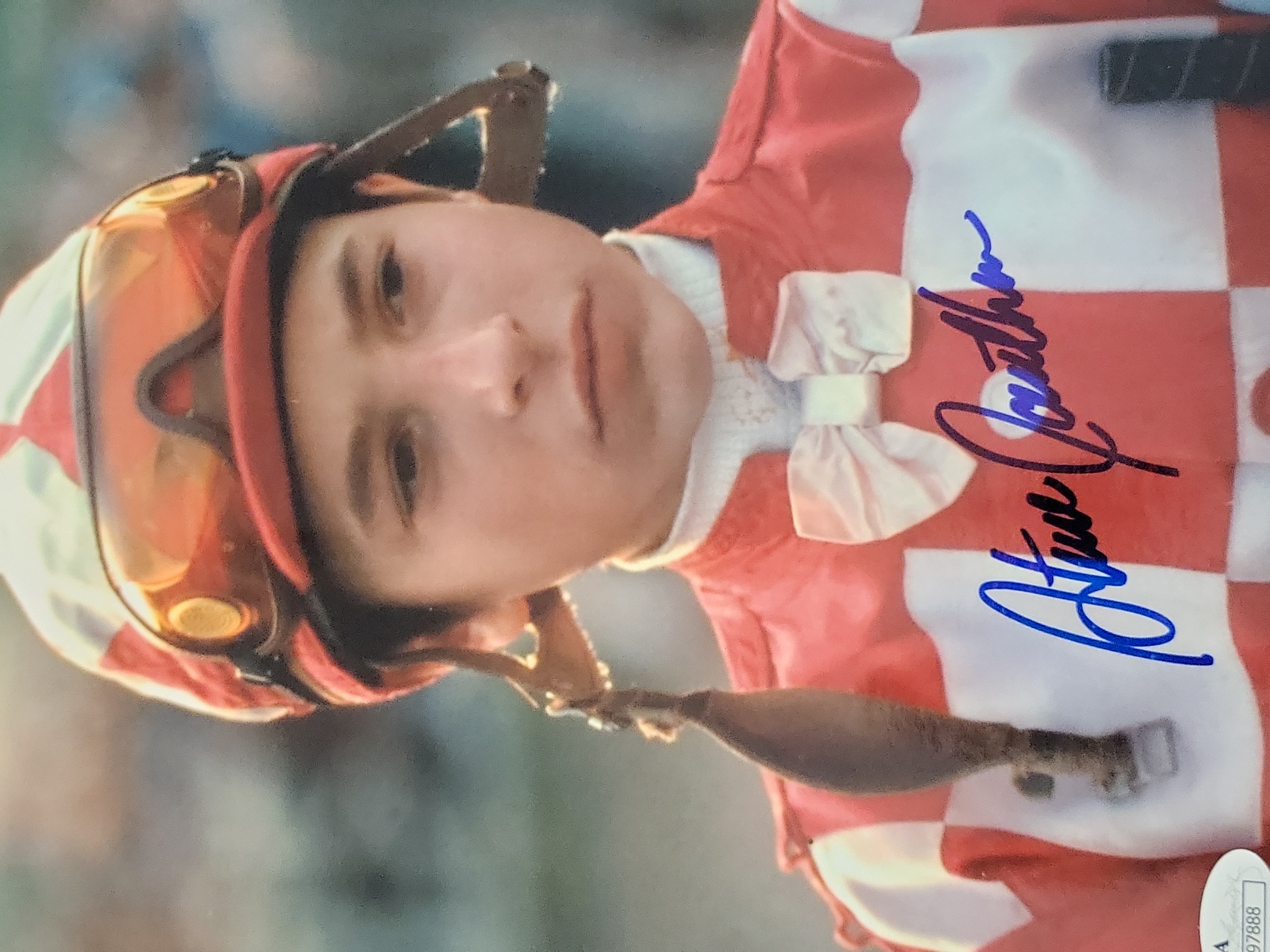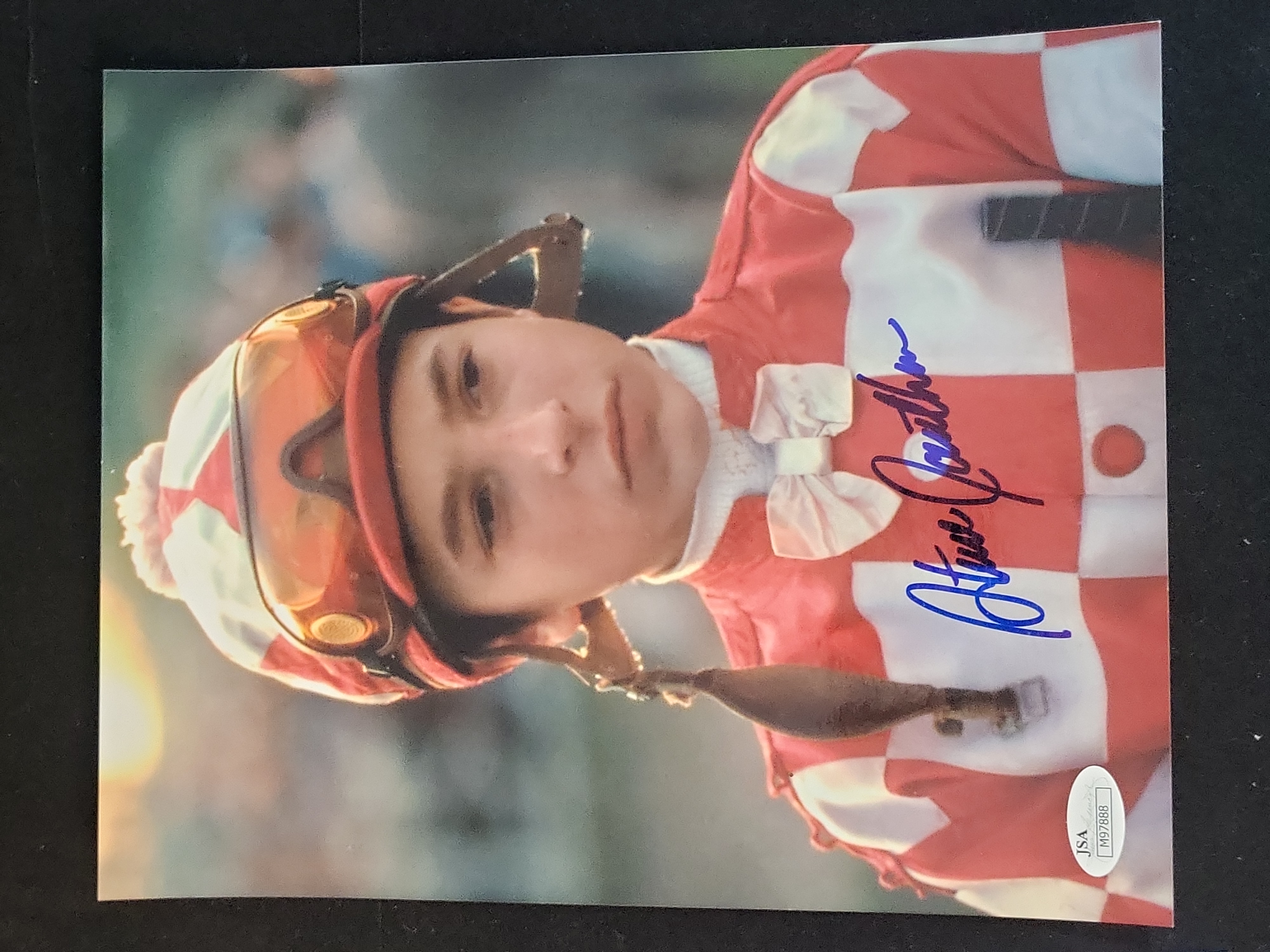 This lot features a professional color 8×10 photograph hand-signed by Hall of Fame jockey Steve Cauthen. Cauthen is a legendary figure in horse racing history, most notably recognized for piloting Affirmed to the Triple Crown in 1978, making him the youngest jockey to ever achieve the feat. The image captures Cauthen in his racing silks, helmet, and goggles. The autograph is rendered in bold blue felt-tip marker across the right side of the chest. This item has been professionally authenticated by James Spence Authentication (JSA). It is accompanied by a JSA Basic Cert card bearing certification number M97888. A matching, tamper-evident JSA sticker with the corresponding serial number is affixed to the bottom-right corner of the photograph to ensure a permanent chain of provenance.