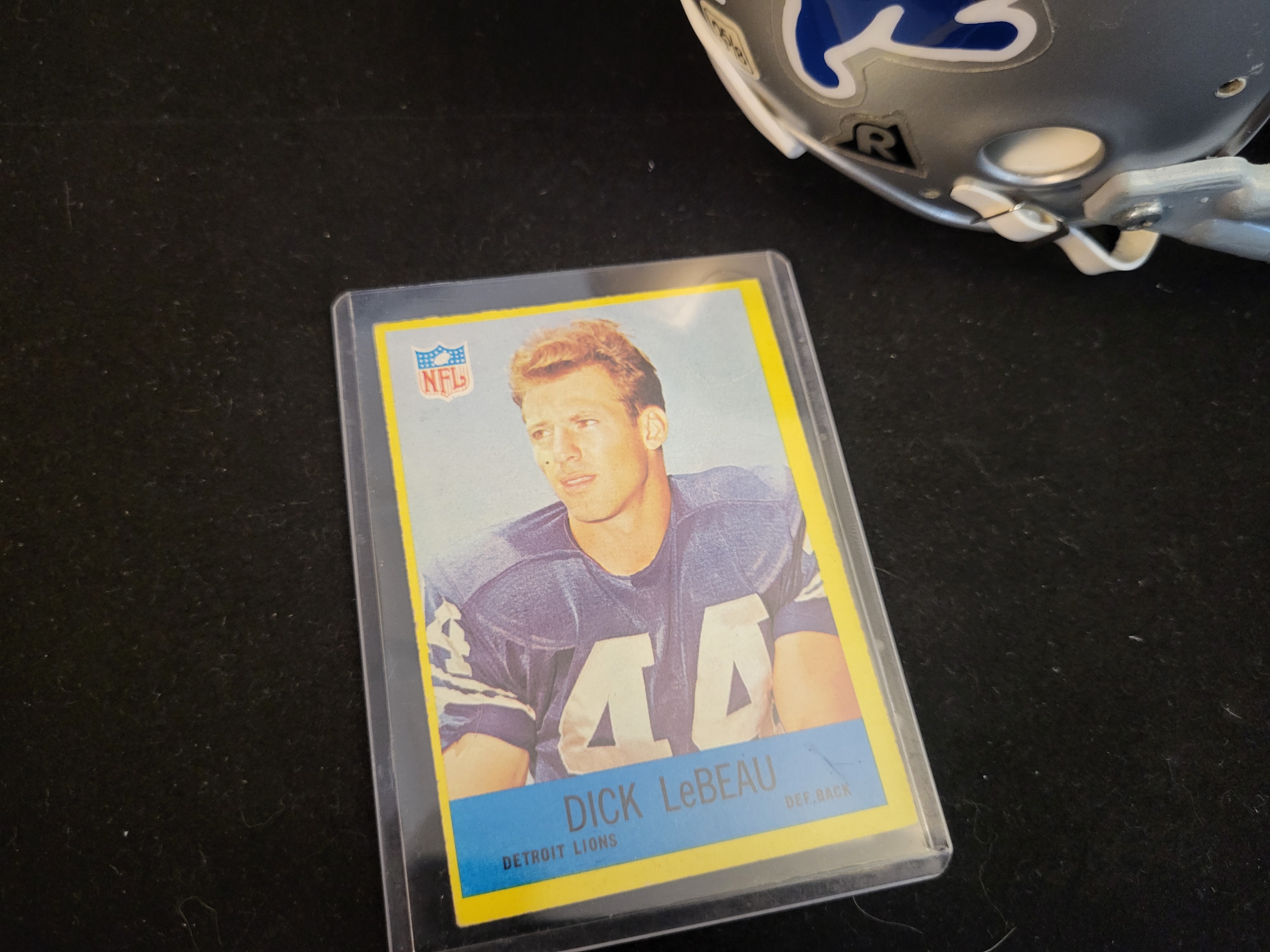 This lot consists of a miniature Riddell football helmet and a trading card featuring Detroit Lions defensive back Dick LeBeau. The silver and blue helmet displays the team lion logo on both sides and is signed on the crown in blue ink with the inscription Dick LeBeau HOF 2010. A Beckett Authenticated Autograph hologram with serial number BS25790 and a QR code is affixed to the rear of the helmet. The accompanying trading card depicts LeBeau in a Detroit Lions uniform, number 44, and is housed in a clear protective plastic sleeve.