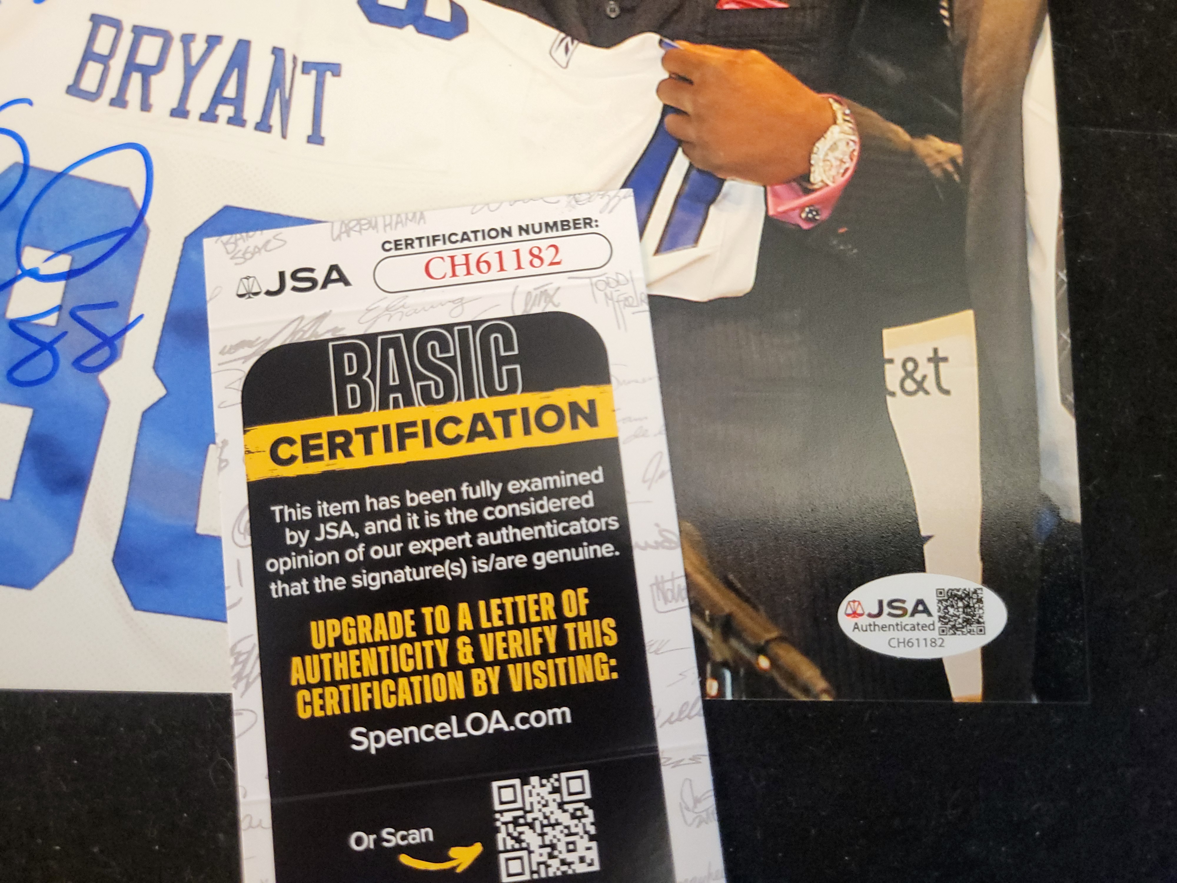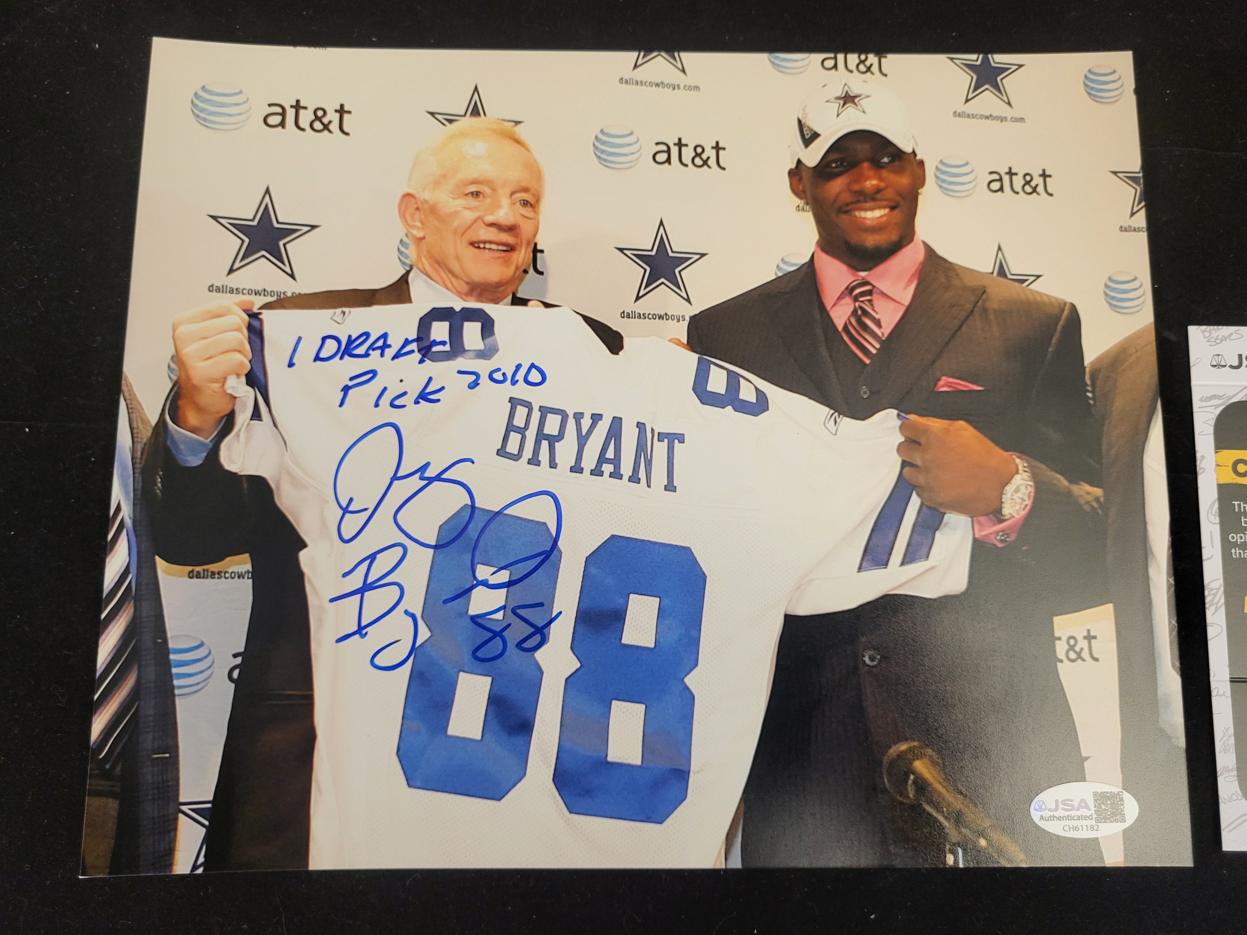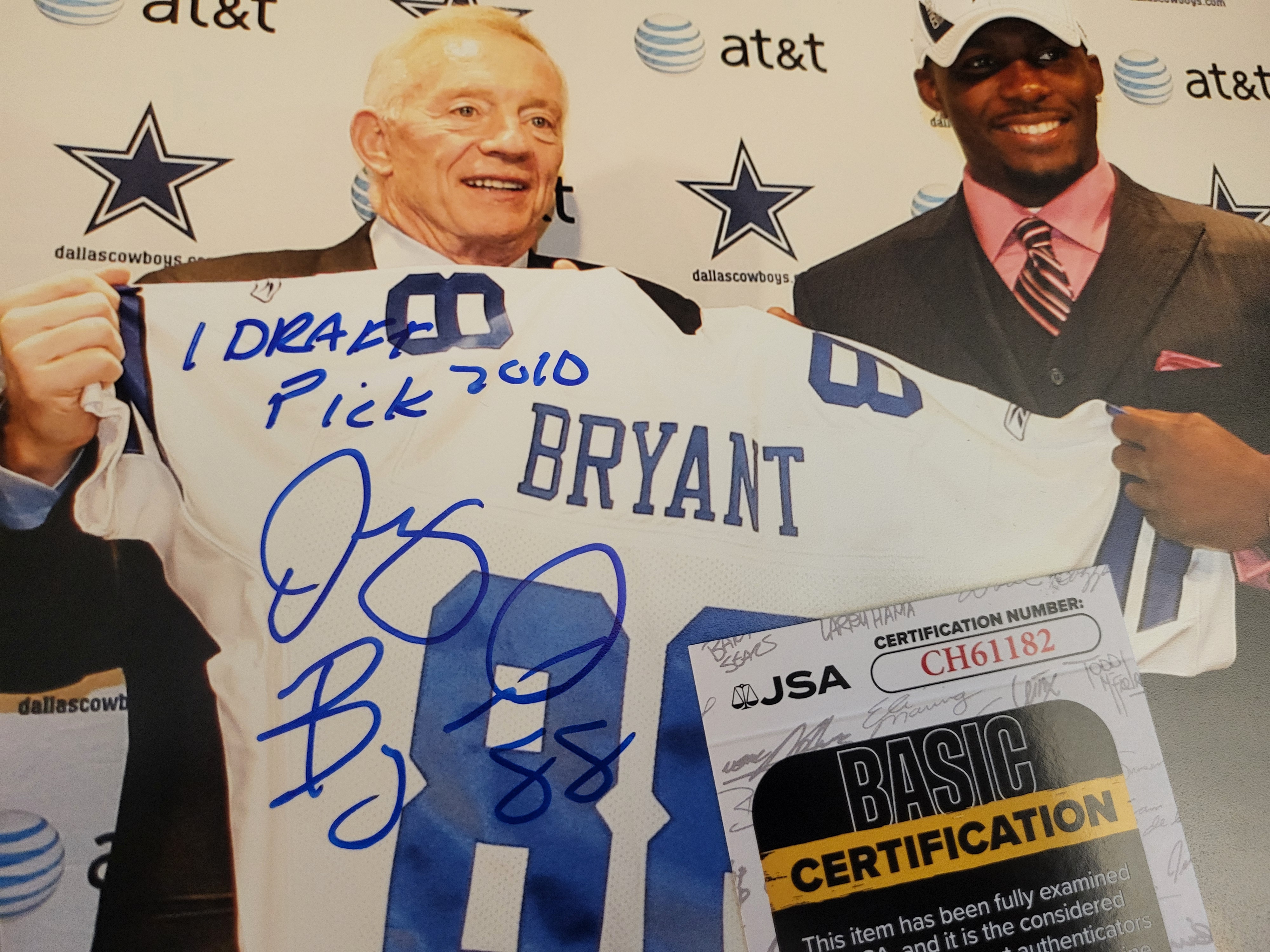 This autographed color photograph depicts Dallas Cowboys owner Jerry Jones and wide receiver Dez Bryant during the 2010 NFL Draft. The subjects are pictured holding a white Dallas Cowboys team jersey with BRYANT and 88 in blue. The photograph is signed in blue ink by Dez Bryant and includes the handwritten inscription 1 Draft Pick 2010 and the number 88. For authentication purposes, the item features a James Spence Authentication JSA sticker with certification number CH61182 in the lower-right corner. The photograph is accompanied by a corresponding JSA Basic Certification card. The piece is a glossy color photograph.