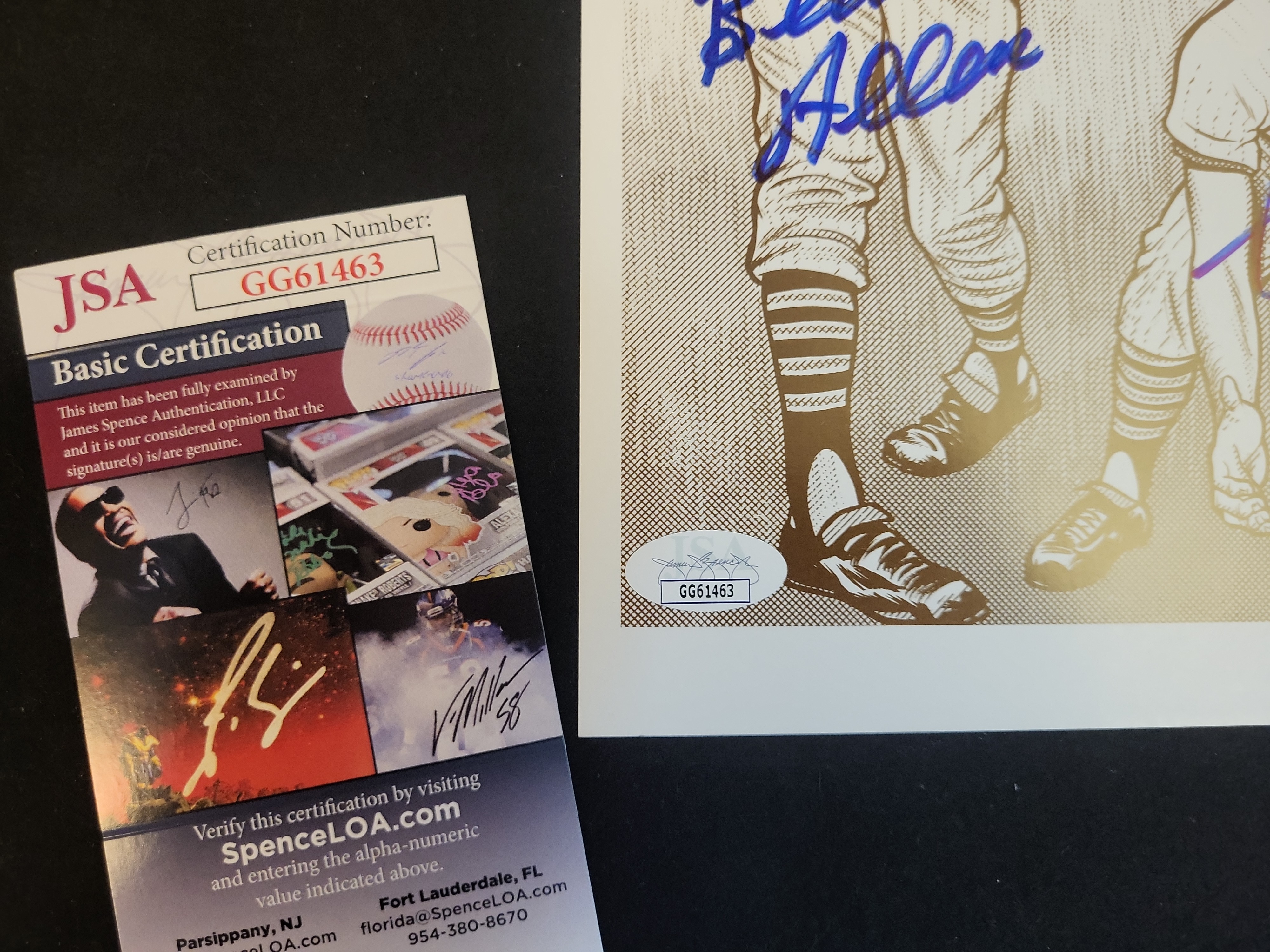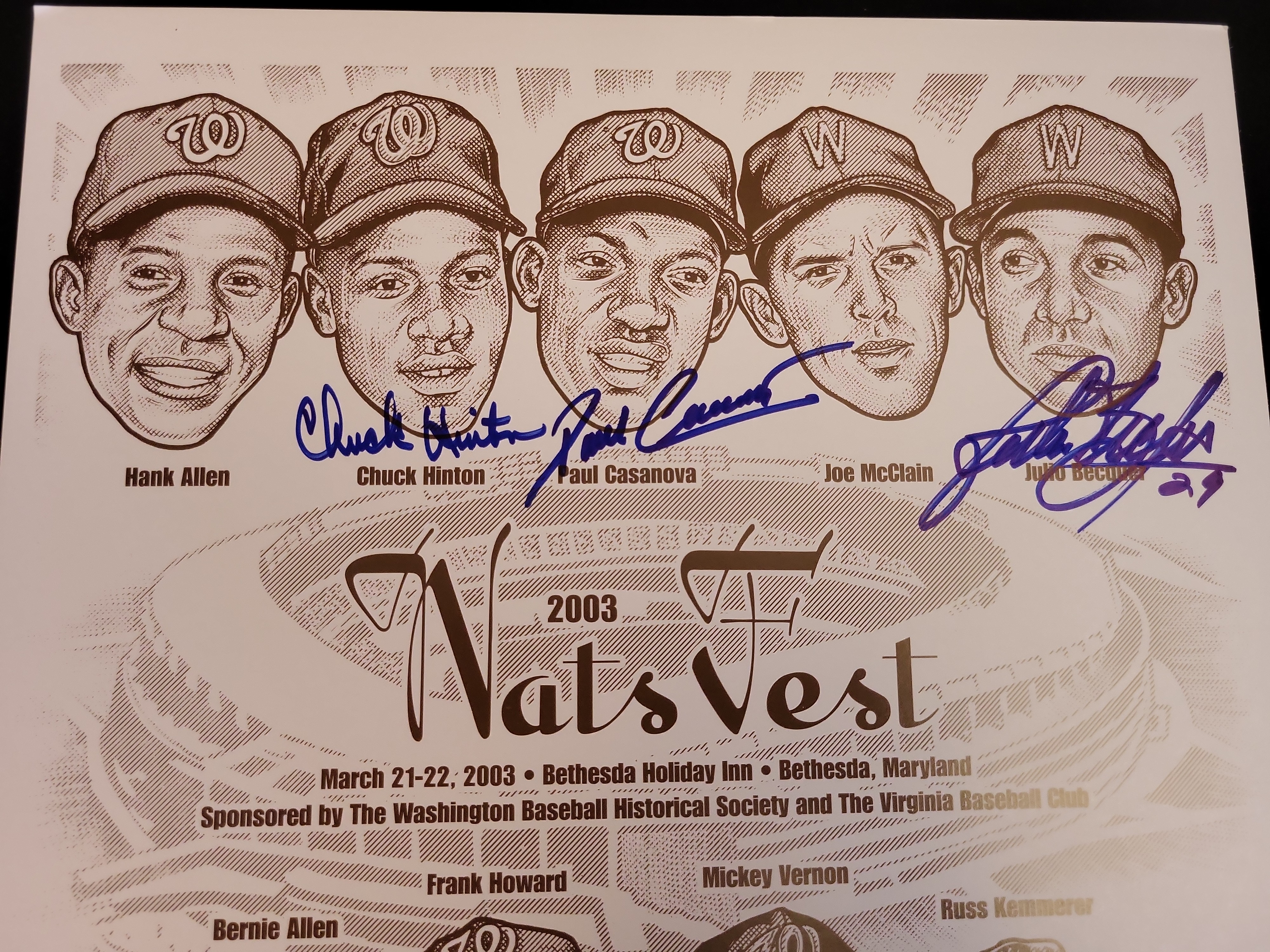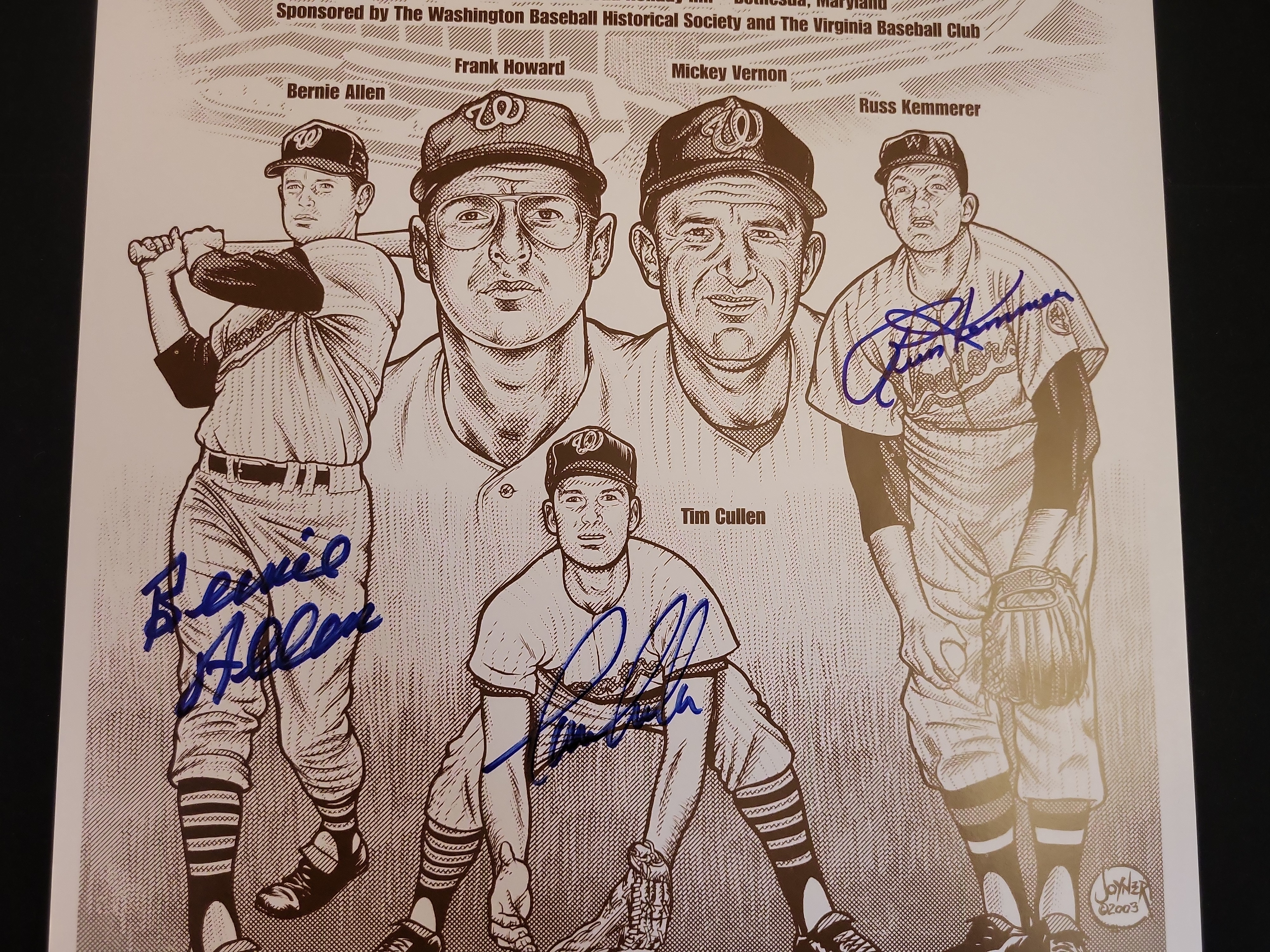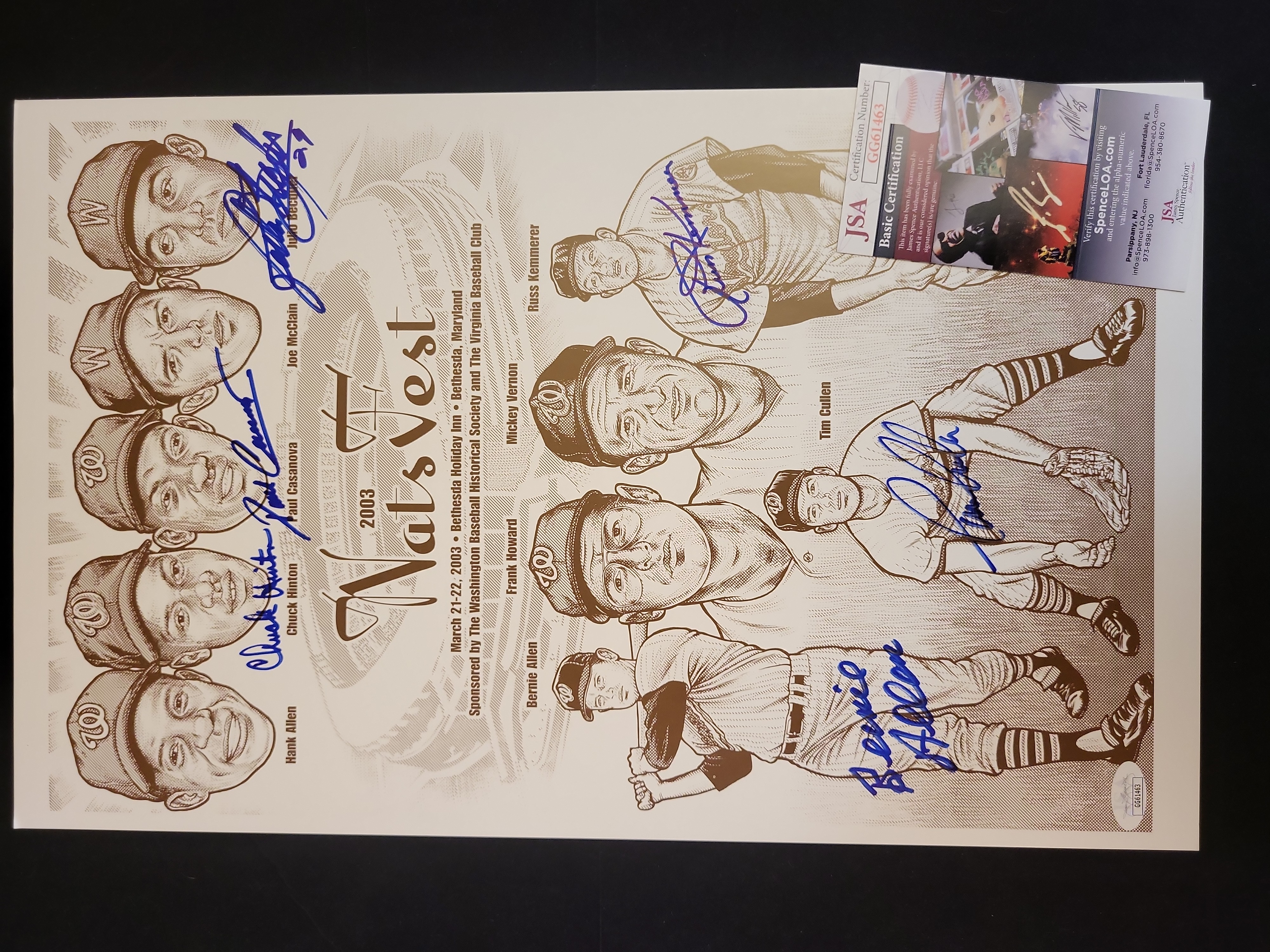 This multi-signed commemorative poster was issued for the 2003 Nats Vest event, held March 21-22, 2003, in Bethesda, Maryland. The event was sponsored by The Washington Baseball Historical Society and The Virginia Baseball Club. The poster features line art illustrations by artist Joyner (dated 2003) depicting ten notable players from Washington D.C. baseball history. This specific item features six authentic signatures in blue felt-tip ink from the following players: Bernie Allen, Russ Kemmerer, Tim Cullen, Chuck Hinton, Paul Casanova, and Julio Becquer (who included his jersey number 29). Other players pictured on the poster include Frank Howard, Mickey Vernon, Hank Allen, and Joe McClain. The item is fully authenticated by James Spence Authentication (JSA) with Basic Certification number GG61463. It includes the original JSA certification card and a matching tamper-evident sticker located in the bottom right corner of the poster.