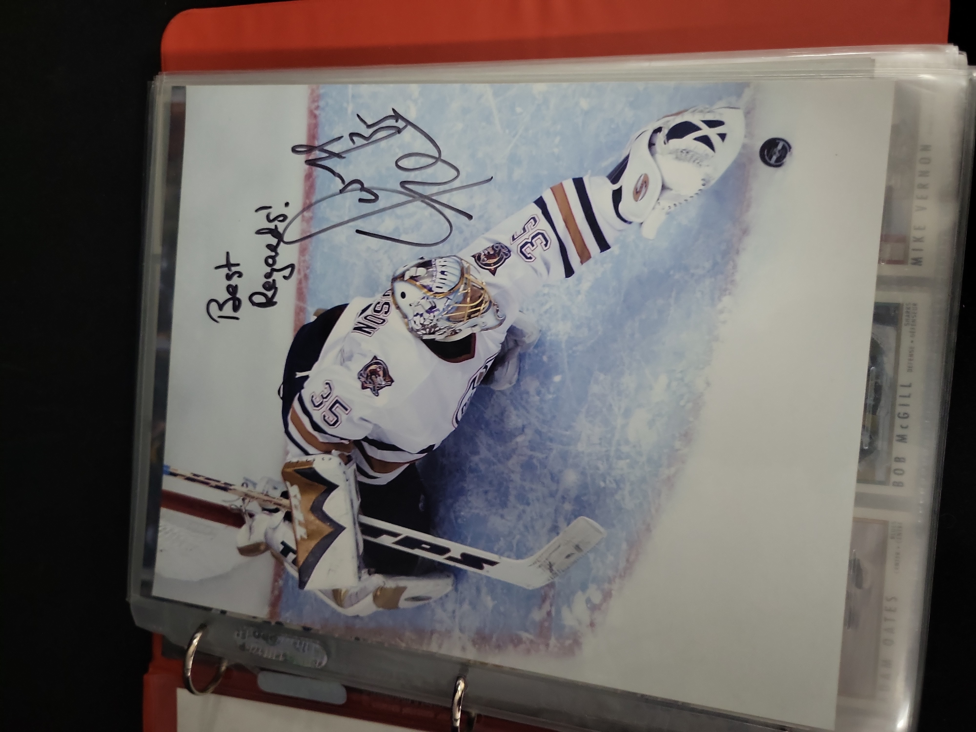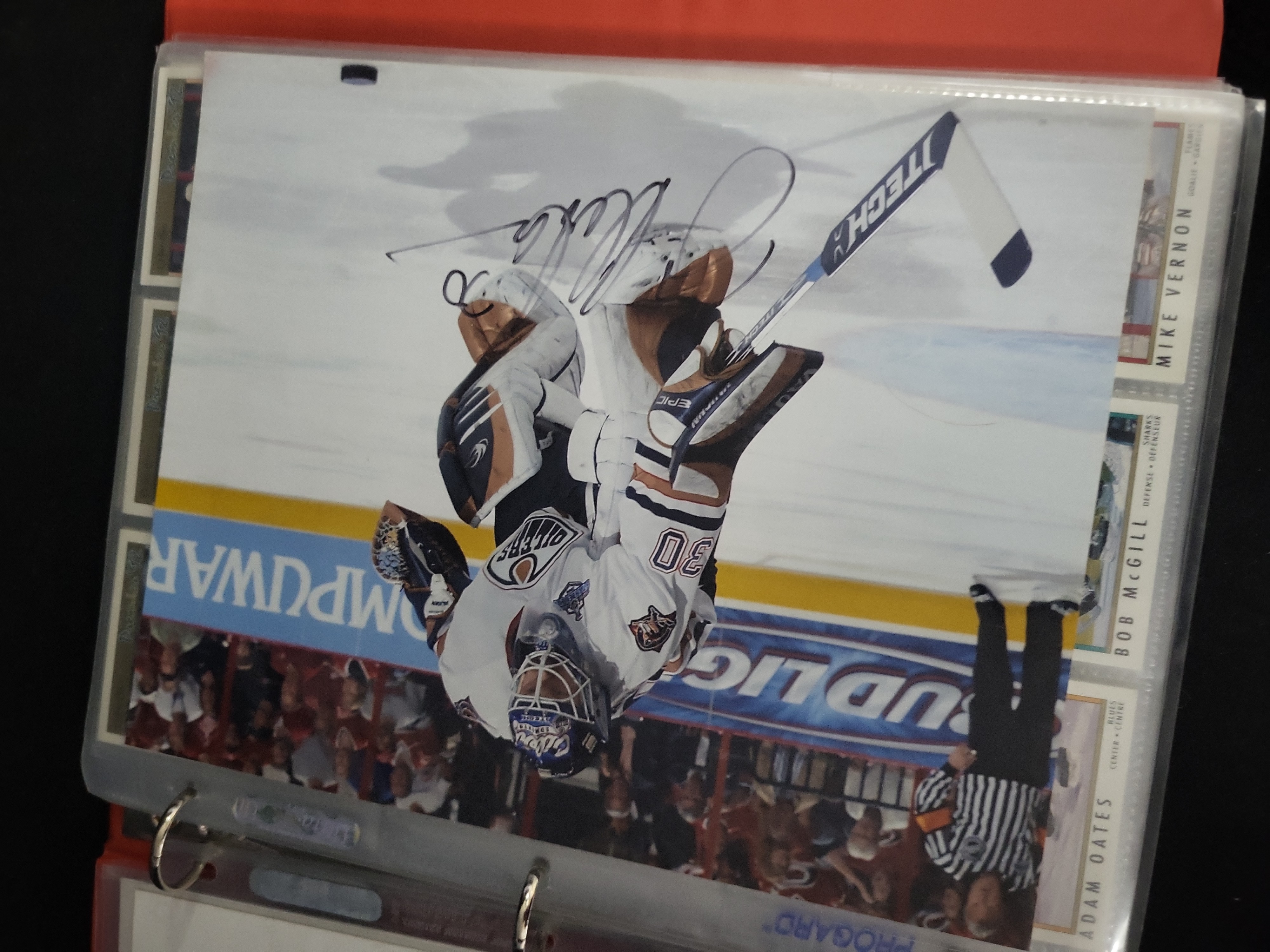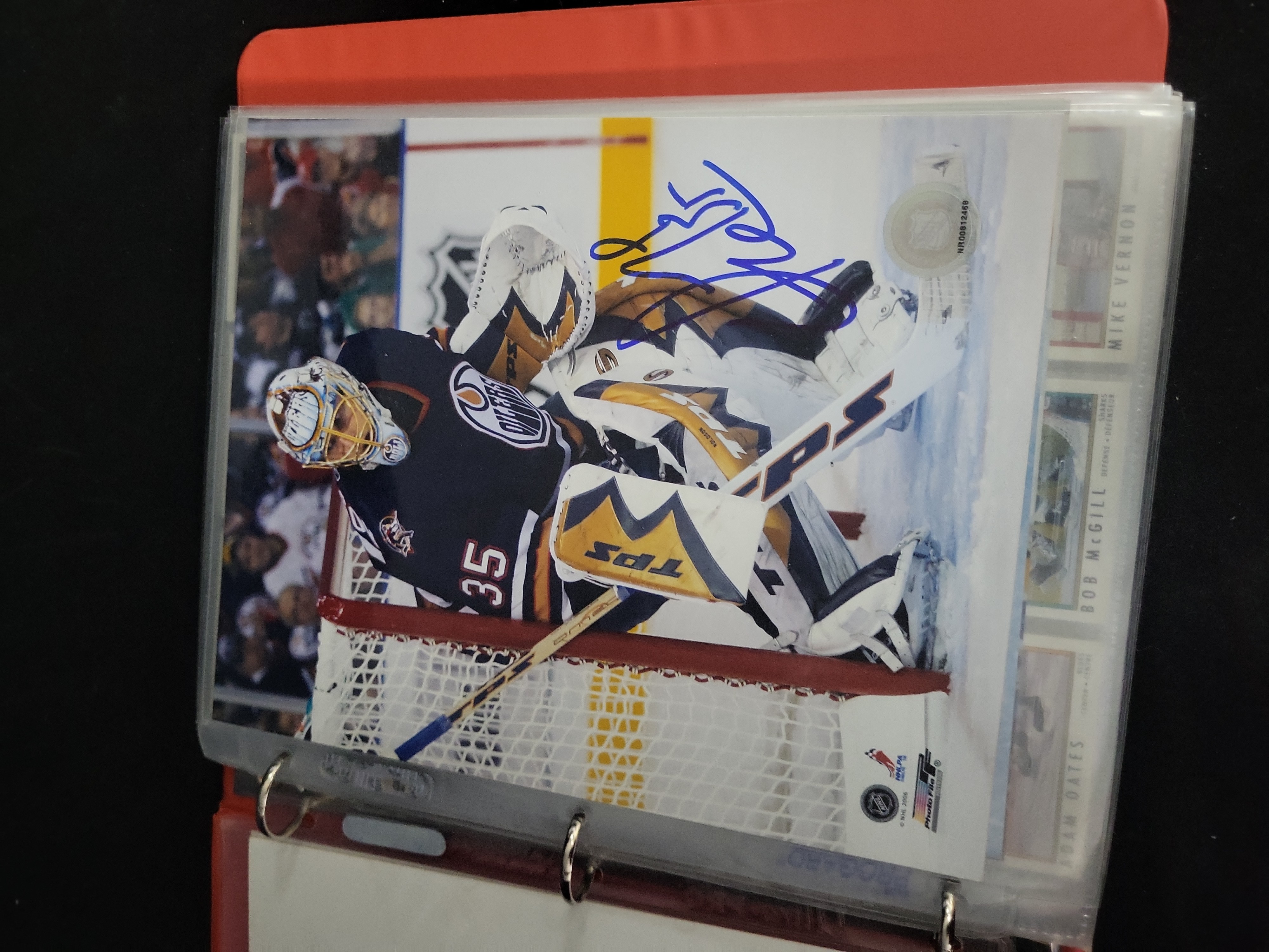 The autographed photographs are in excellent condition with bold signatures in black and blue felt-tip marker. One Tommy Salo photograph is officially authenticated with an NHL hologram, while the remaining signatures are unauthenticated. The hockey cards are described as being in mint condition, appearing well-preserved with sharp corners and vibrant colors through the protective sleeves. The red binder shows standard signs of handling but remains in good functional condition.