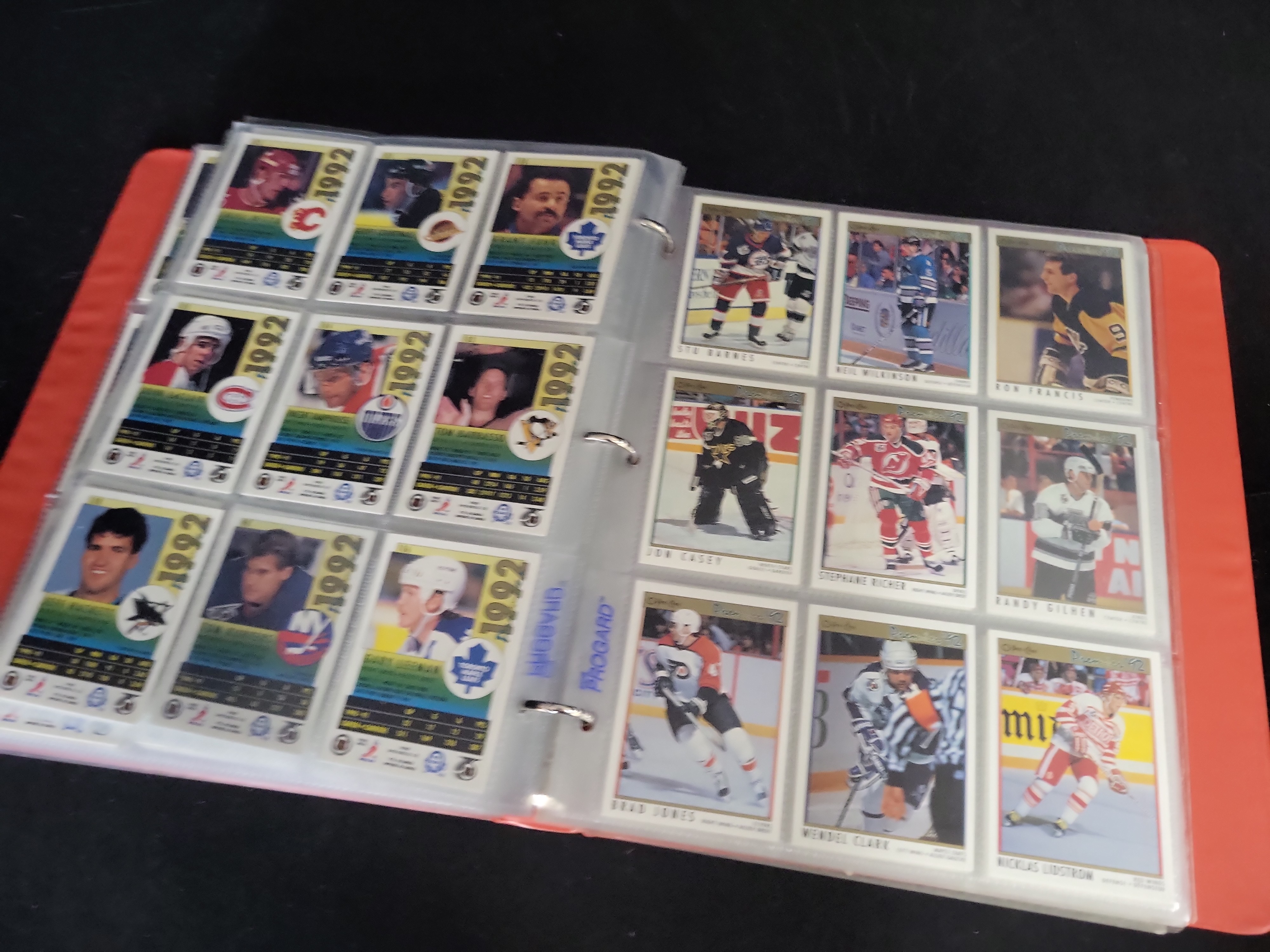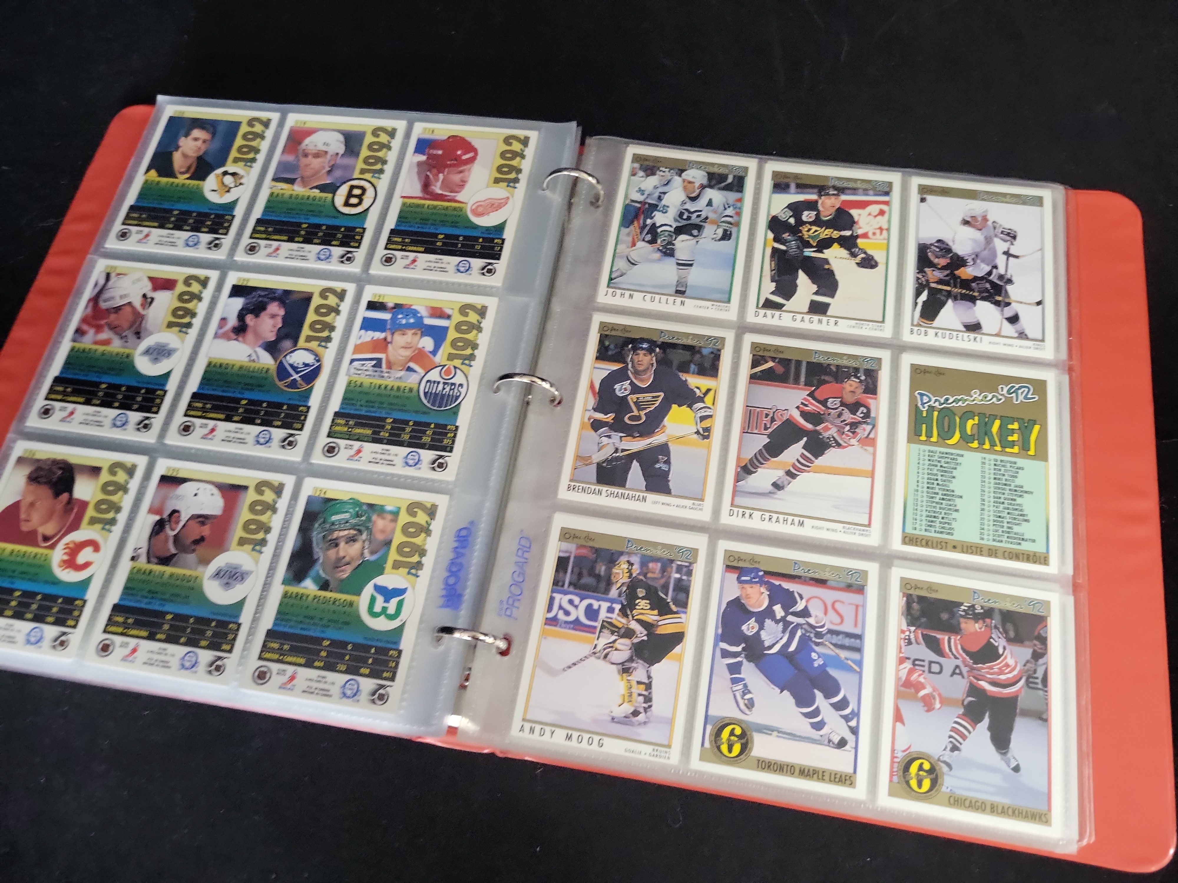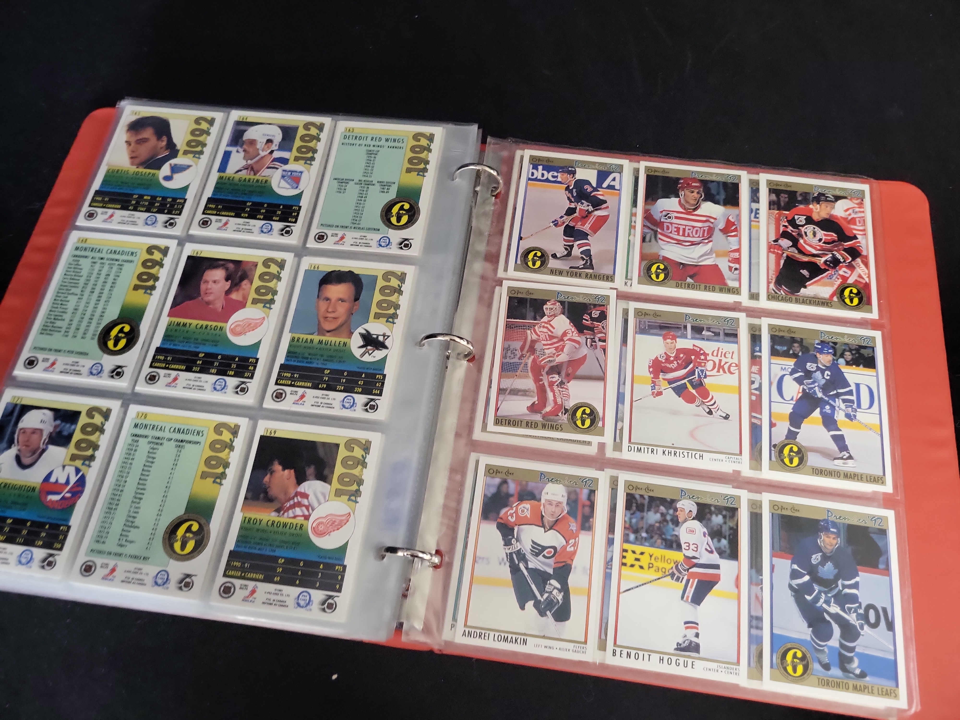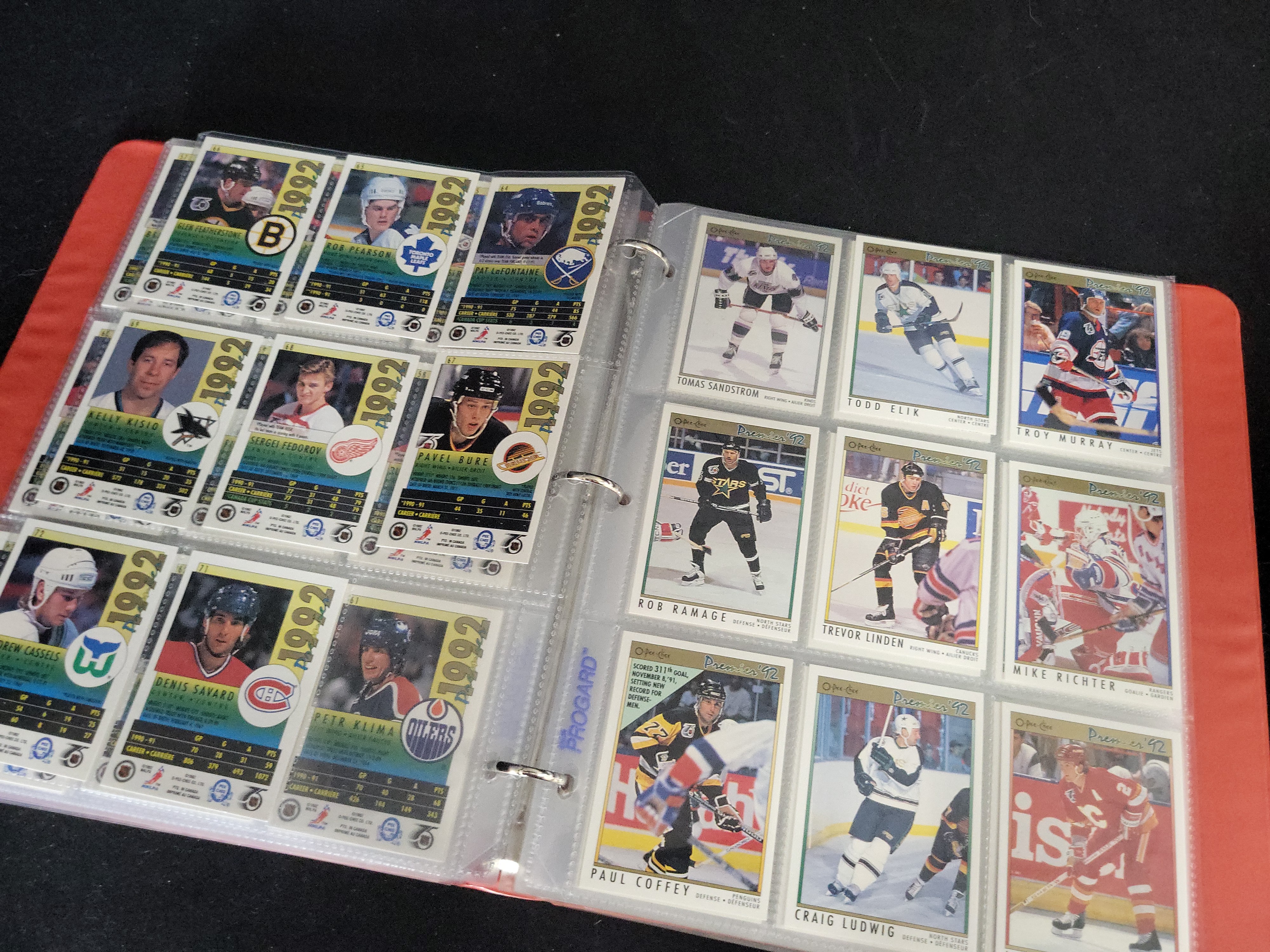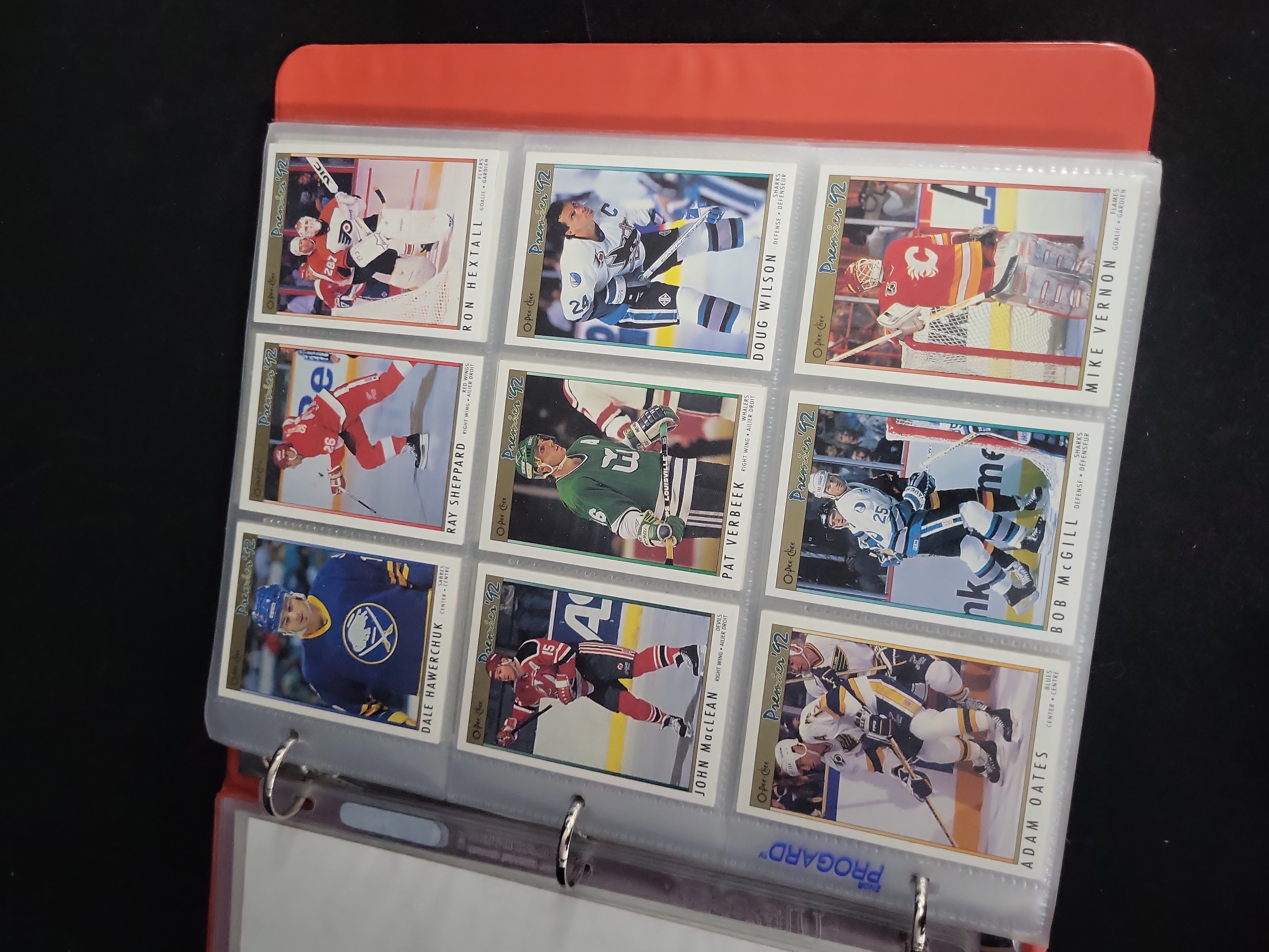 This professional collection of hockey memorabilia features a selection of autographed Edmonton Oilers photographs and a substantial set of early 1990s hockey cards. The lot includes five signed 8 by 10 inch action photographs primarily featuring Oilers players from the late 1990s to early 2000s. Included are two photographs of goaltender Tommy Salo, one in a navy home jersey featuring an official NHL hologram sticker NR00812468 and one in a white road jersey inscribed Best Regards. Also featured are two signed overhead action shots of goaltender Ty Conklin and an overhead action shot of Jarret Stoll wearing number 11, inscribed All the Best Gilbert. The collection further includes a 1991-92 O-Pee-Chee Premier Hockey card set containing over 200 cards. The set is housed in a red three-ring binder with ProGard archival-quality protective sleeves. Key cards in the collection include rookie-era stars Pavel Bure, Sergei Fedorov, and Nicklas Lidstrom, as well as Hall of Famers and stars such as Paul Coffey, Adam Oates, Ron Francis, Mike Richter, Dale Hawerchuk, Ron Hextall, Mike Vernon, and Brendan Shanahan.