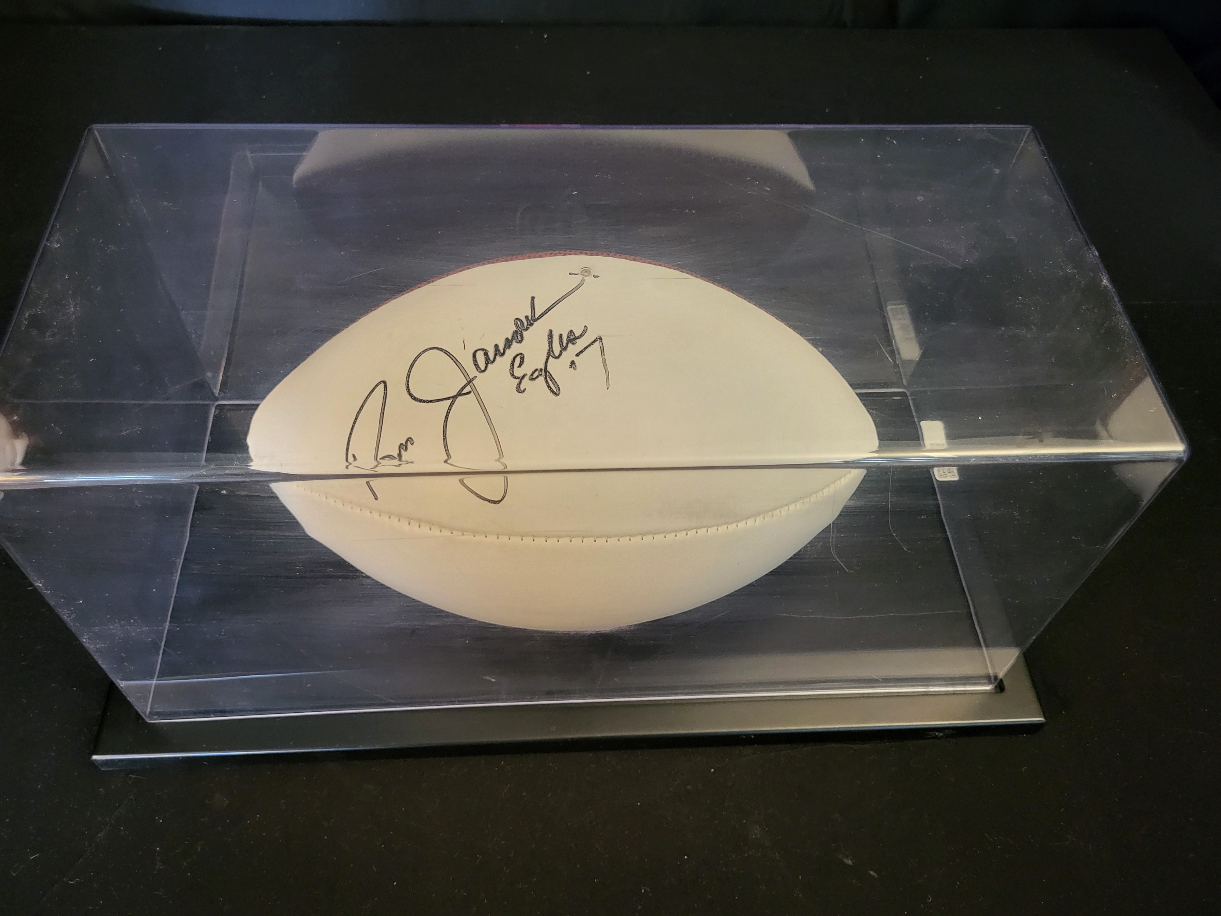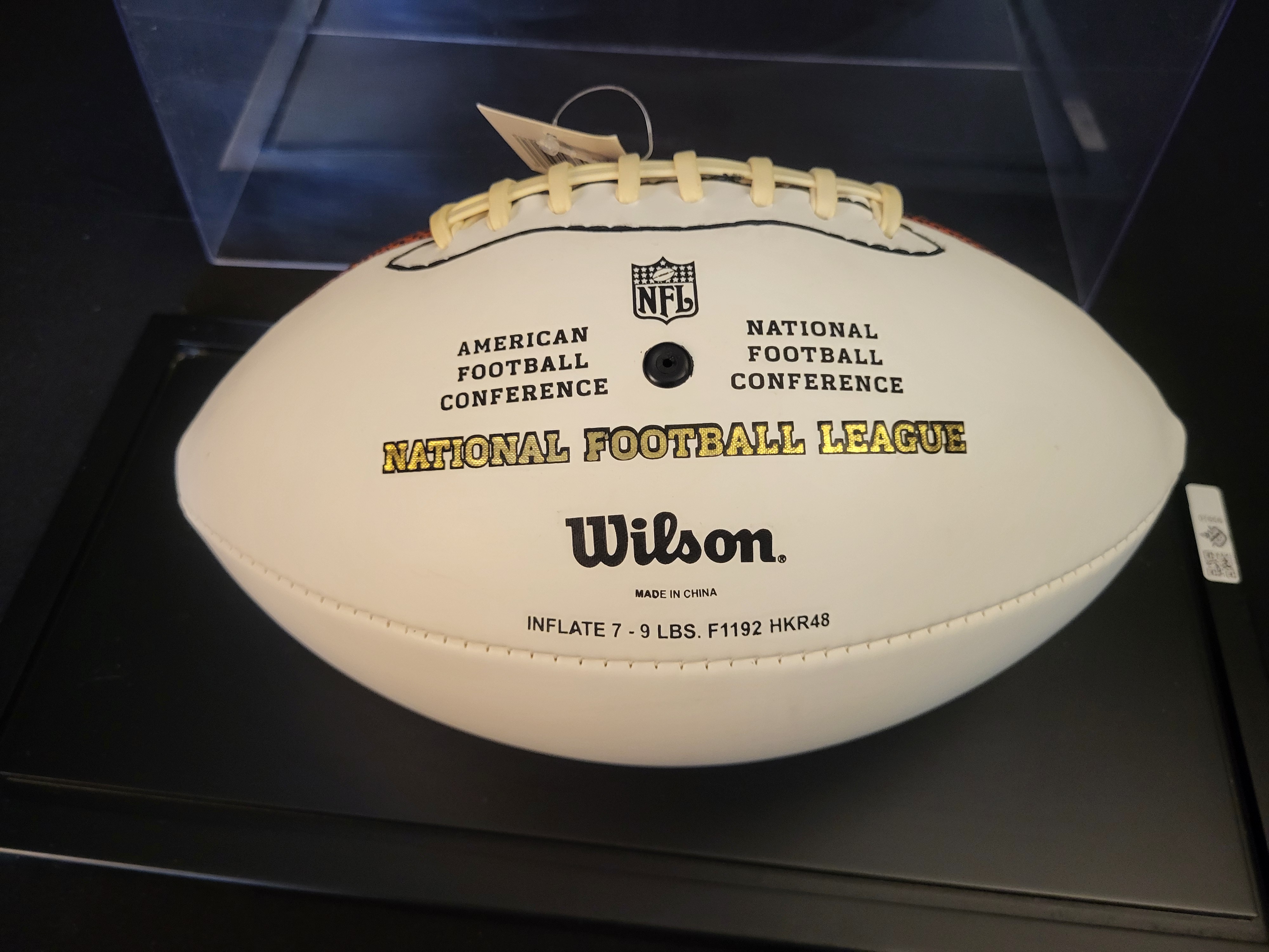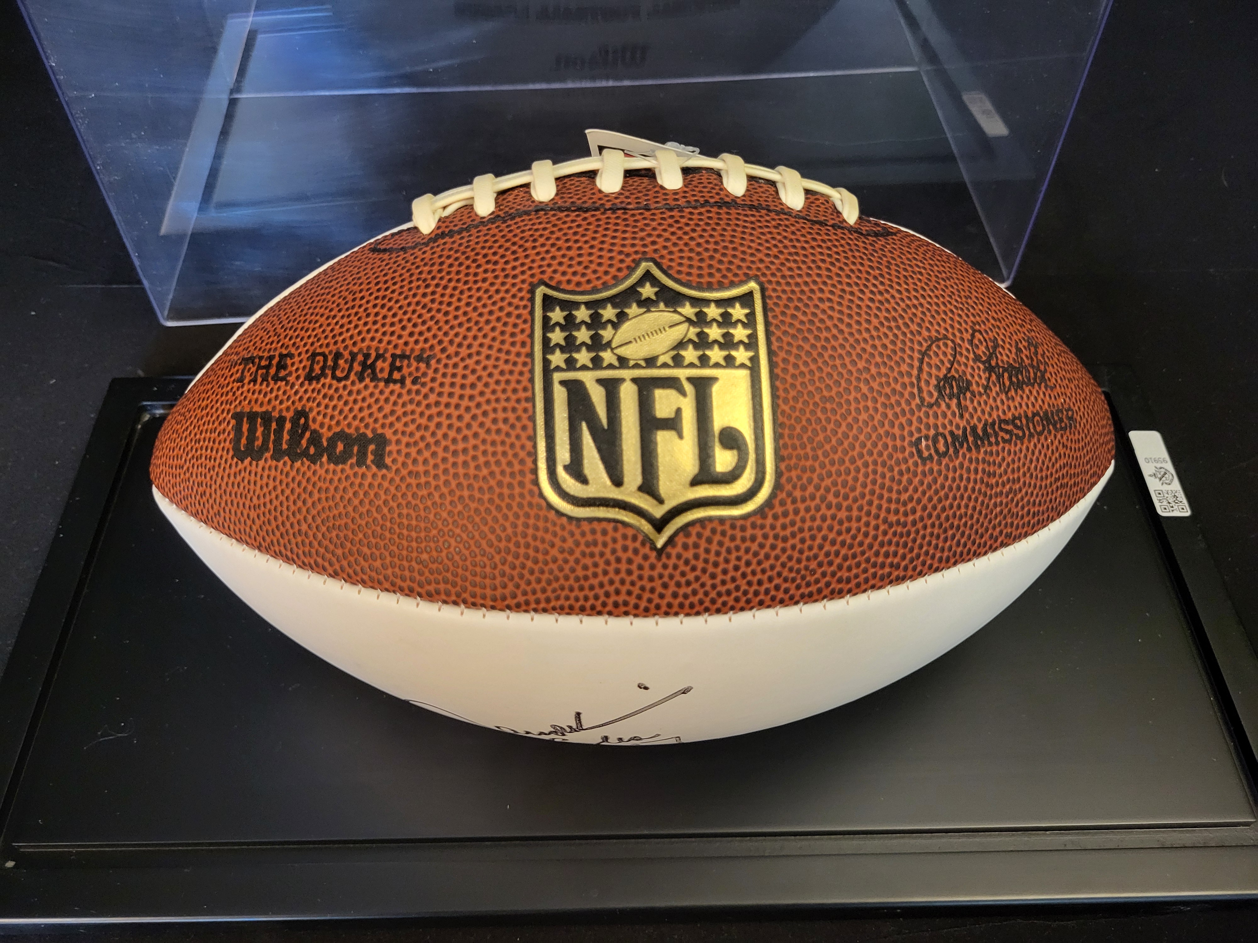 The item is in excellent collectible condition. The hand-signed autograph is bold and clearly legible. The football and display case show no significant signs of wear or damage.