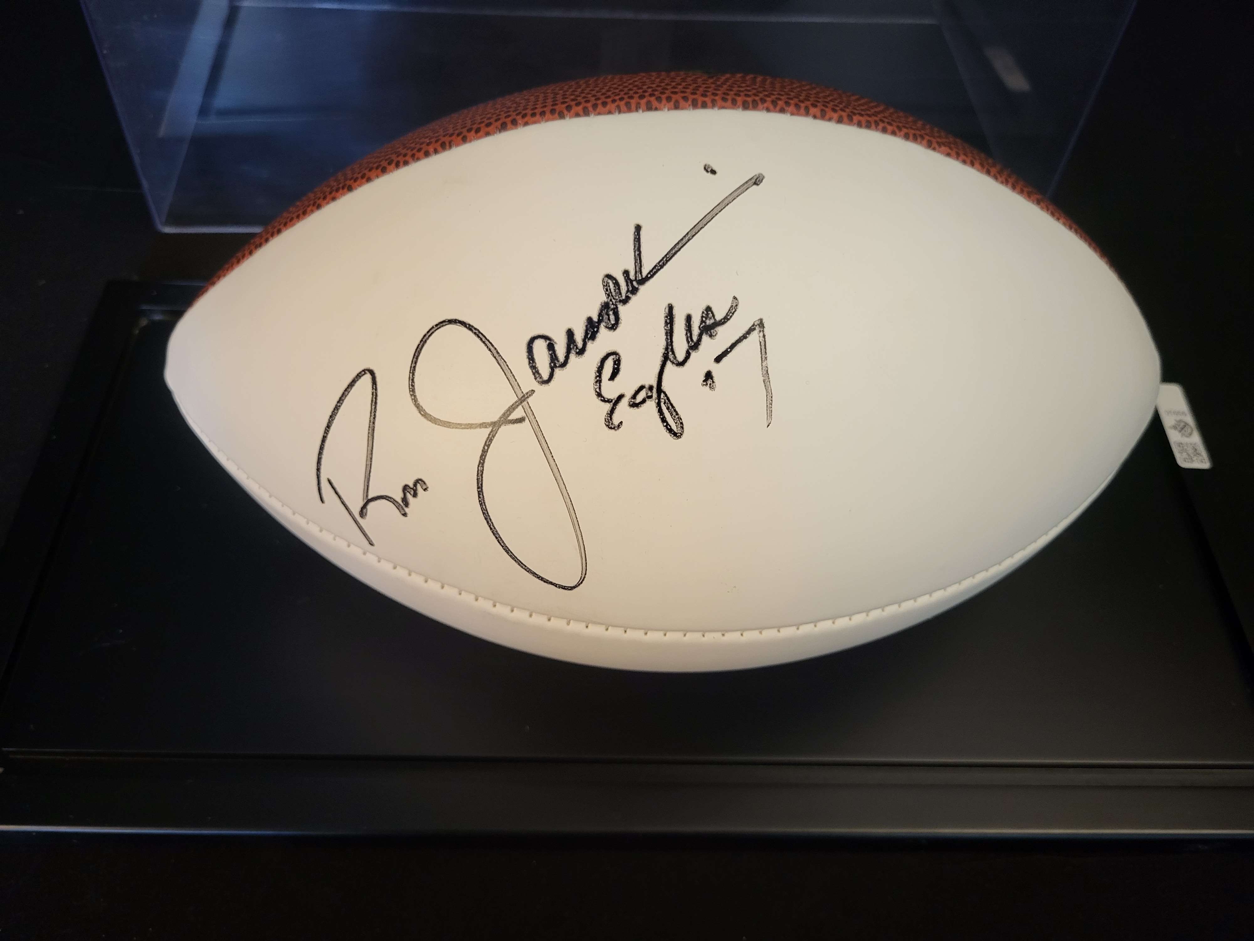 BID PER WHAT YOU SEE IN THE PHOTO, NOT THE AI GENERATED TITLES AND DESCRIPTIONS! Ron Jaworski Signed Wilson The Duke NFL White Panel Football in Display Case