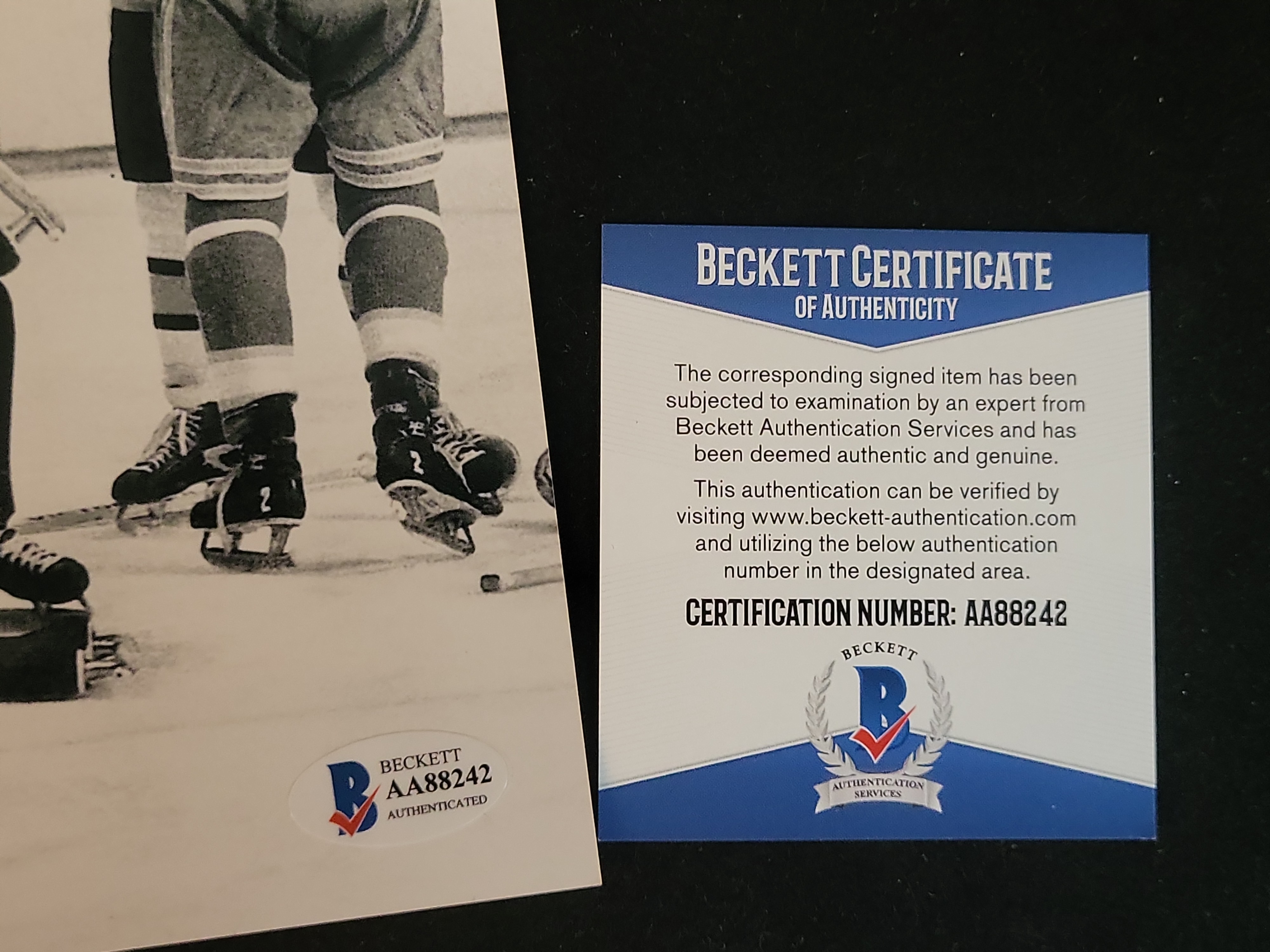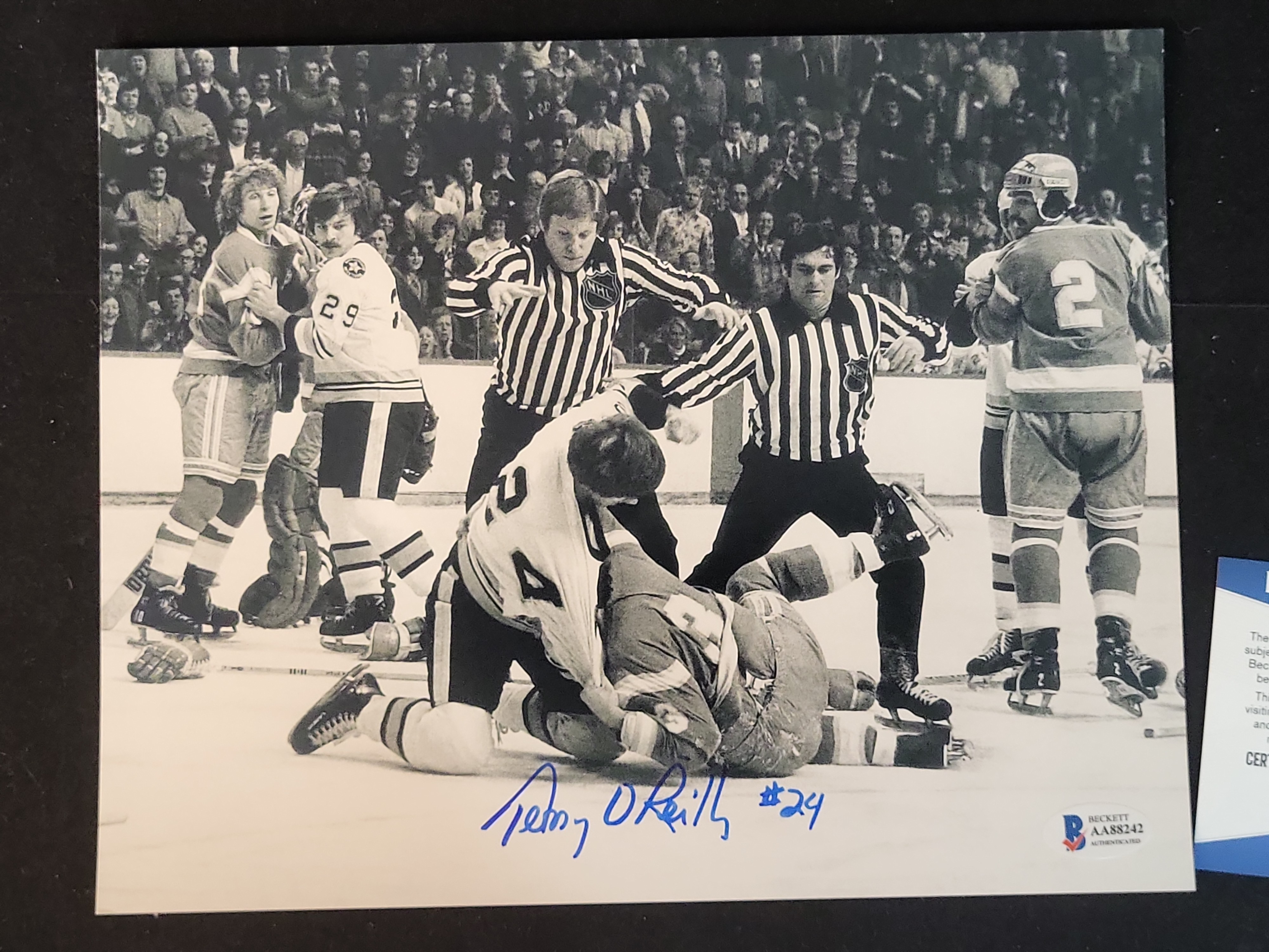 This professionally cataloged autographed action photograph features Boston Bruins legend Terry O’Reilly, a cornerstone of the Big Bad Bruins era. The black-and-white image captures O’Reilly, famously known as Taz, in a quintessential on-ice altercation against a Philadelphia Flyers opponent, perfectly representing the Lunch Pail A.C. identity of the 1970s and 1980s. The photograph is hand-signed by Terry O’Reilly in blue felt-tip marker and includes his jersey number inscription, number 24. The item is fully authenticated by Beckett Authentication Services (BAS) and features a tamper-evident Beckett hologram sticker with certification number AA88242 in the lower right corner. A matching Beckett Certificate of Authenticity card is included with the lot.