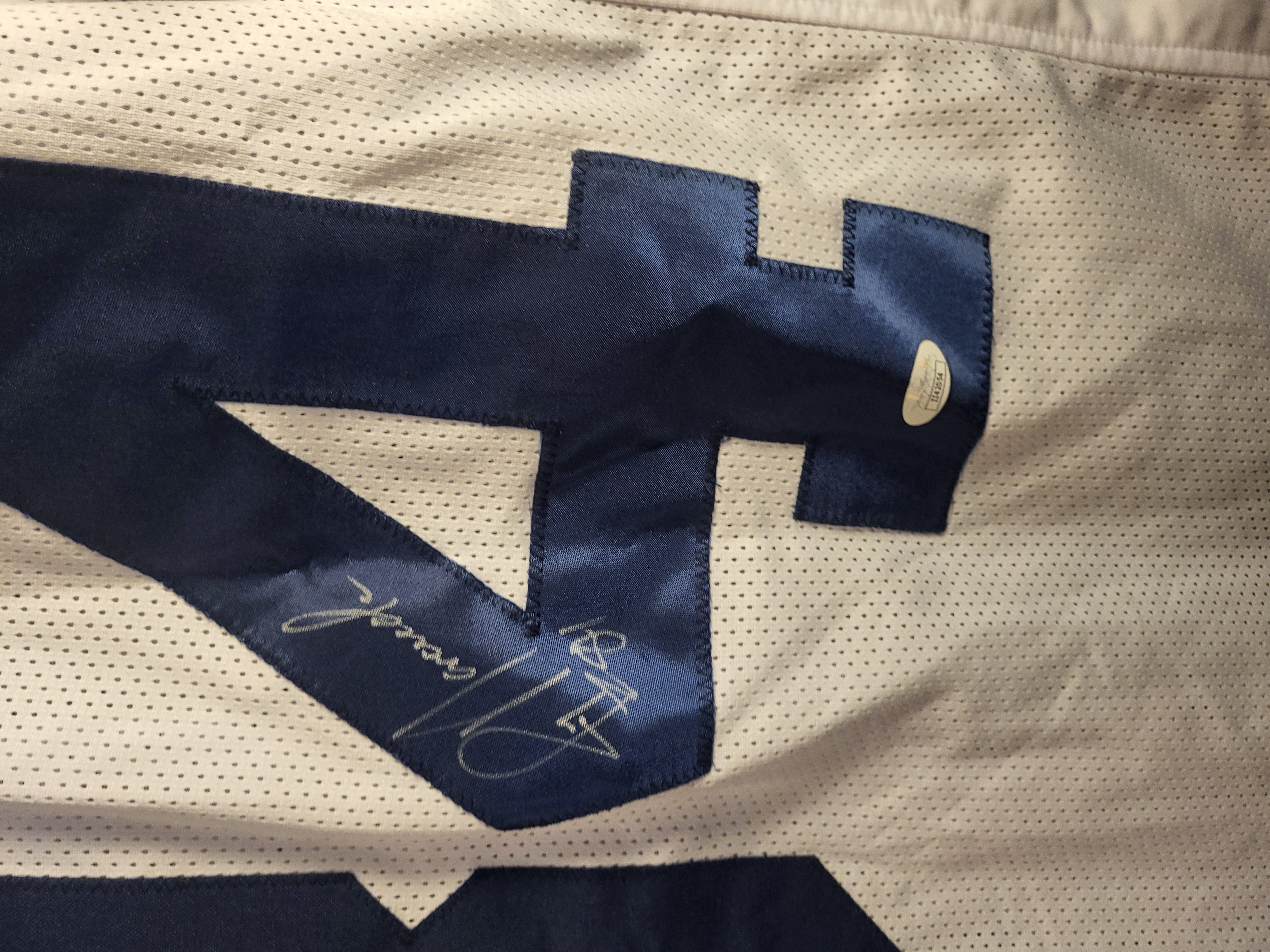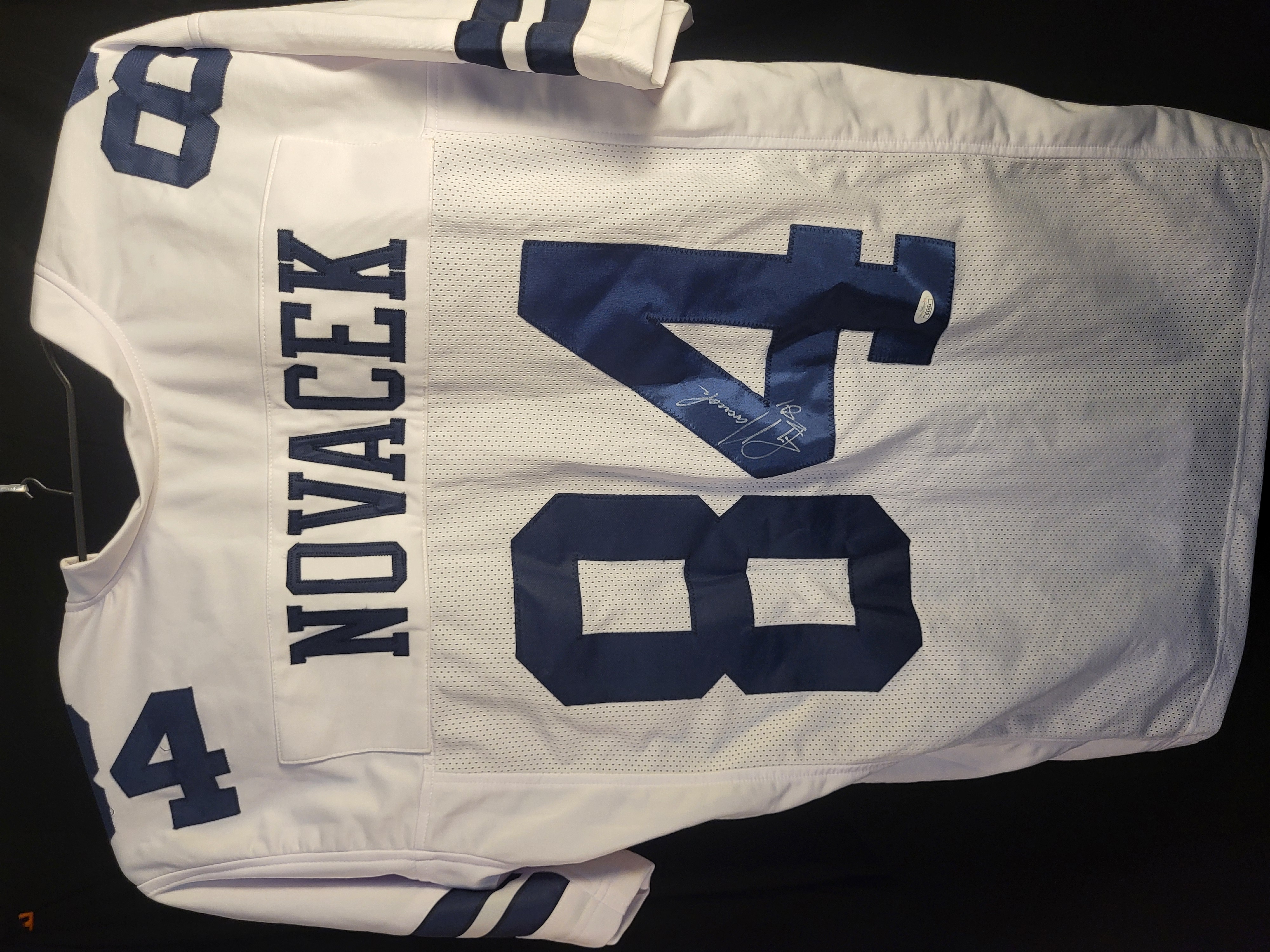 An autographed football jersey in the style of the Dallas Cowboys featuring the name NOVACEK and the number 84. The garment is constructed of white mesh with blue tackle twill lettering and numbering. A signature by Jay Novacek is present on the reverse digit 4 rendered in silver-toned ink. This lot is accompanied by a James Spence Authentication JSA Basic Certification card and a corresponding authentication sticker affixed to the jersey both bearing certification number II42054.