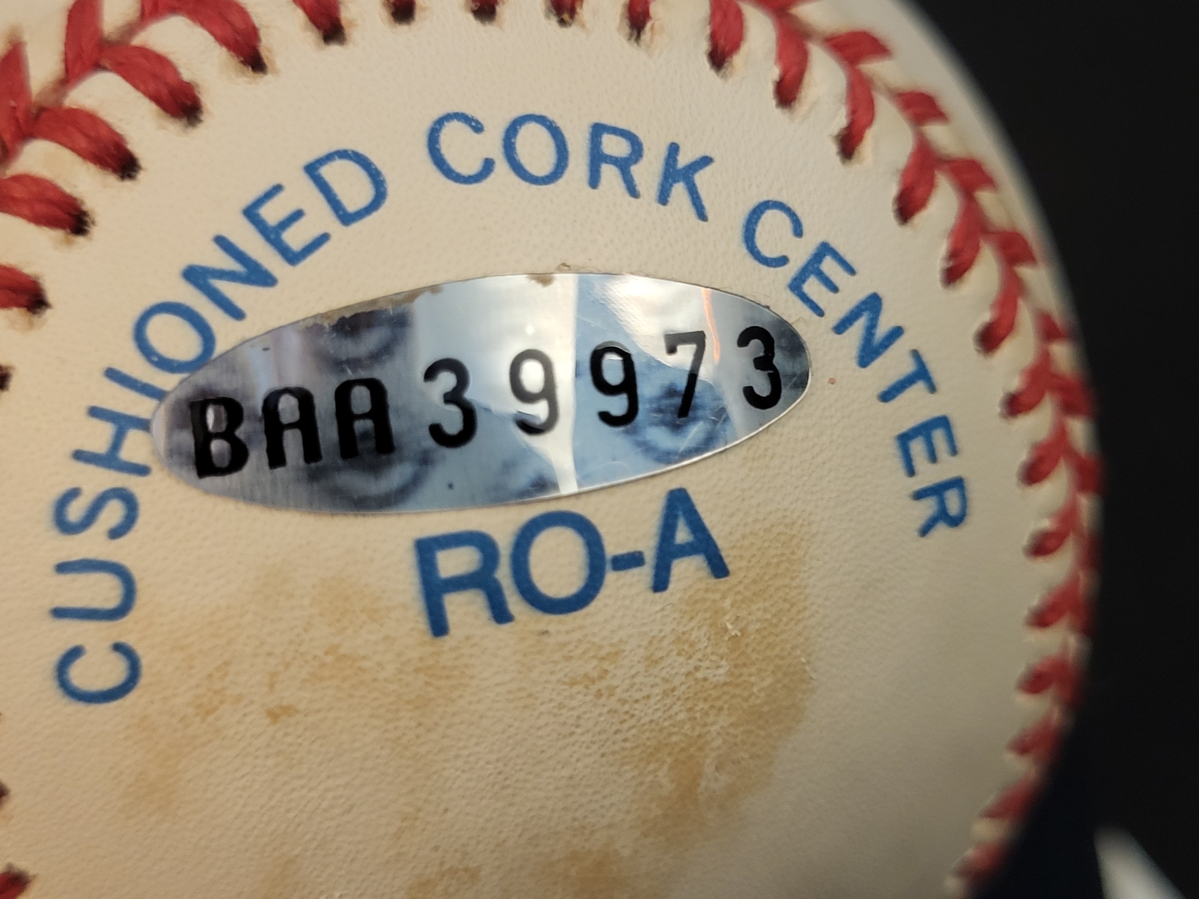 The baseball shows visible surface toning and spotting consistent with age. The acrylic display case and paper certificate appear to be in good condition.