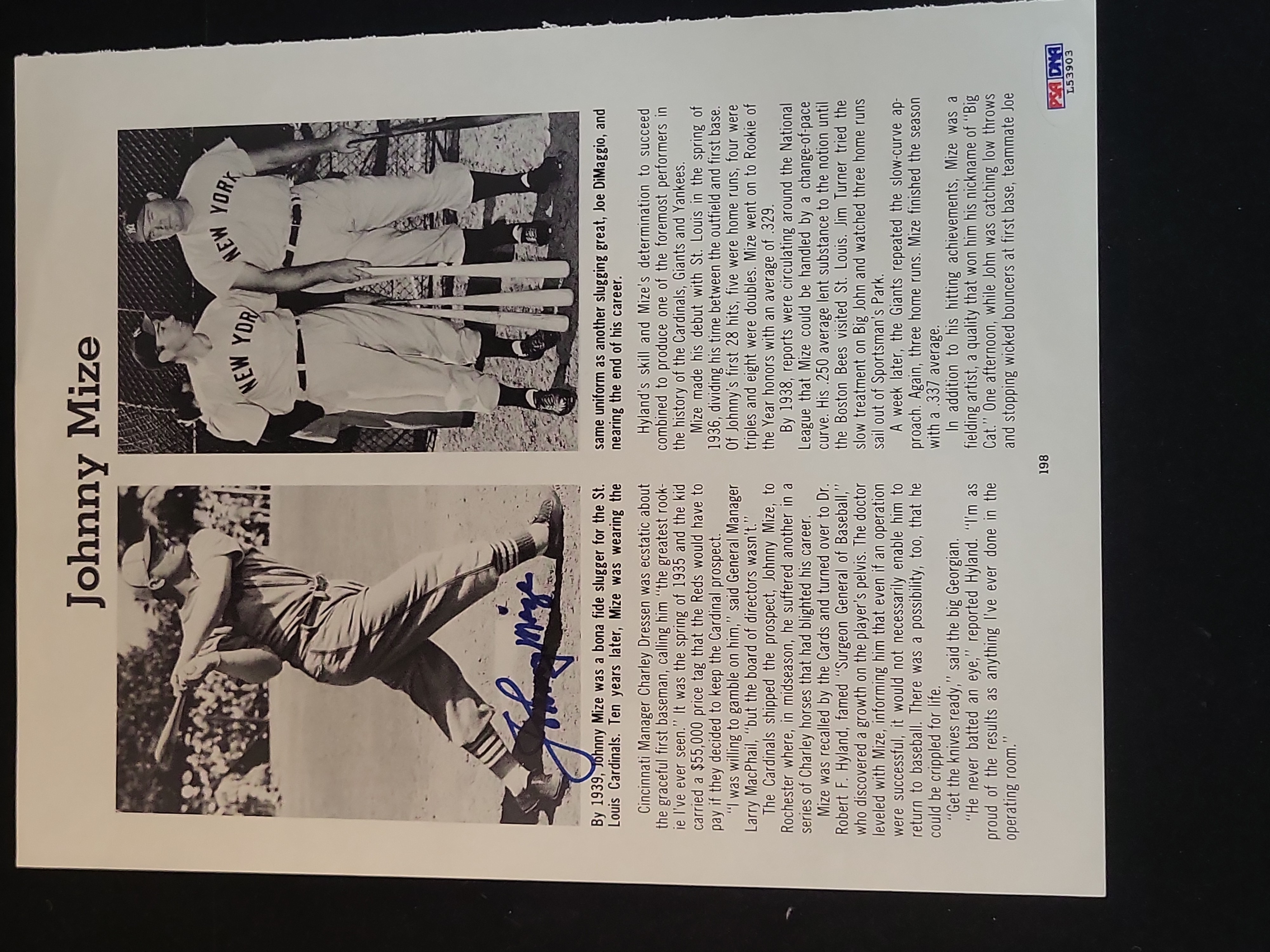 This auction features an autographed printed page from a biographical publication signed by Major League Baseball Hall of Fame first baseman Johnny Mize. Mize, nicknamed The Big Cat, played for the St. Louis Cardinals, New York Giants, and New York Yankees, earning ten All-Star selections and five World Series titles. The page, identified as page 198, includes detailed text regarding his career milestones and two black-and-white images. The top image shows Mize with Joe DiMaggio in Yankees uniforms, while the lower image captures Mize in a Cardinals uniform mid-swing. The signature is placed prominently over the lower action photograph in bold blue felt-tip ink. Authentication is provided by PSA/DNA with a matching numbered sticker L53903 and a corresponding Certificate of Authenticity card.