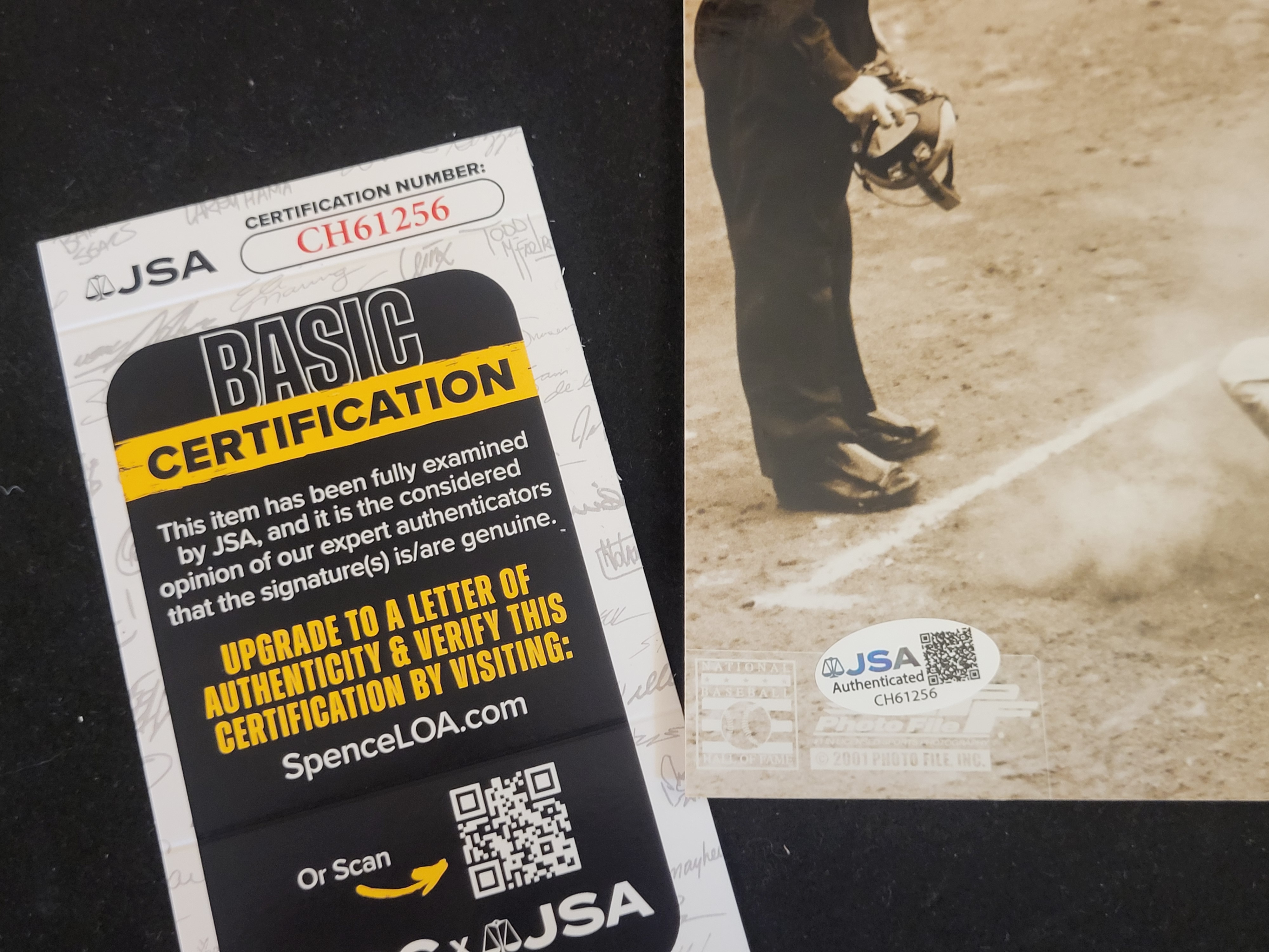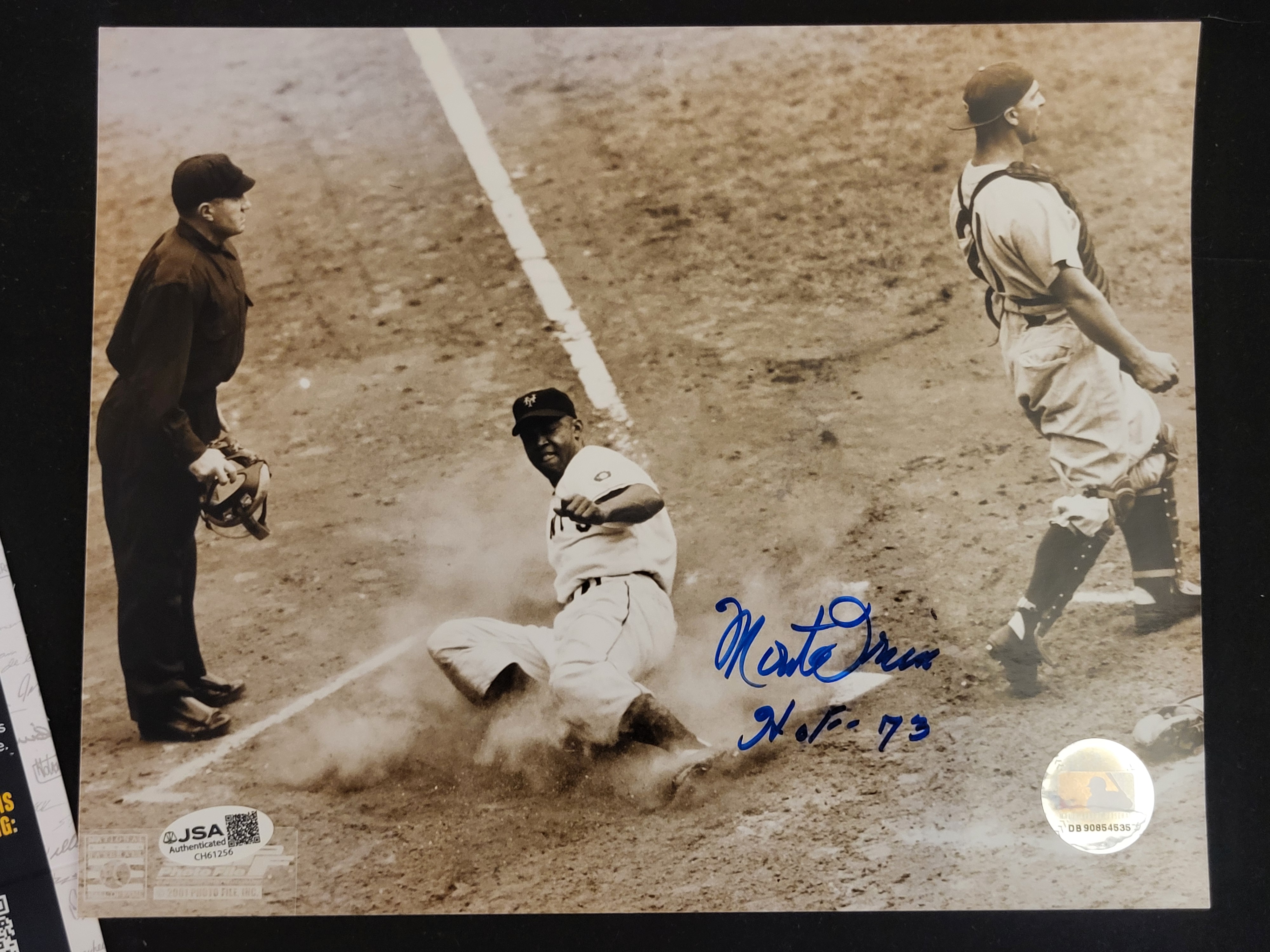 This is a professionally authenticated 8×10 photograph hand-signed by Baseball Hall of Fame outfielder Monte Irvin. The sepia-toned action image captures Irvin in a dynamic slide into home plate for the New York Giants, wearing his team cap as the umpire and opposing catcher look on. The signature is rendered in bold blue felt-tip marker and includes the hand-written inscription H.O.F. 73, commemorating his 1973 induction into the National Baseball Hall of Fame. This item features dual authentication for maximum collector confidence: it is accompanied by a JSA (James Spence Authentication) Basic Certification card with a matching tamper-evident sticker (Certification Number: CH61256) and an official Major League Baseball (MLB) hologram sticker (Serial Number: DB 90854535). The photograph is officially licensed, bearing the Photo File and National Baseball Hall of Fame logos in the bottom margin, dated 2001.