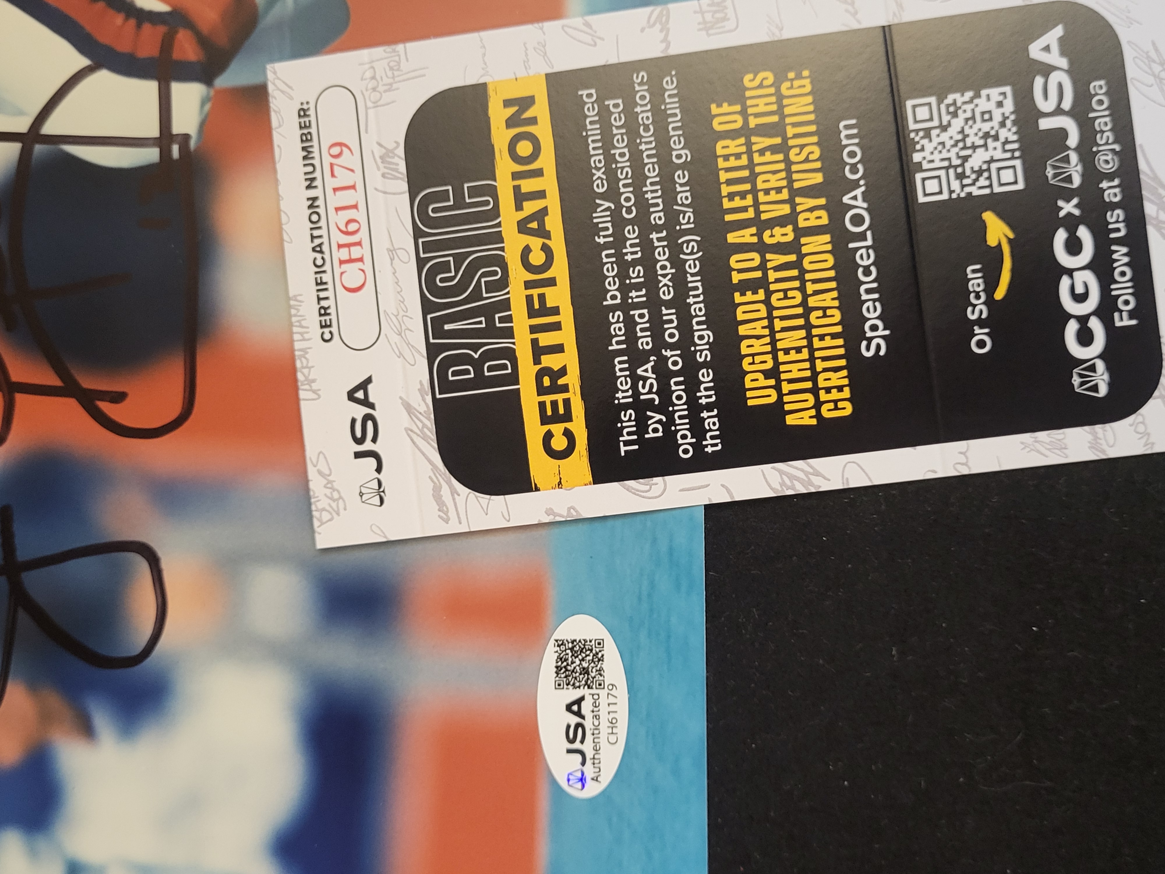 This autographed color photograph features NFL Hall of Fame quarterback Jim Kelly of the Buffalo Bills in an action pose. The image depicts Kelly in his blue team jersey, number 12, holding a Wilson football in a passing stance. The photograph is signed across the center in bold black ink. It is accompanied by a James Spence Authentication (JSA) Basic Certification card and a matching tamper-evident hologram sticker located in the lower right corner, bearing certification number CH61179. The photograph features a glossy finish.