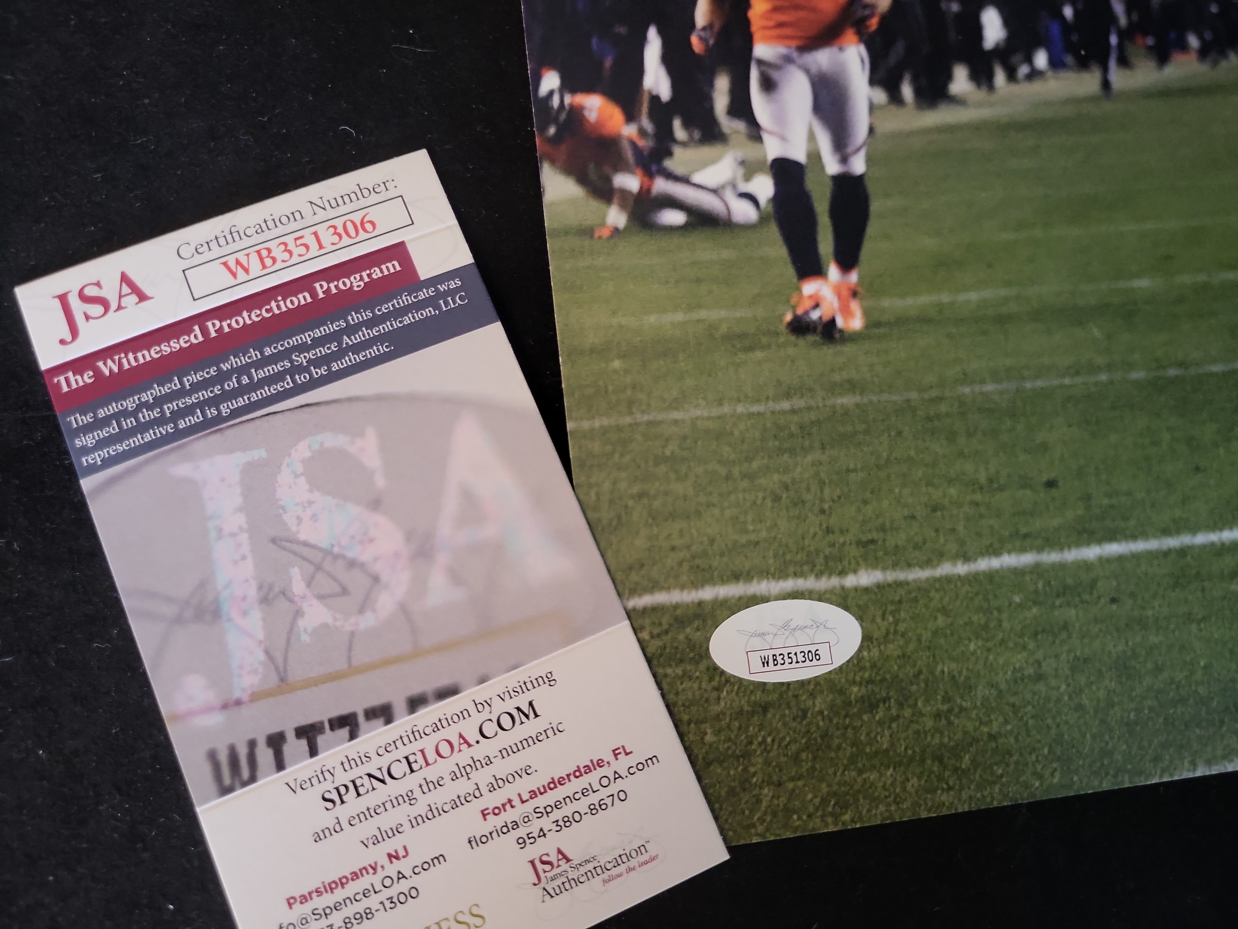 This professional 8×10 action photograph features the hand-signed signature of Baltimore Ravens wide receiver Jacoby Jones. The image captures the iconic Mile High Miracle touchdown catch from the 2012 AFC Divisional playoff game against the Denver Broncos. Jones is depicted in his white Ravens jersey, number 12, celebrating as he secures the 70-yard reception that forced overtime and propelled the team toward their Super Bowl XLVII championship. The signature is rendered in blue ink and has been fully authenticated by James Spence Authentication (JSA) through their Witnessed Protection Program. This designation confirms that a JSA representative was present at the time of signing. The photograph includes a tamper-evident JSA certification sticker (WB351306) in the lower-left corner and is accompanied by a matching JSA Certificate of Authenticity card.