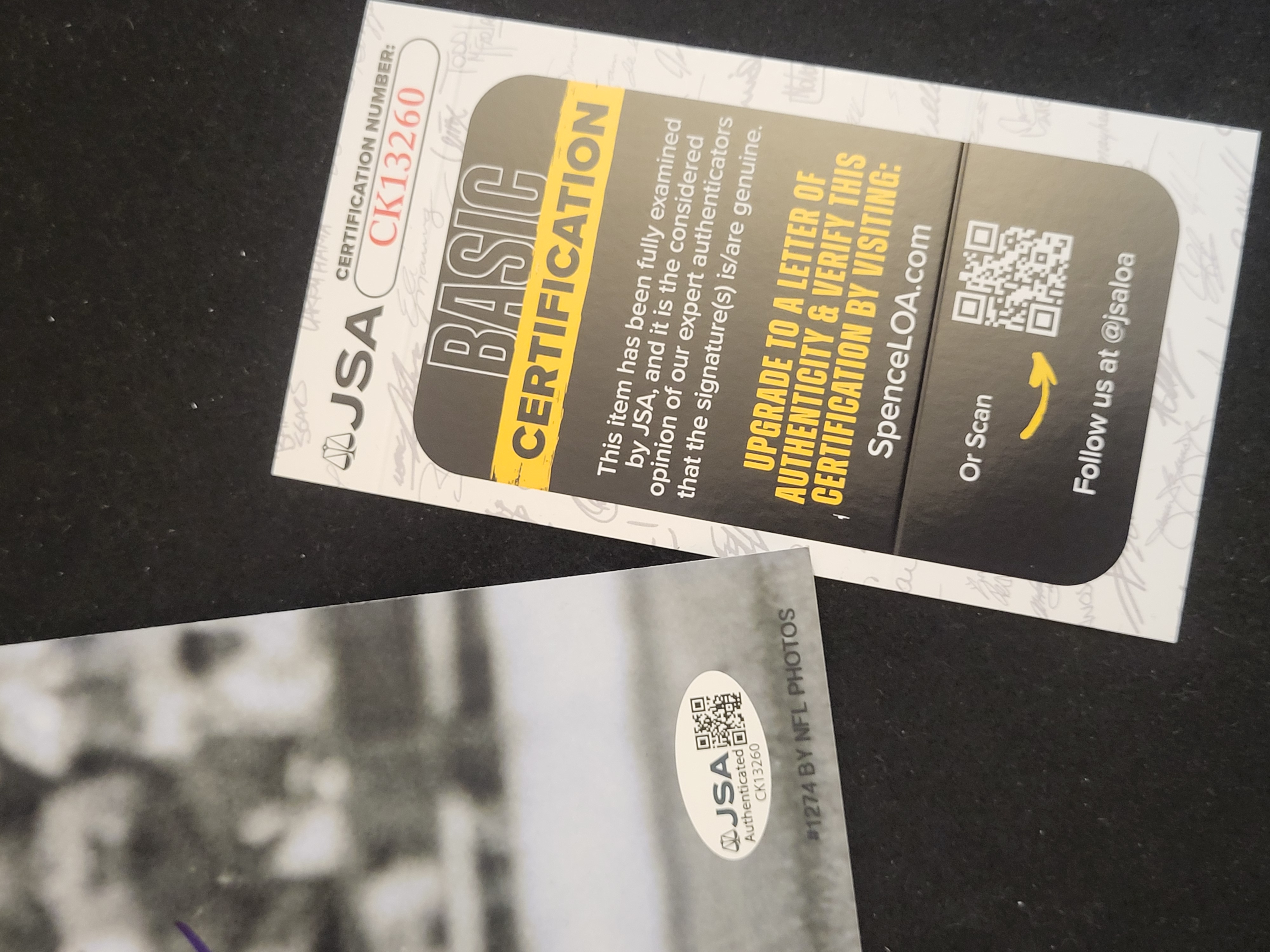The photograph and accompanying certification card are in good condition. There are no visible tears, creases, or significant surface wear to the print. The signature is bold and shows no signs of fading.